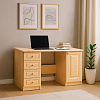 Письменный стол оснащен дверью и тумбой с четырьмя вместительными ящиками .Широкая столешница позволяет вместить не только компьютер но и массу других предметов.Часть тумбы и дверь соединены планкой для дополнительной устойчивости.