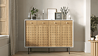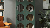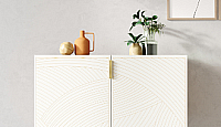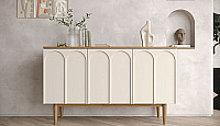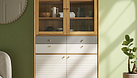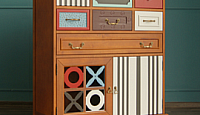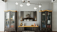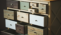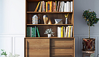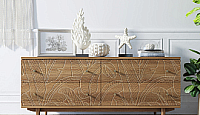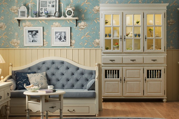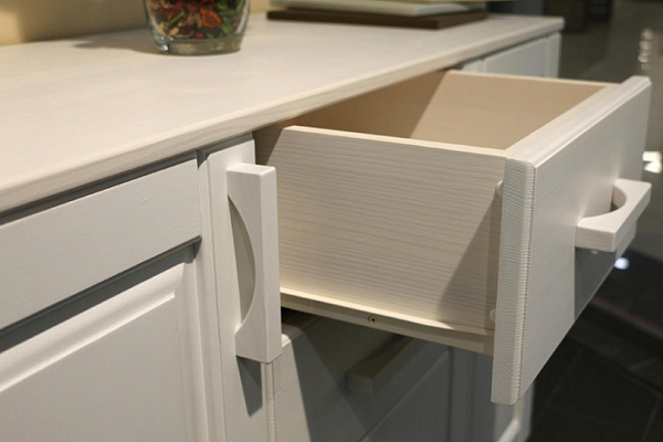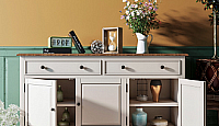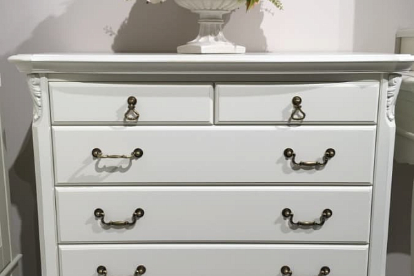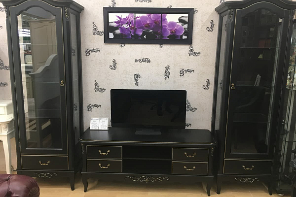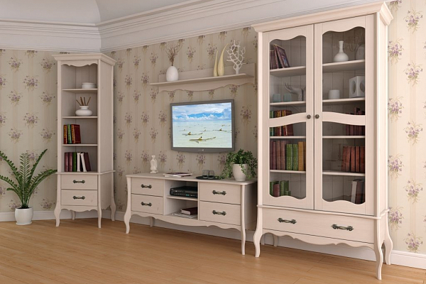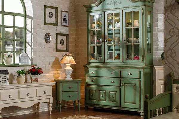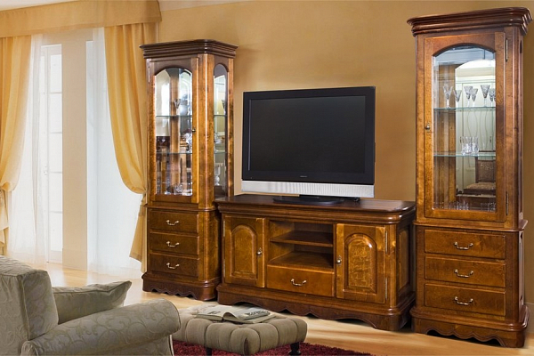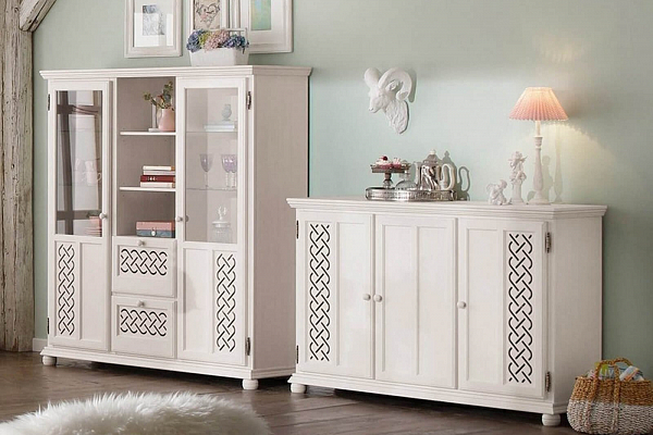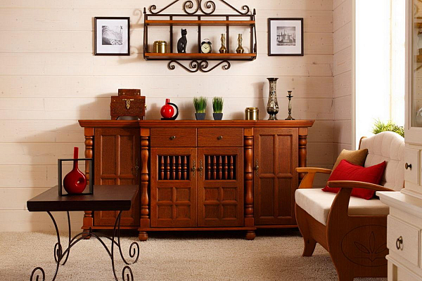 Основным украшением мебели является искусная резьба. Резные декорации встречаются повсюду, образуя сплошной, гармоничный узор. Точные края дверок гармонируют с отделкой прилегающих стенок, полки и панели представляют собой настоящие произведения искусства. Используются такие декоративные элементы, как небольшие колонны.