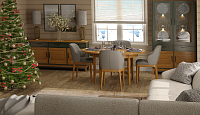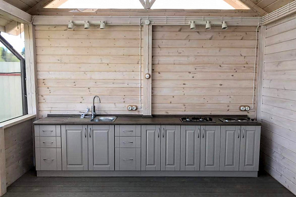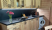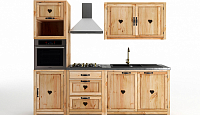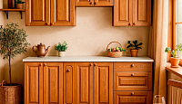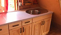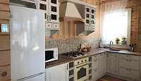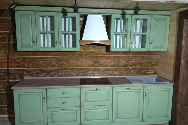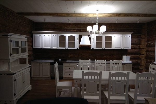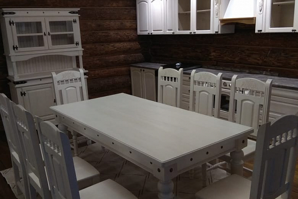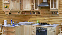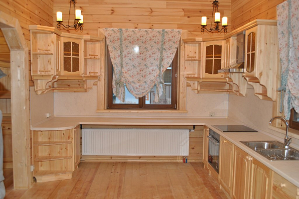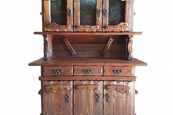 Также можно купить целые кухонные гарнитуры, оформленные в стиле русской древности. Лакировка в основном темная, хотя некоторые вещи и детали осветлены для придания большего сходства с необработанным деревом.