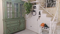 К деревянным предметам прилагаются изделия из металла: старинная фурнитуры, люстры. Поверхность металла подвергается обработке по технологиям искусственного старения или соответствующим образом окрашена.