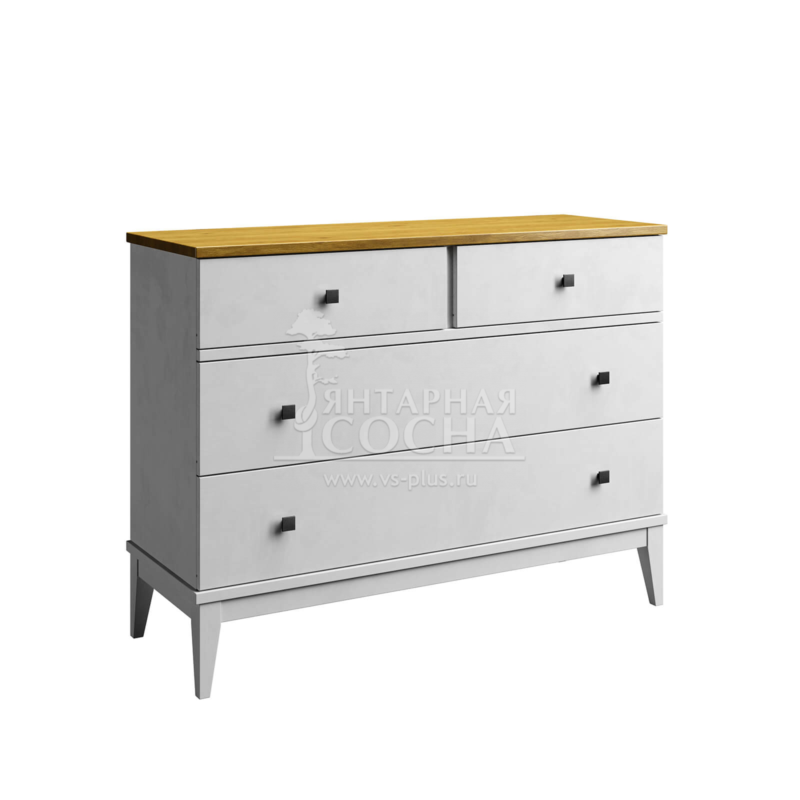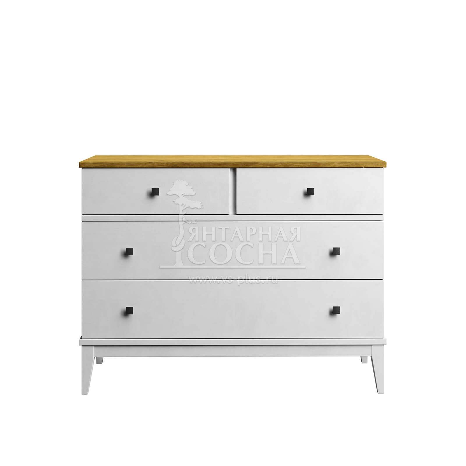 Комод оснащен двумя широкими и и двумя узкими ящиками. Высокие ножки обеспечивают оптимальный доступ при уборке.