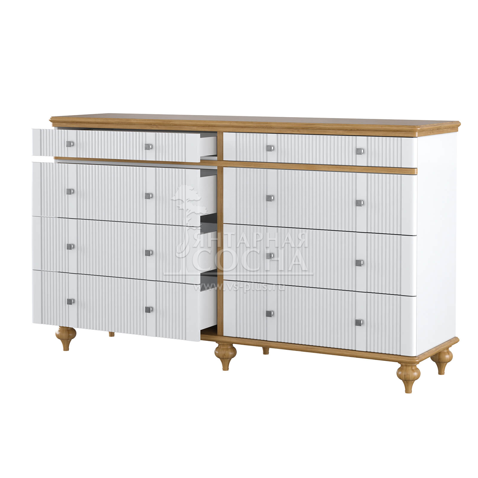 Комод оснащен восемью ящиками. Фурнитура на ящиках с доводчиками. Высокие ножки обеспечивают оптимальный доступ при уборке.