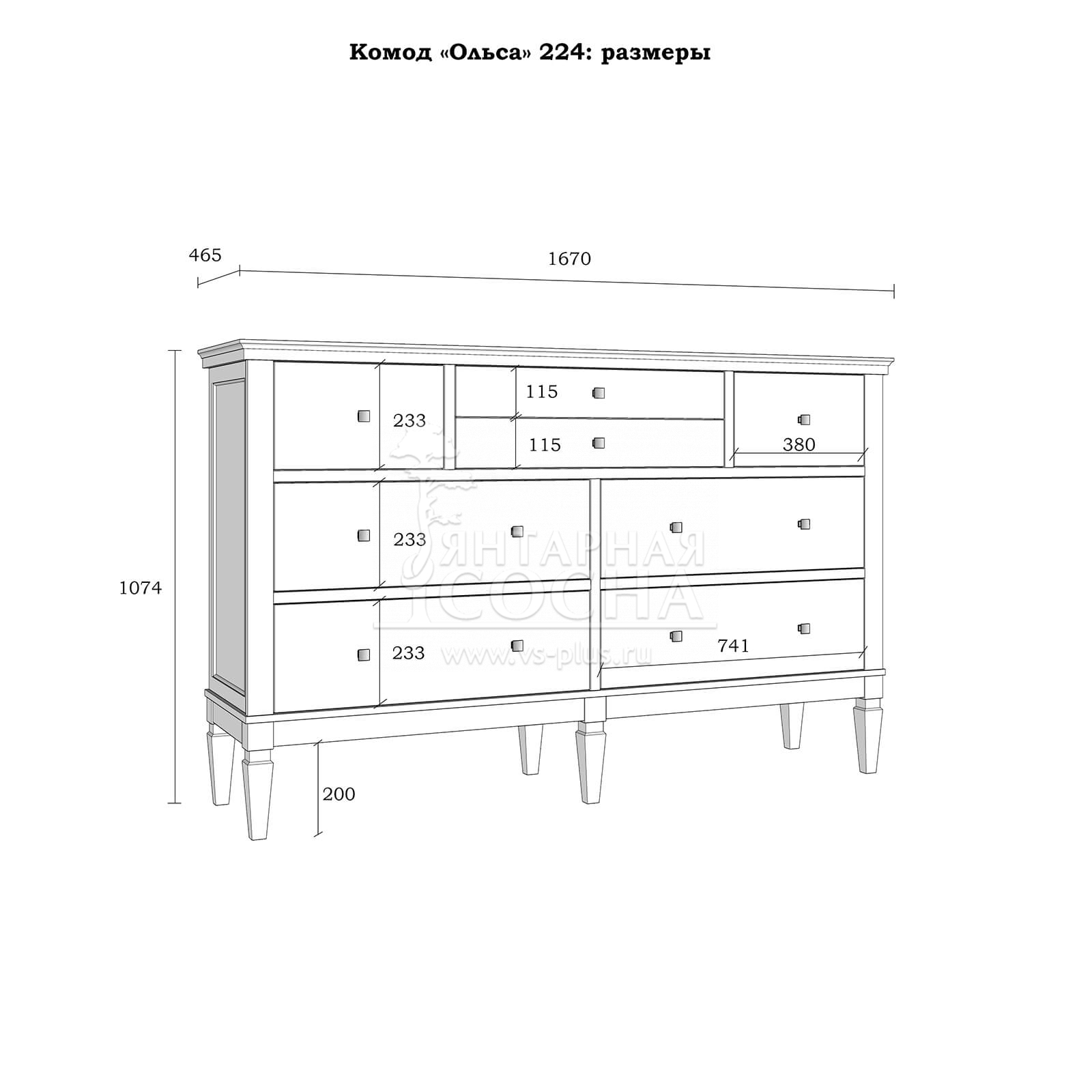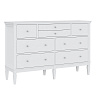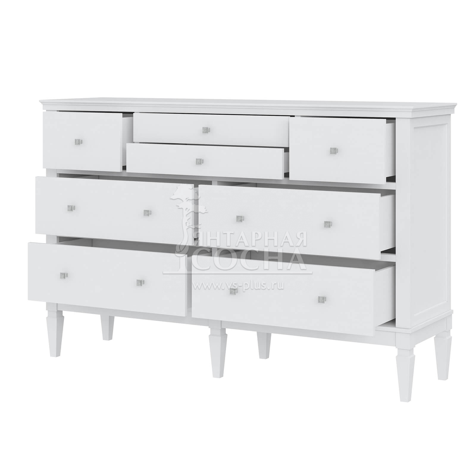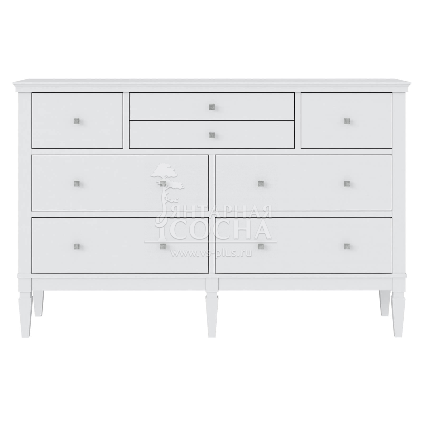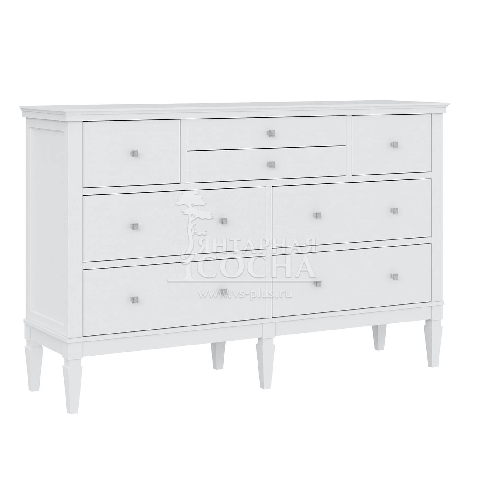 Комод оснащен четырьмя большими и четырьмя маленькими ящиками. Фурнитура на ящиках с доводчиками. Высокие ножки обеспечивают оптимальный доступ при уборке.