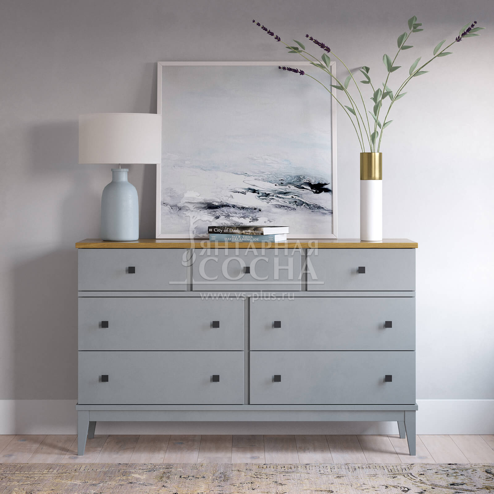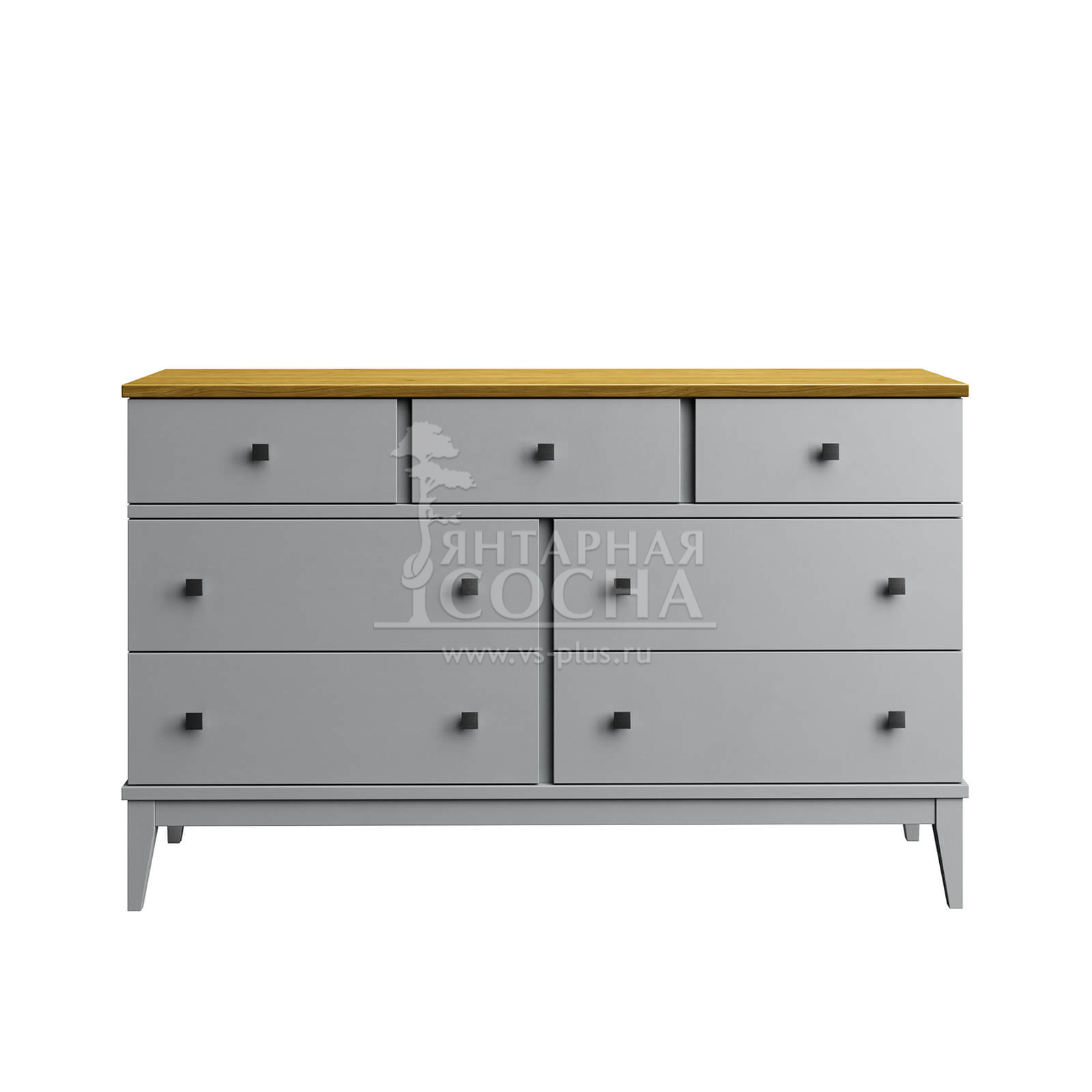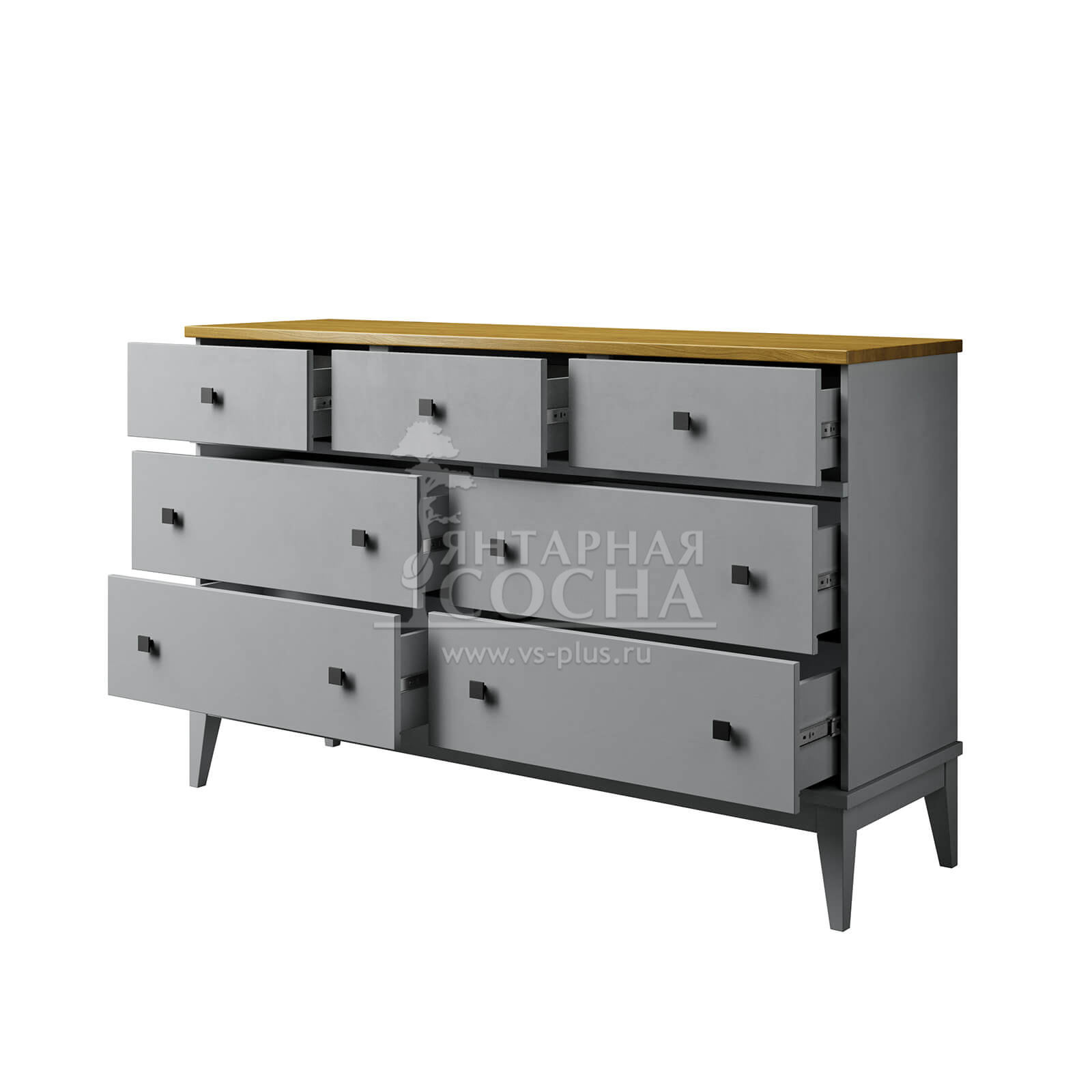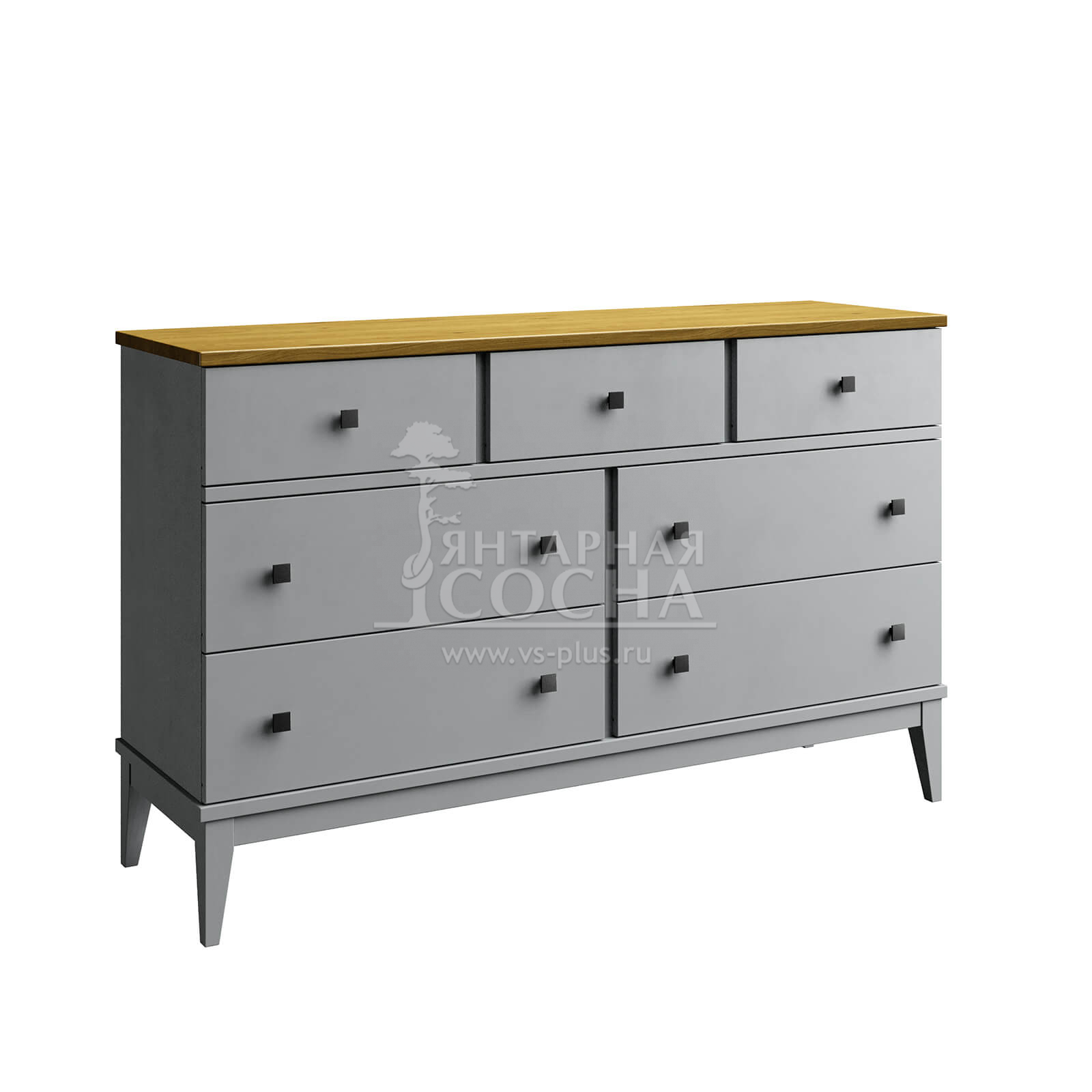 Комод оснащен четырьмя широкими и и тремя узкими ящиками. Высокие ножки обеспечивают оптимальный доступ при уборке.