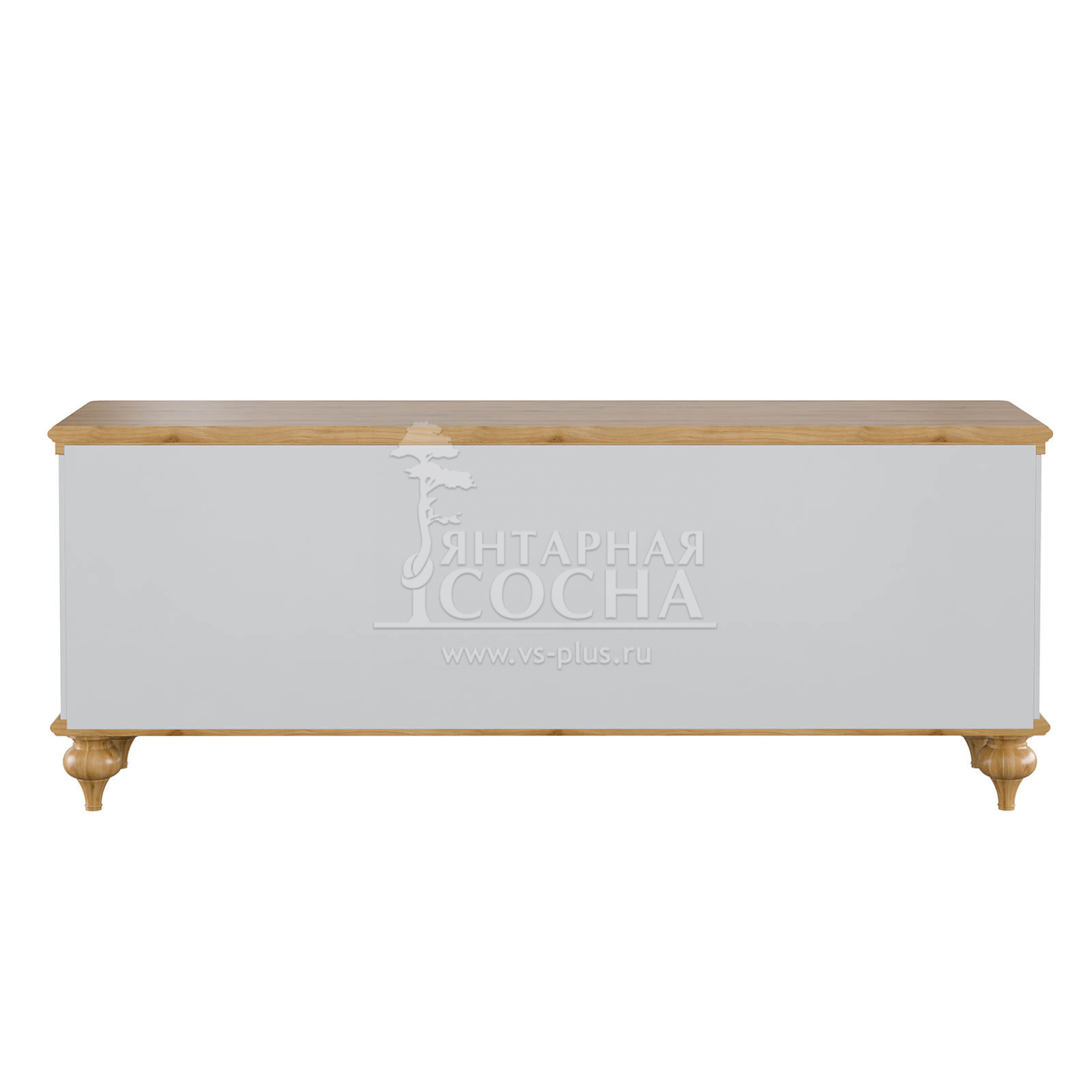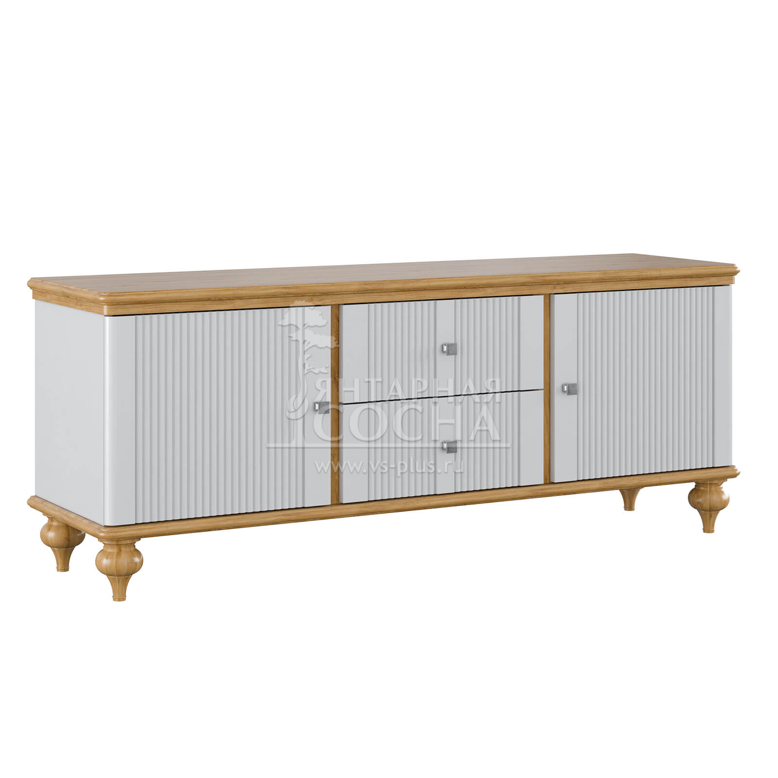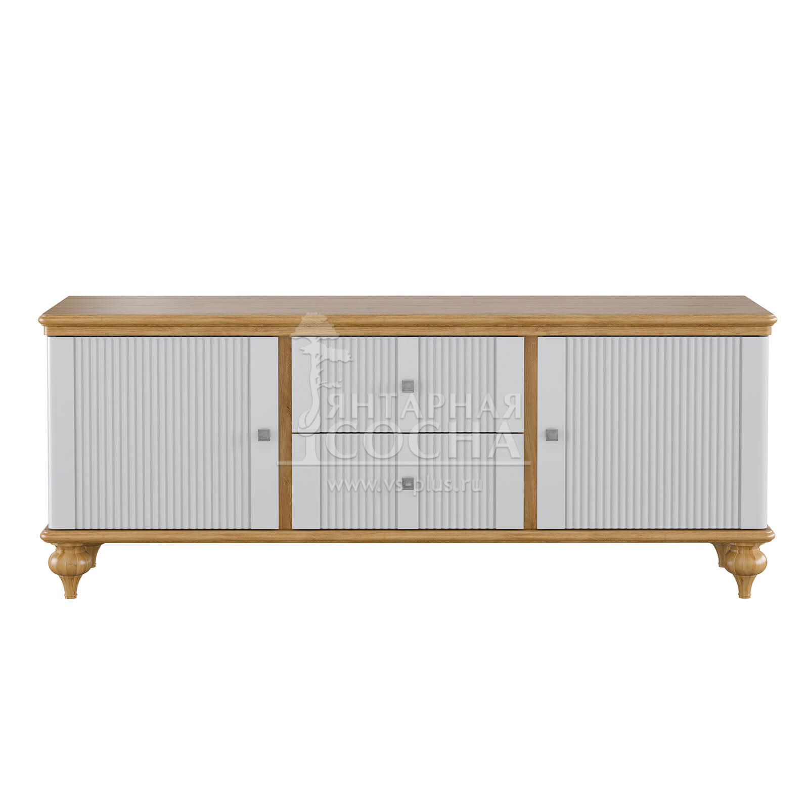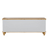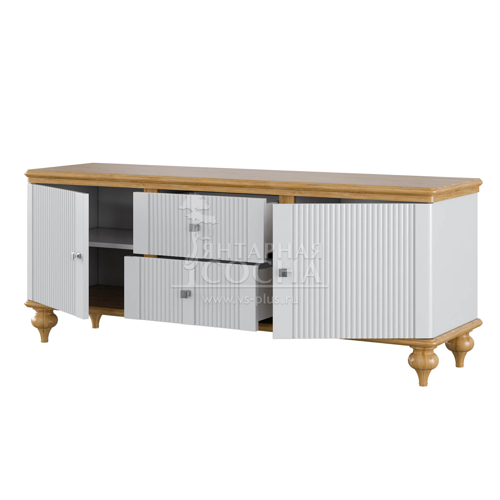 Тумба ТВ оснащена двумя выдвижными ящиками и двумя полками за распашными дверями. Фурнитура на ящиках и дверях с доводчиками. Высокие ножки обеспечивают оптимальный доступ при уборке.