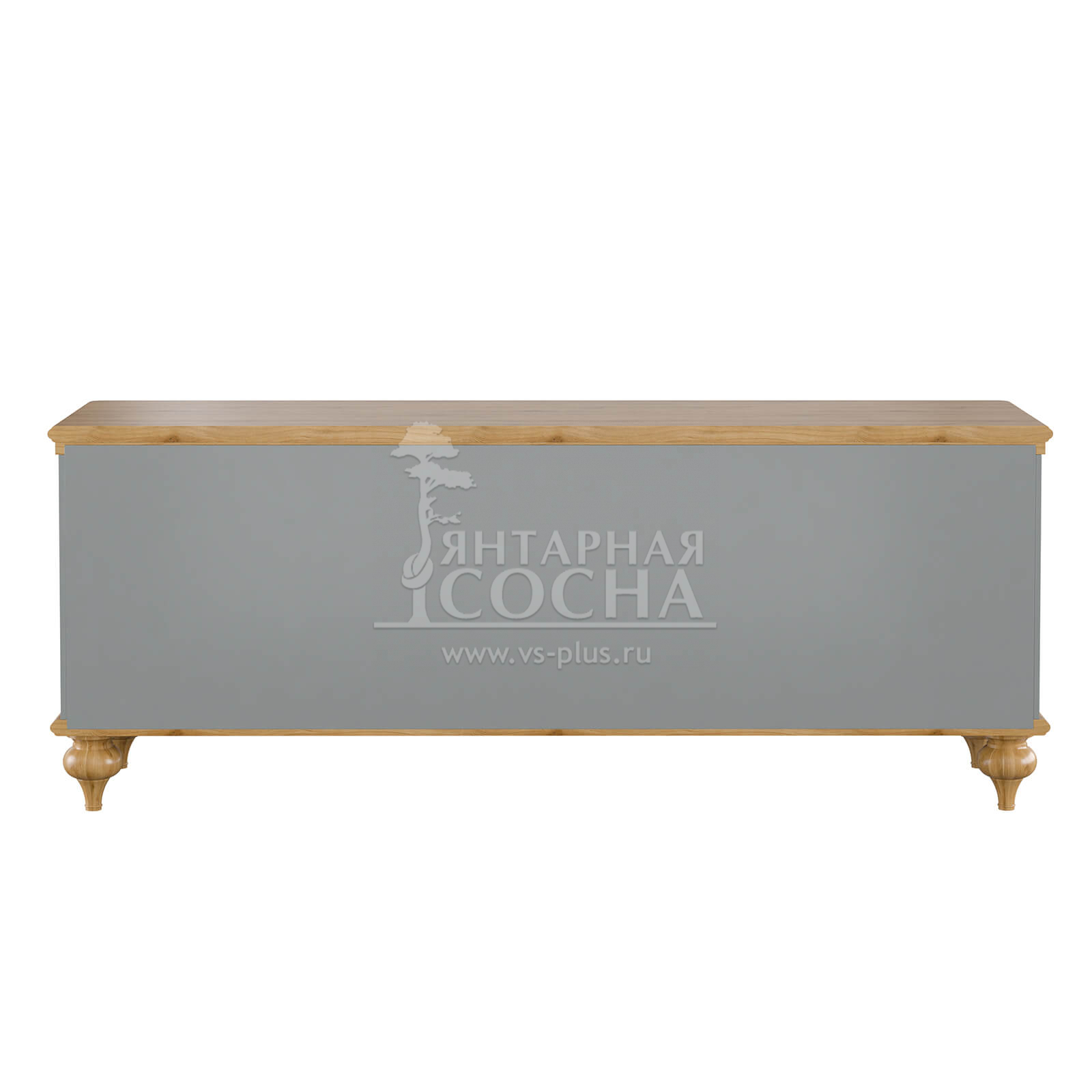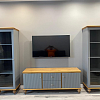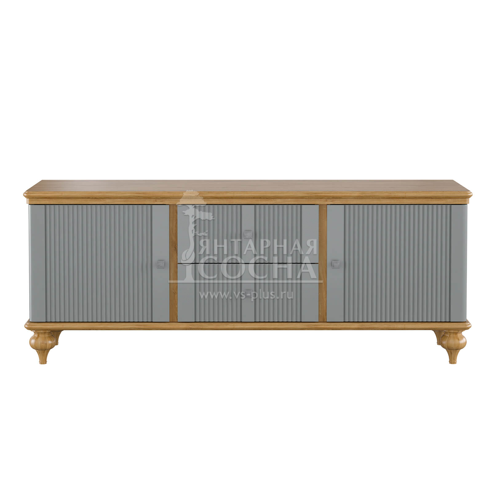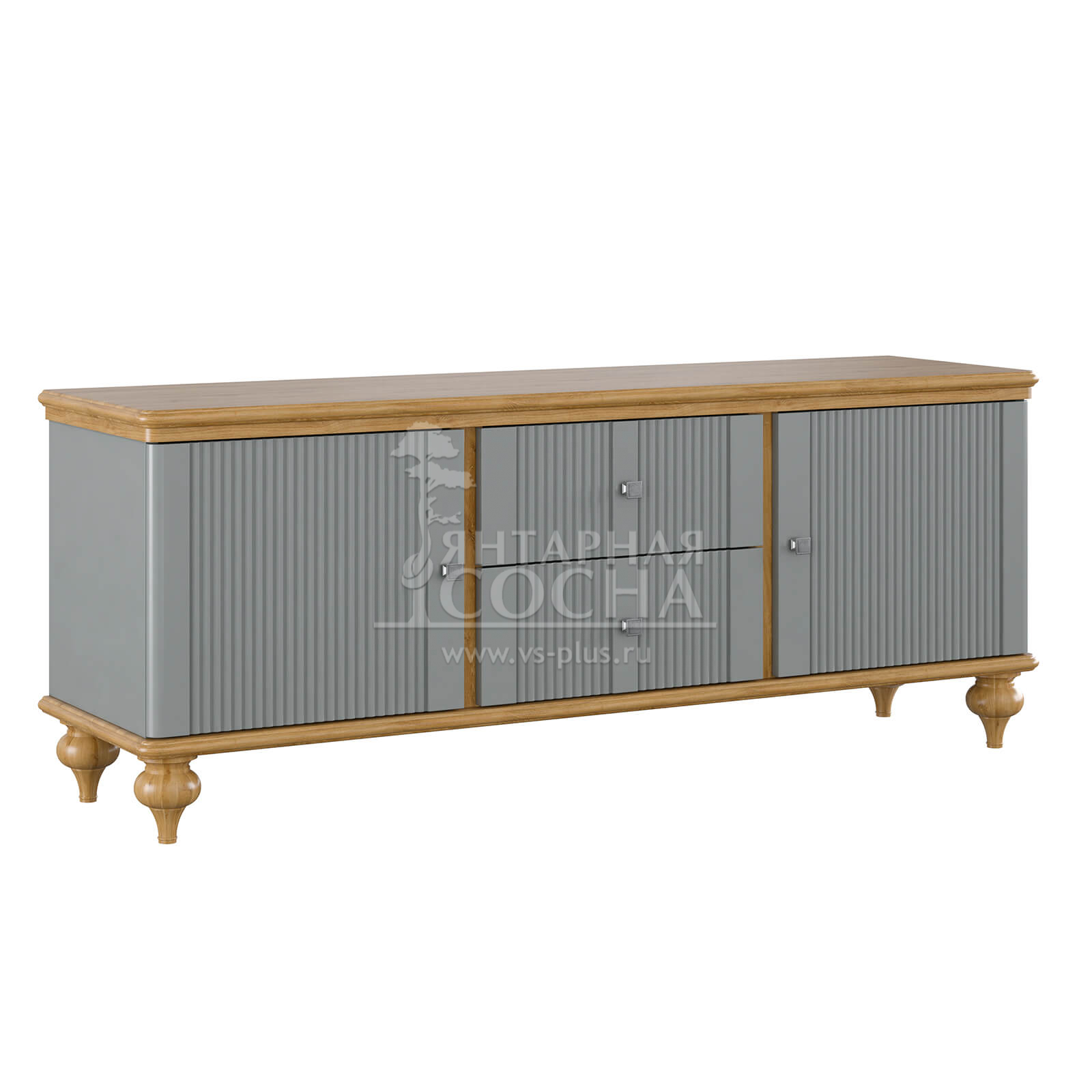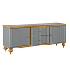 Тумба ТВ оснащена двумя выдвижными ящиками и двумя полками за распашными дверями. Фурнитура на ящиках и дверях с доводчиками. Высокие ножки обеспечивают оптимальный доступ при уборке.