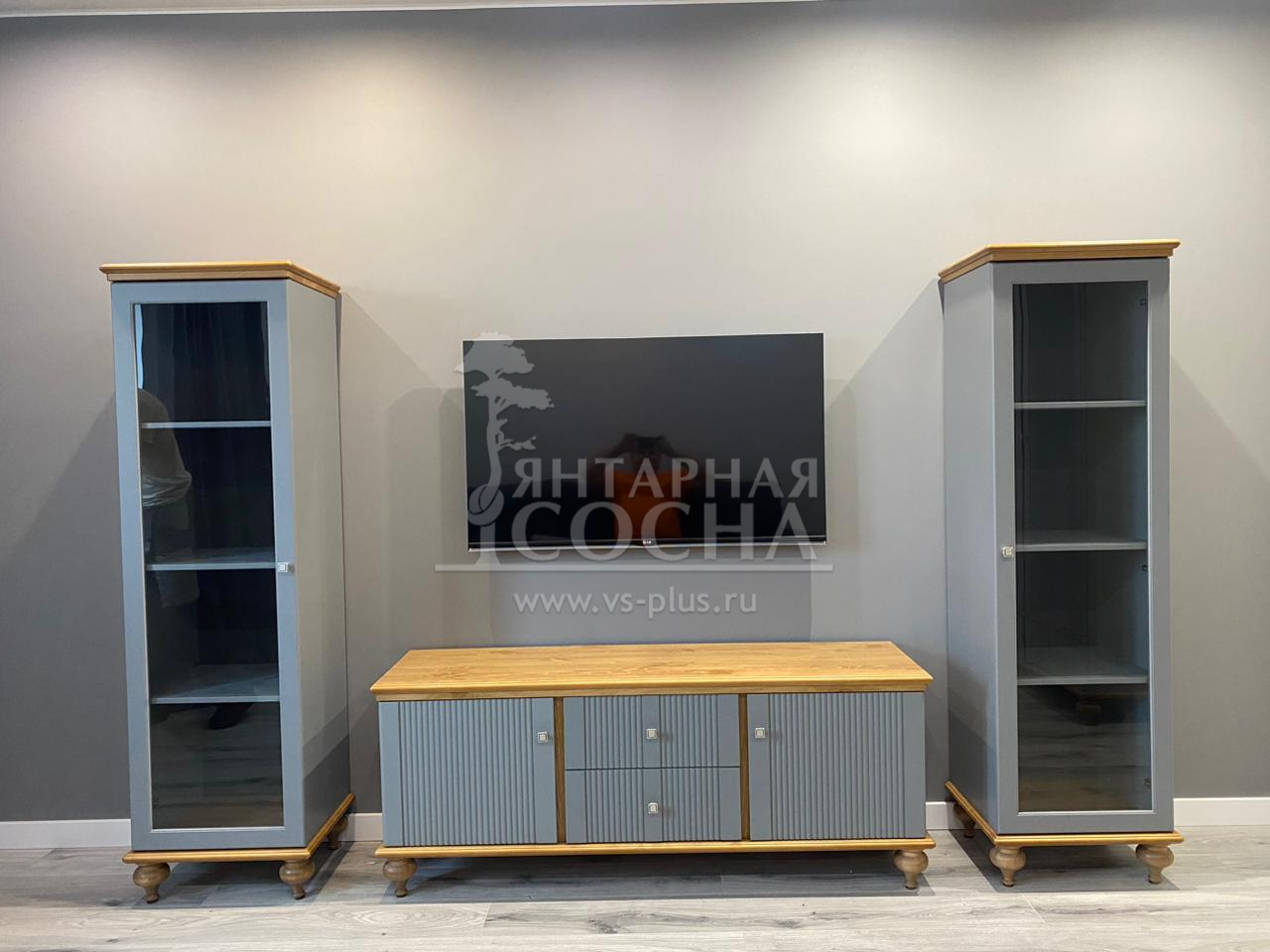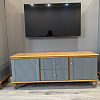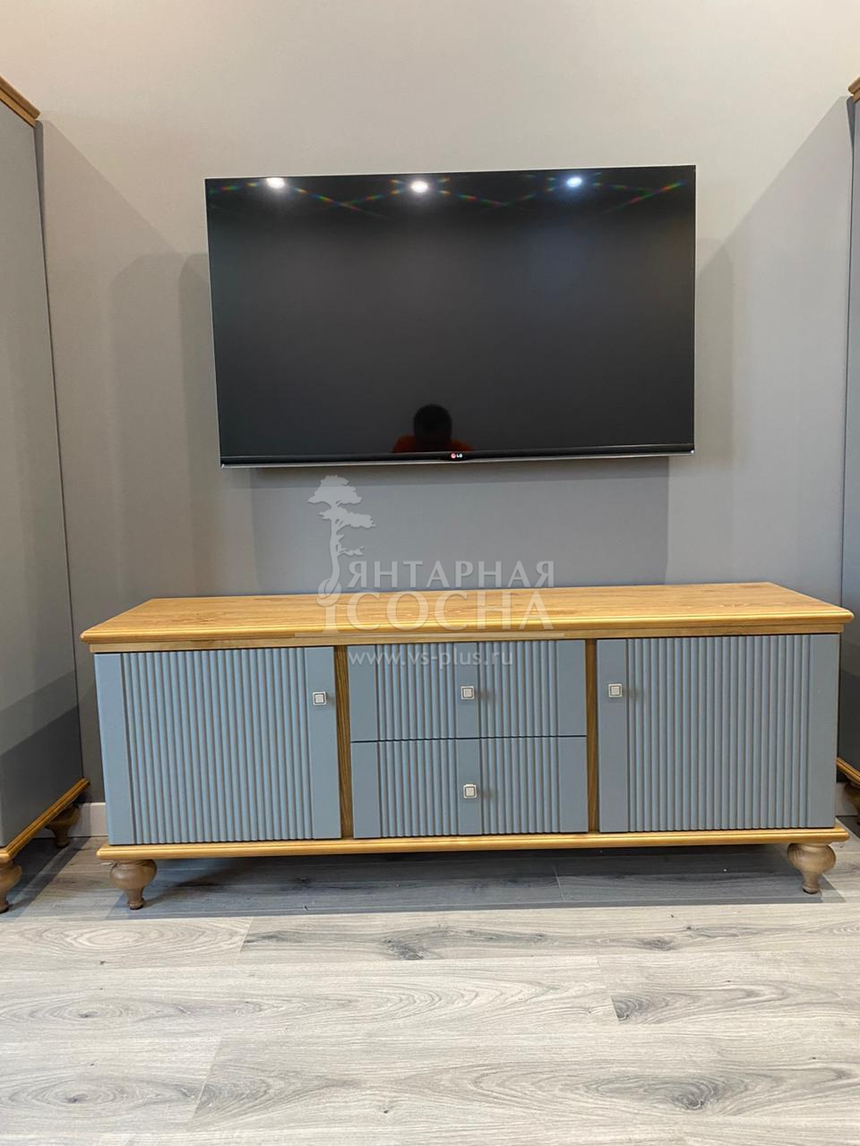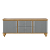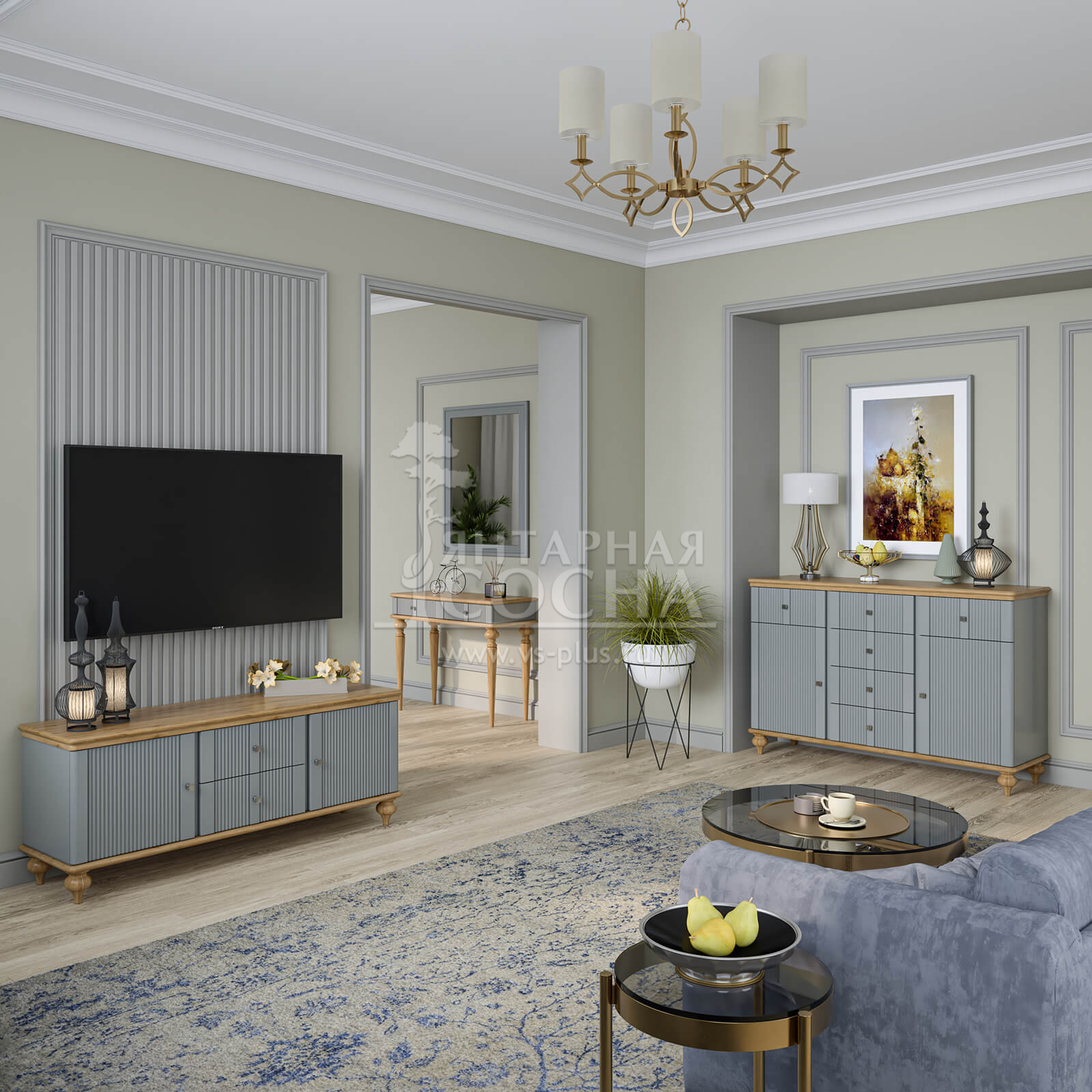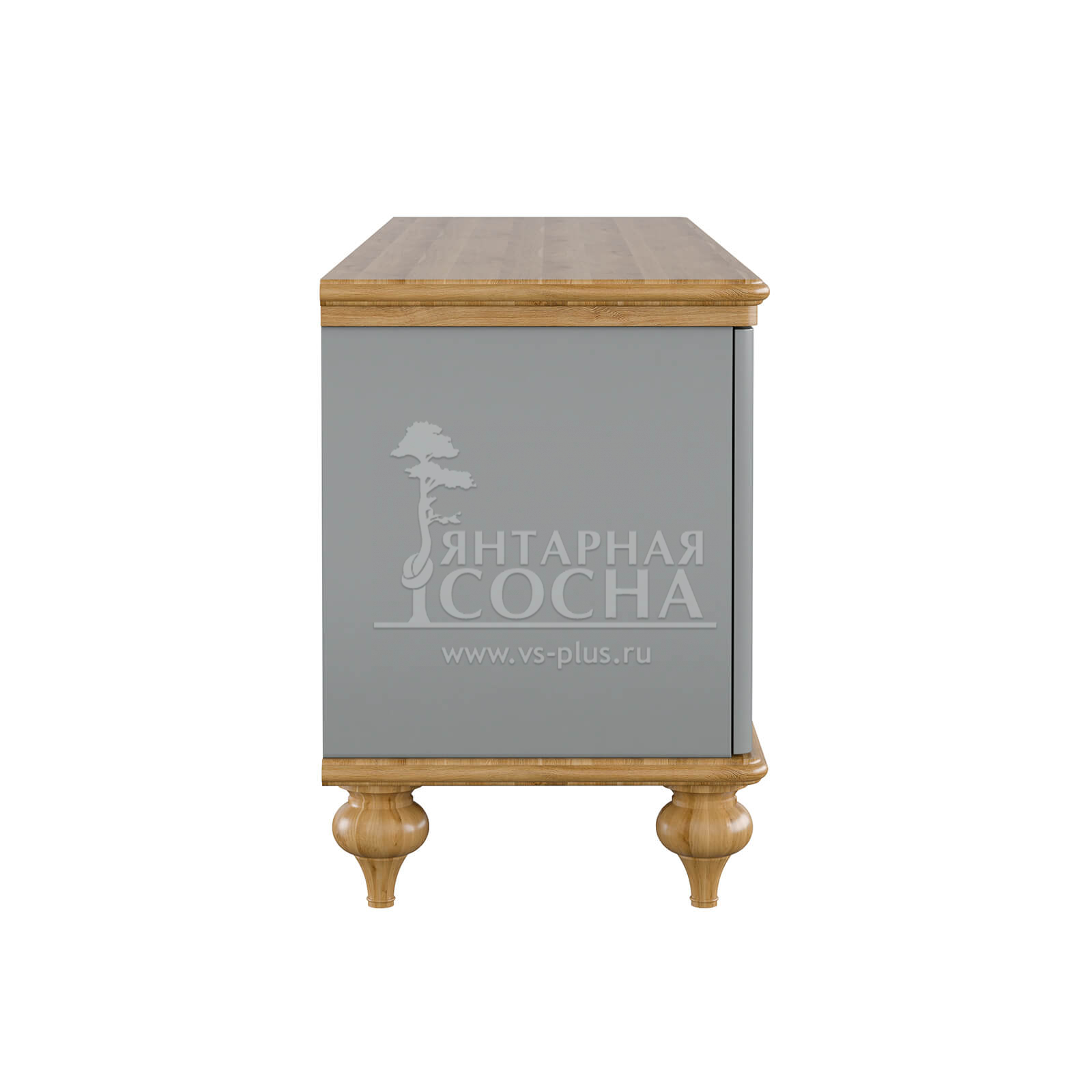 Тумба ТВ оснащена двумя выдвижными ящиками и двумя полками за распашными дверями. Фурнитура на ящиках и дверях с доводчиками. Высокие ножки обеспечивают оптимальный доступ при уборке.