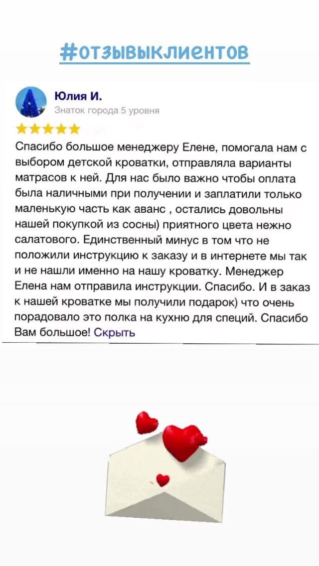 Отзыв: Спасибо менеджеру Янтарной сосны - Елене. Очень подробно и грамотно всё делает. Все бы так работали. Ещё кухню Анюта у Елены купил - тоже хороша