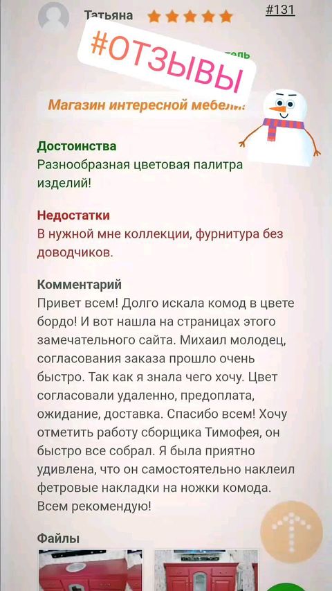 Достоинства: Очень добротный комод, фурнитура отличная, с доводчиками. Много вариантов покраски