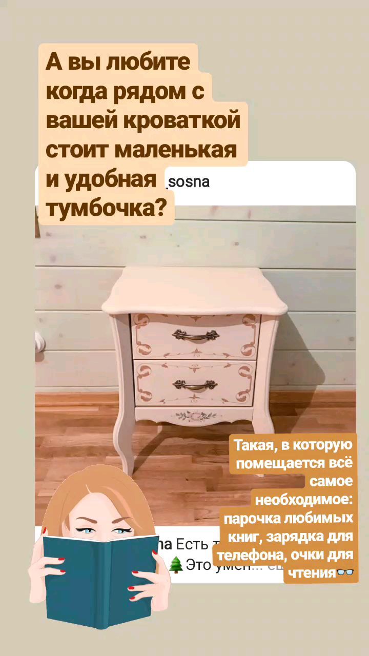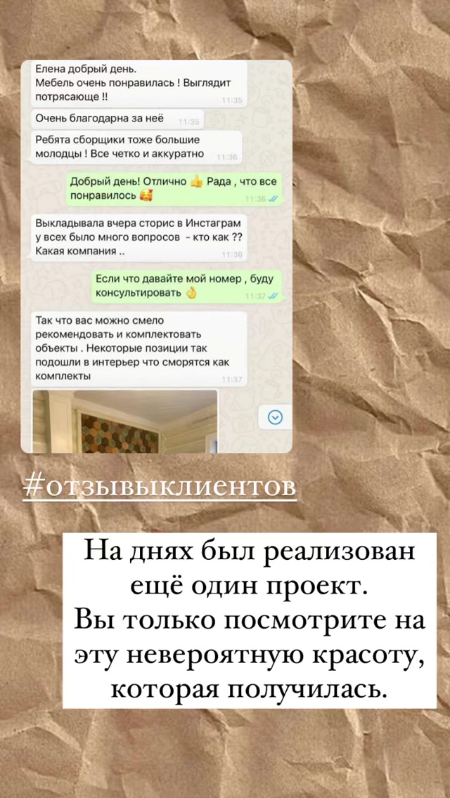 Отзыв: Будет в квартире уютно, и сладкие сны вас посетят на тахте от "Янтарной сосны". Утром на кухне как мёдом согрет заря между Шампань и Провансом был выбор не зря Если остались сомнения - Елене звони, ей мебели тайны раскрыты и ясны как дни: подскажет что выбрать, ошибку сведёт до нуля. Логистика, сборка и всё без проблем. Вуаля!