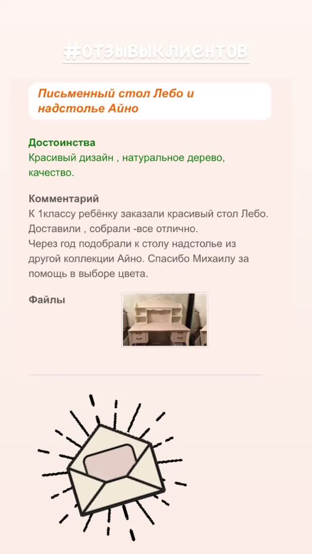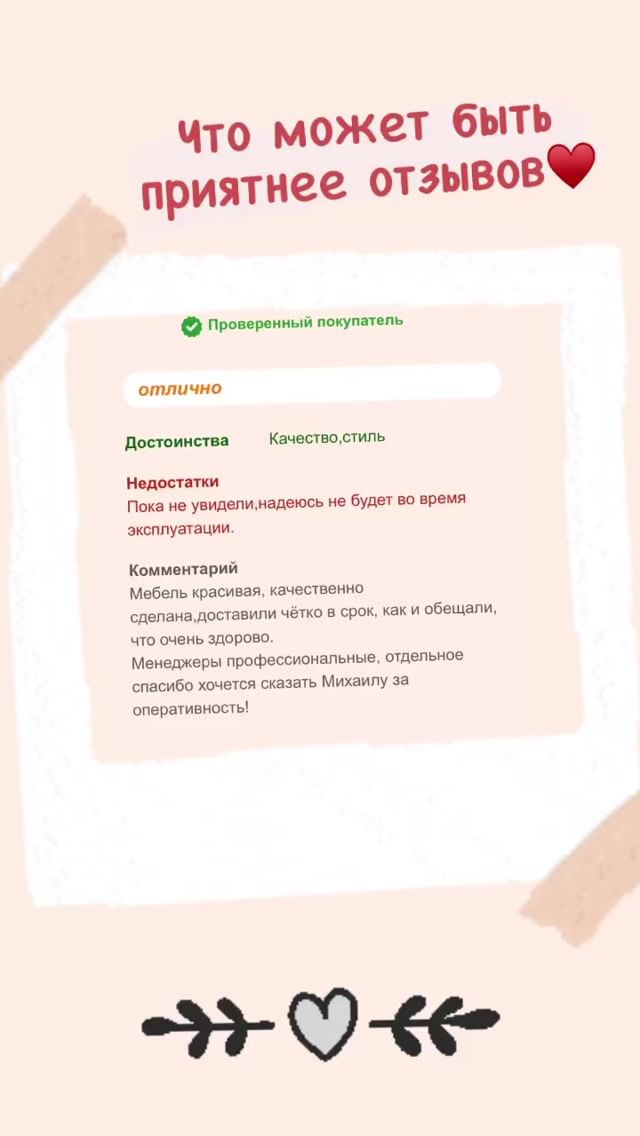 Отзыв: Менеджер Михаил сопровождал во время заказа, доставки и сборки. Очень вежливый и внимательный. Это уже третий заказ в данном магазине, очень довольны.