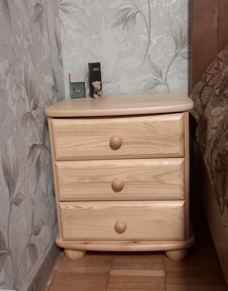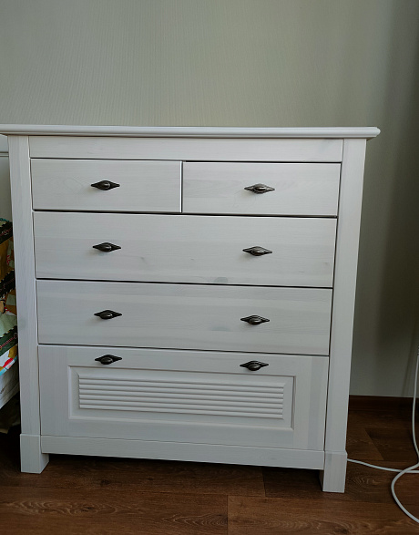 Отзыв: Выглядит действительно хорошо, не премиум, но это именно традиционный комод. Со временем сосна темнеет под одним слоем лазури и внешний вид преображается: поверхность уже не чисто белая, а отчётливее проявляется текстура сосны. Так что никакого больничного цвета нет! И всё-таки по сборке: если не уверены в себе, то лучше закажите сборку