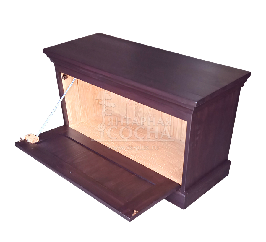 За дверцей скрывается внутреннее пространство, подходящее для хранения обуви, аксессуаров или мелочей. Банкетка одновременно выполняет роль комфортного сиденья и тумбы для хранения — практично, надёжно и красиво.