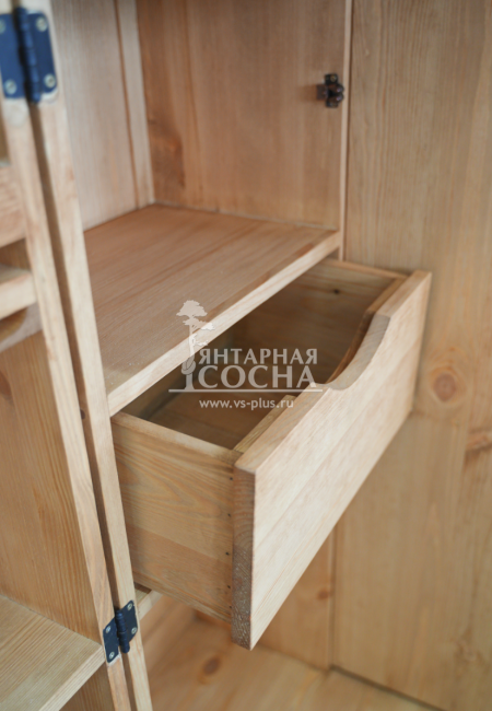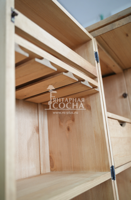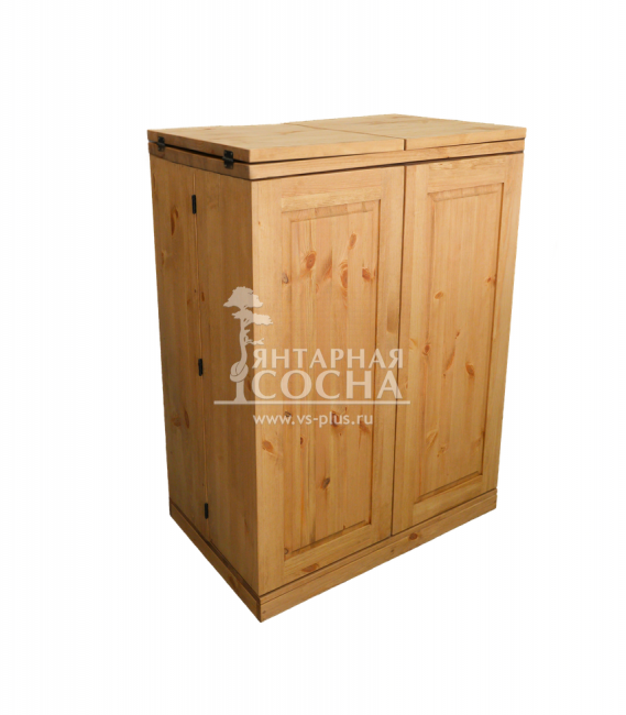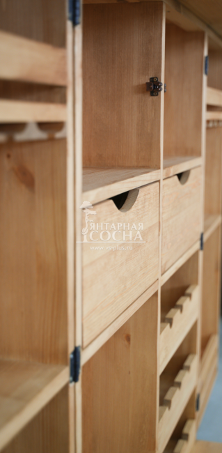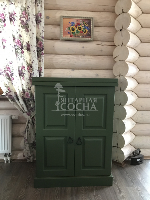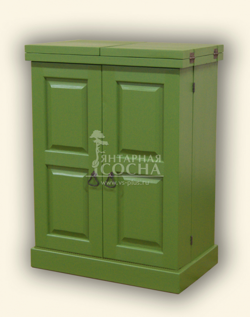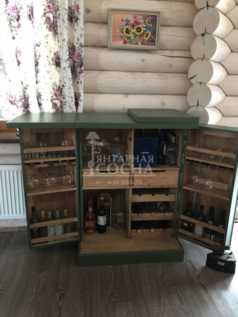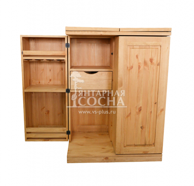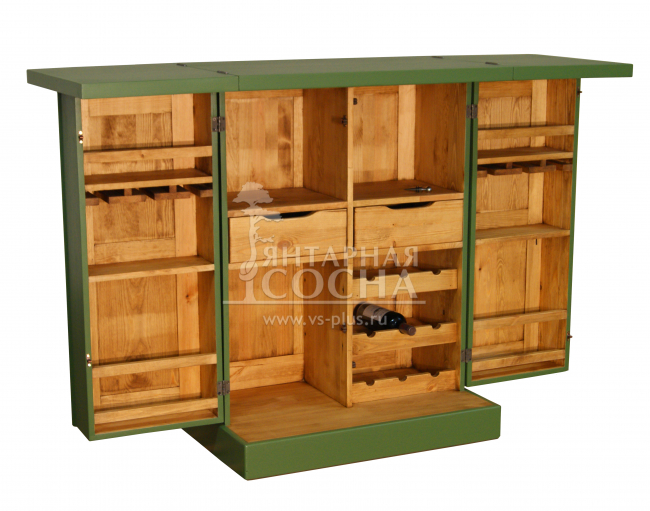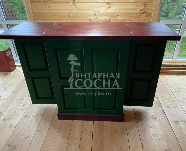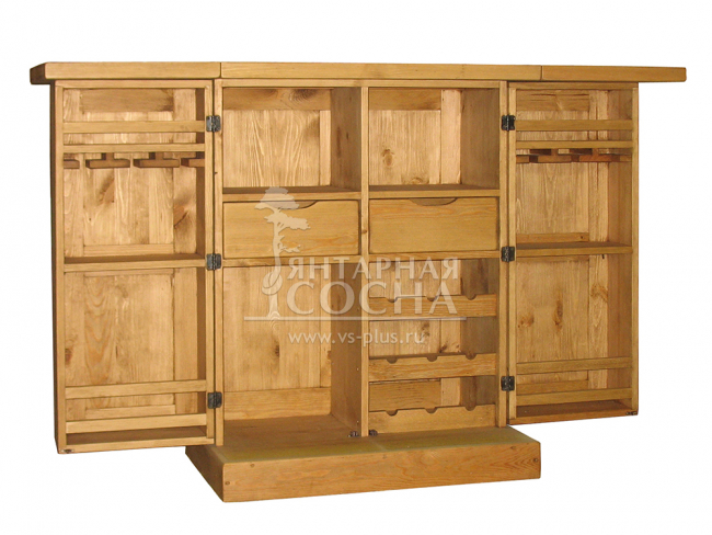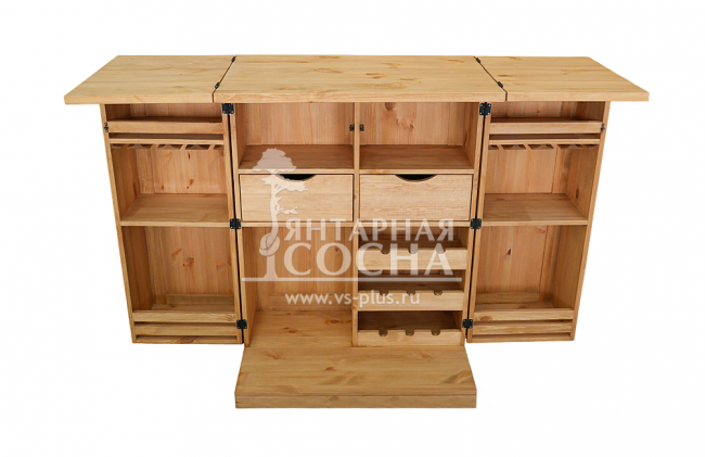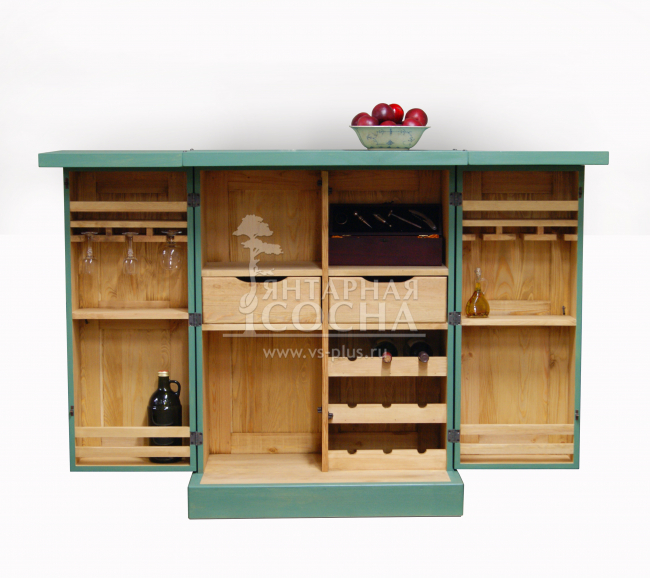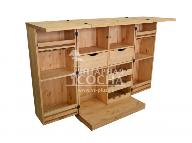 Открывающийся бар. Массив сосны, старение, кованные ручки При открытых дверях, крылья столешницы раскладываются и получается широкая барная стойка длиной 169 см (см.следующие фото). Лицевая и задняя стороны имеют красивые филенчатые вставки, что позволяет сделать бар центром интерьерной композиции.