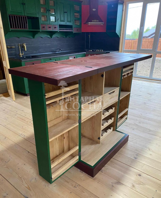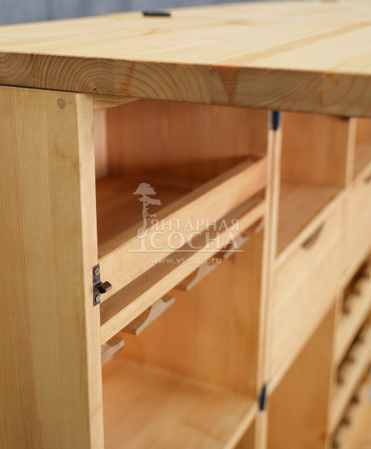 Торцевые части столешницы и крыльев (толщиной 40 мм) укреплены поперечными вставками. В верхней части сделаны приспособления ( kit-бары) для рюмок и бокалов. В открытую нишу поместится небольшой бочонок.