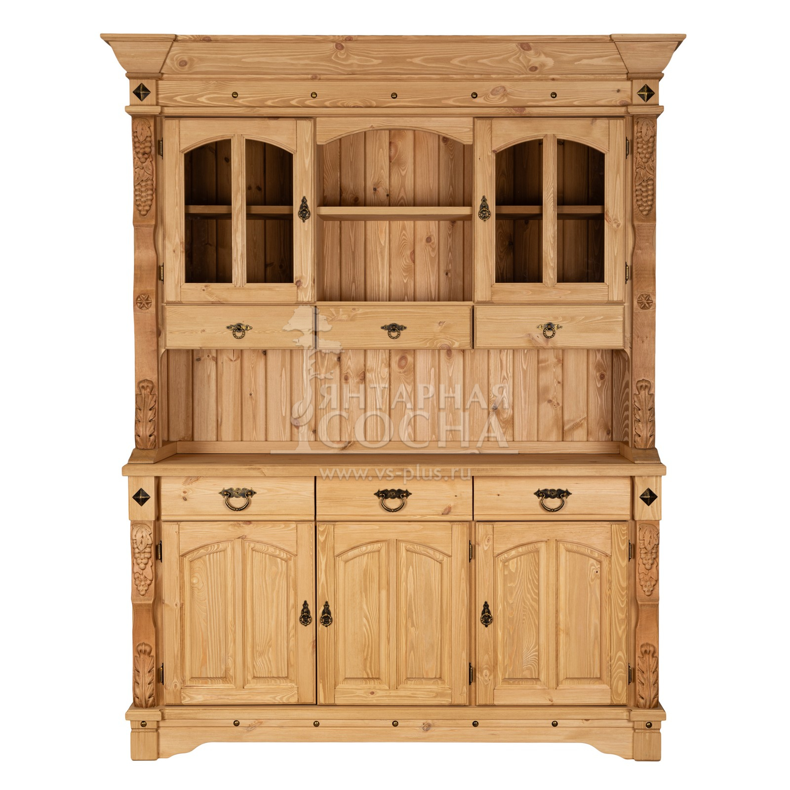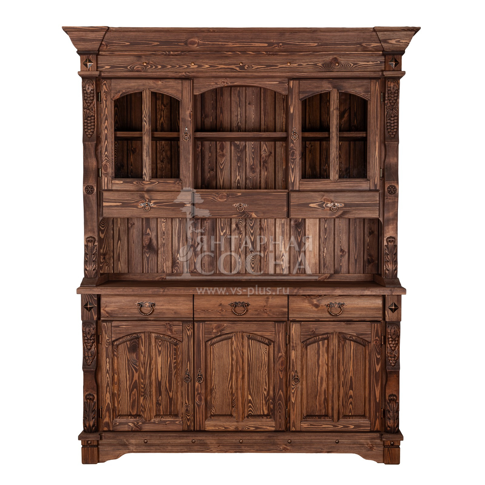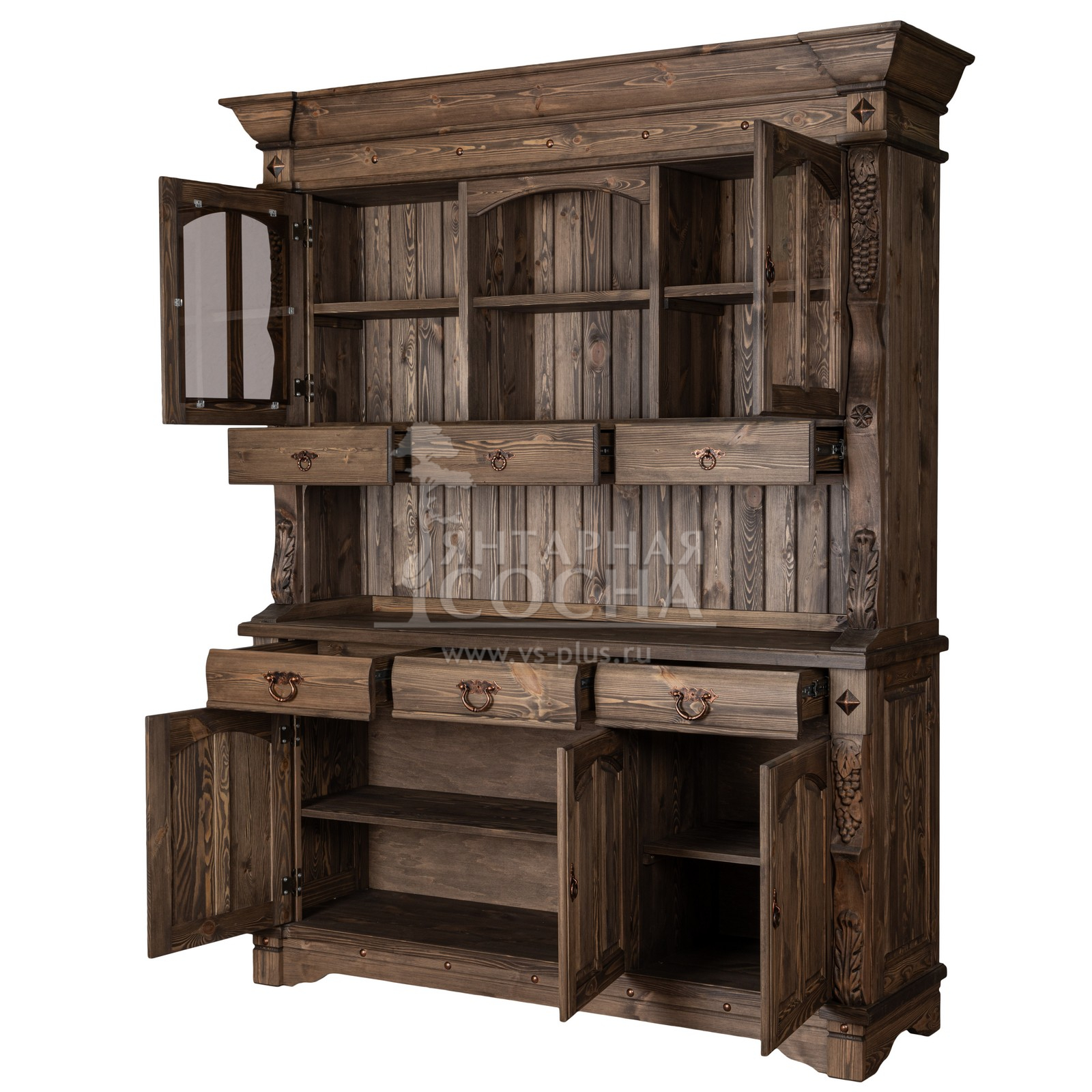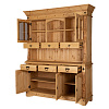 Буфет-витрина изготовлен из массива сосны в цвете палисандр.Округлые филенчатые вставки и природные резные узоры по бокам придают оформлению оригинальный стилистический оттенок в провинциальной французской традиции.