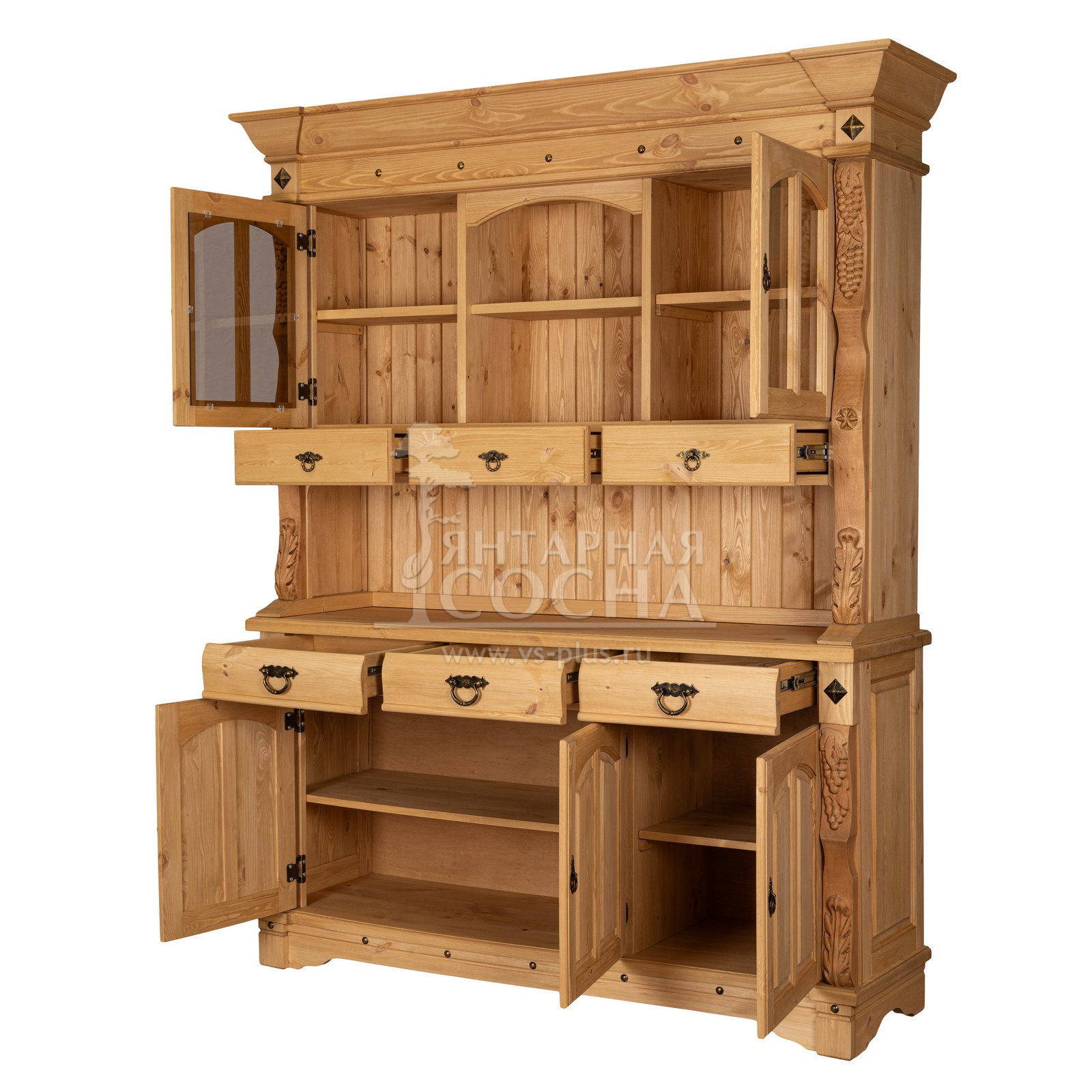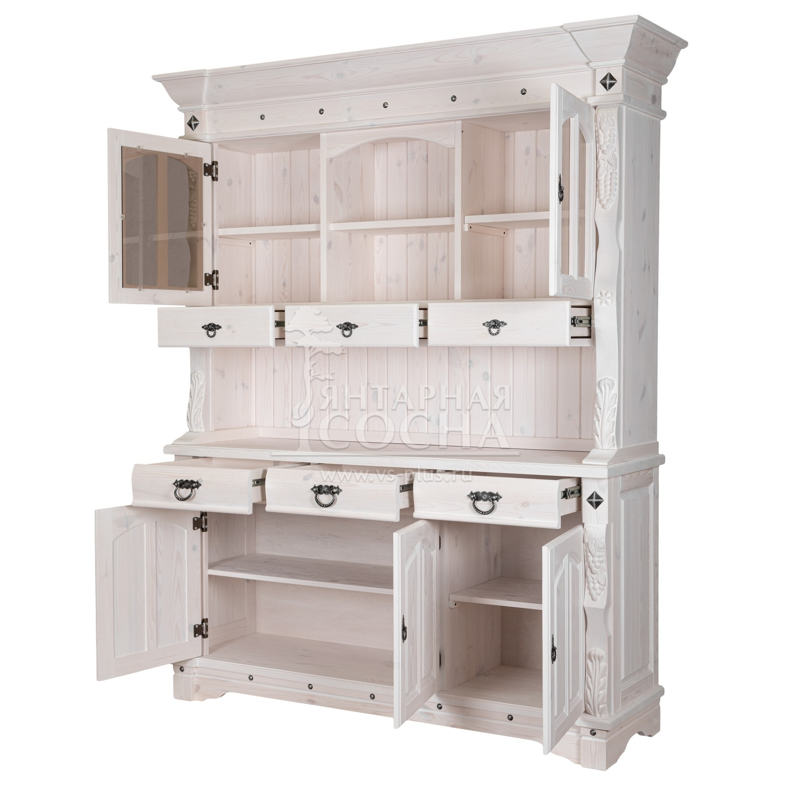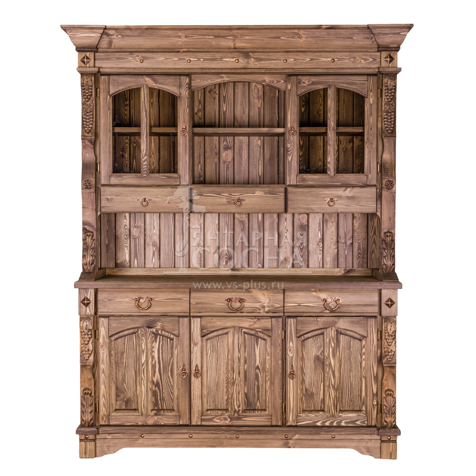 Буфет-витрина изготовлен из массива сосны в цвете палисандр.Округлые филенчатые вставки и природные резные узоры по бокам придают оформлению оригинальный стилистический оттенок в провинциальной французской традиции.
