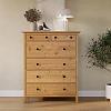 Модель выполнена из массива сосны. Ящики тщательно отшлифованы и покрыты бесцветным лаком, который подчёркивает природную текстуру дерева и защищает поверхность при ежедневном использовании. Комод выглядит аккуратно, легко и при этом ощущается надёжным и основательным.