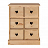Модель оснащена шестью выдвижными ящиками на деревянных полозьях. Каждый ящик украшен прорезным сердечком, что создаёт мягкий, уютный акцент и делает комод особенно привлекательным в интерьерах в стиле кантри, шале или прованс.