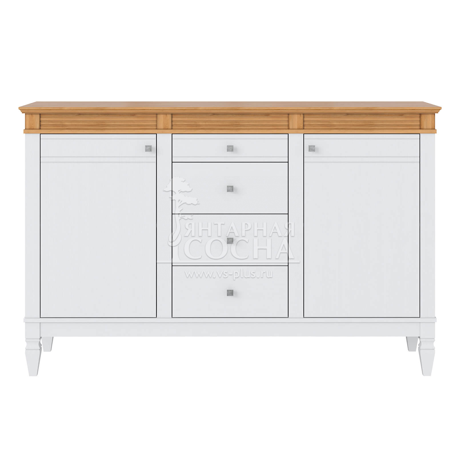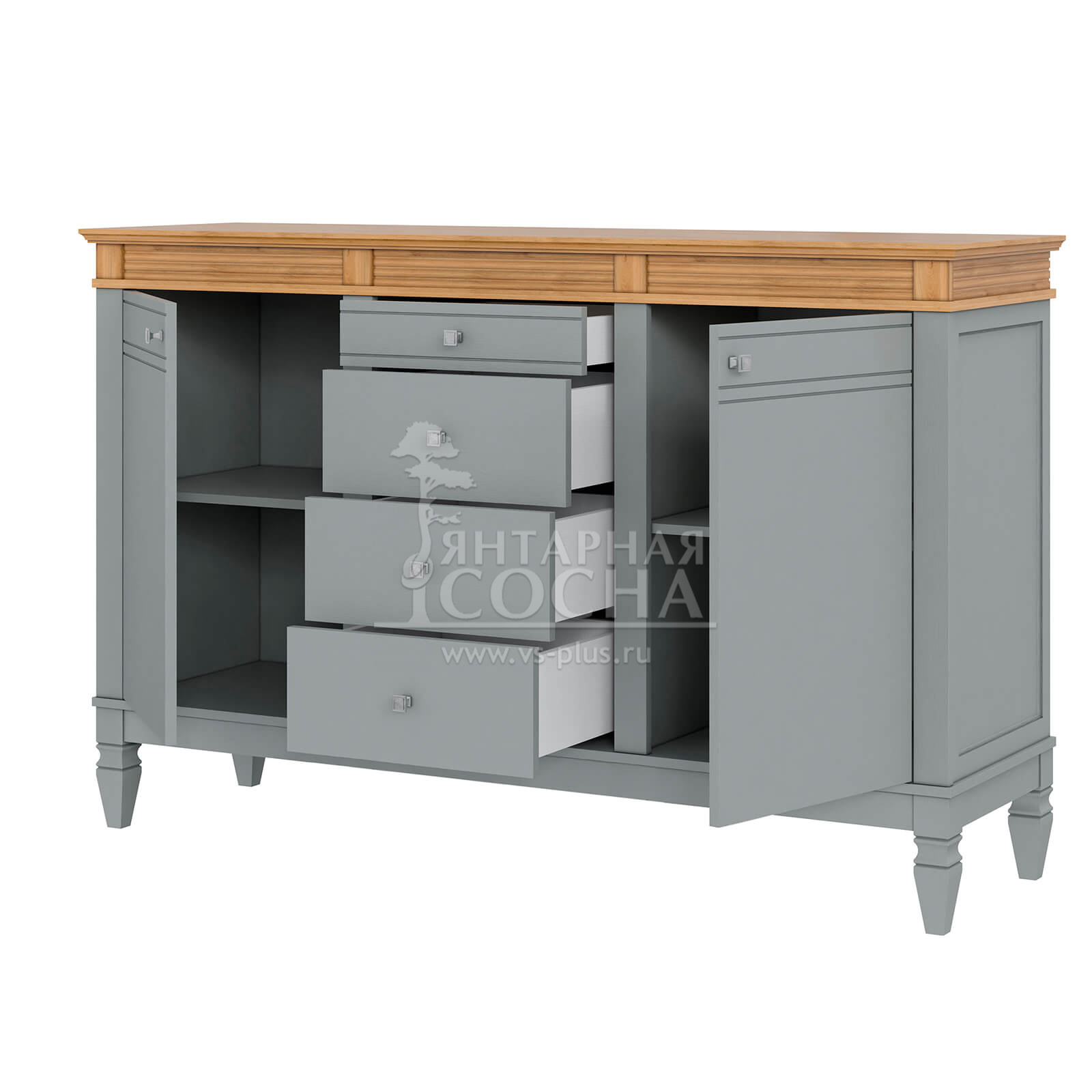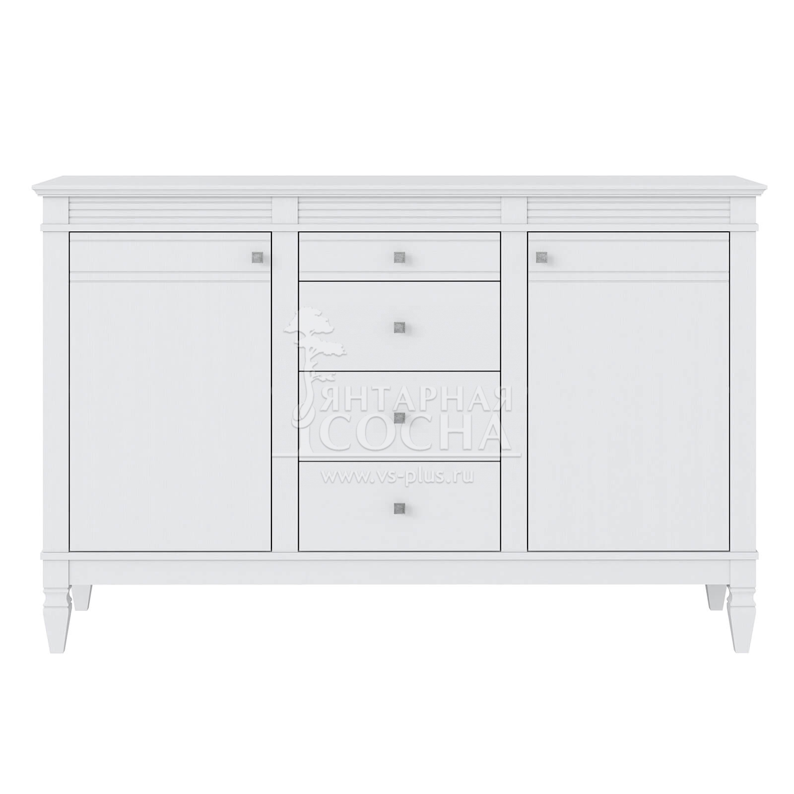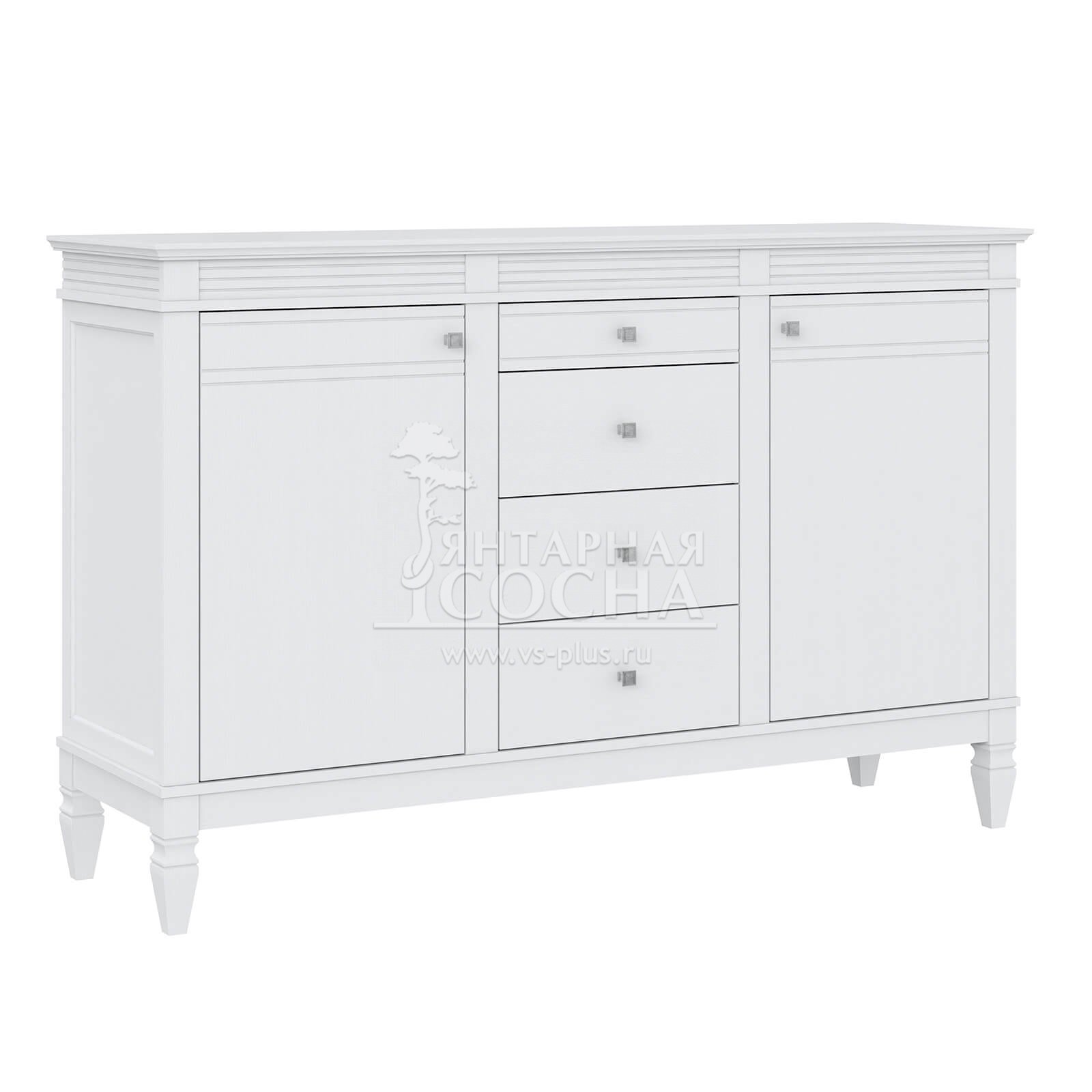 Комод оснащен двумя распашными дверками с полками внутри и четырьмя ящиками. Фурнитура на дверях и ящиках с доводчиками. Высокие ножки обеспечивают оптимальный доступ при уборке.