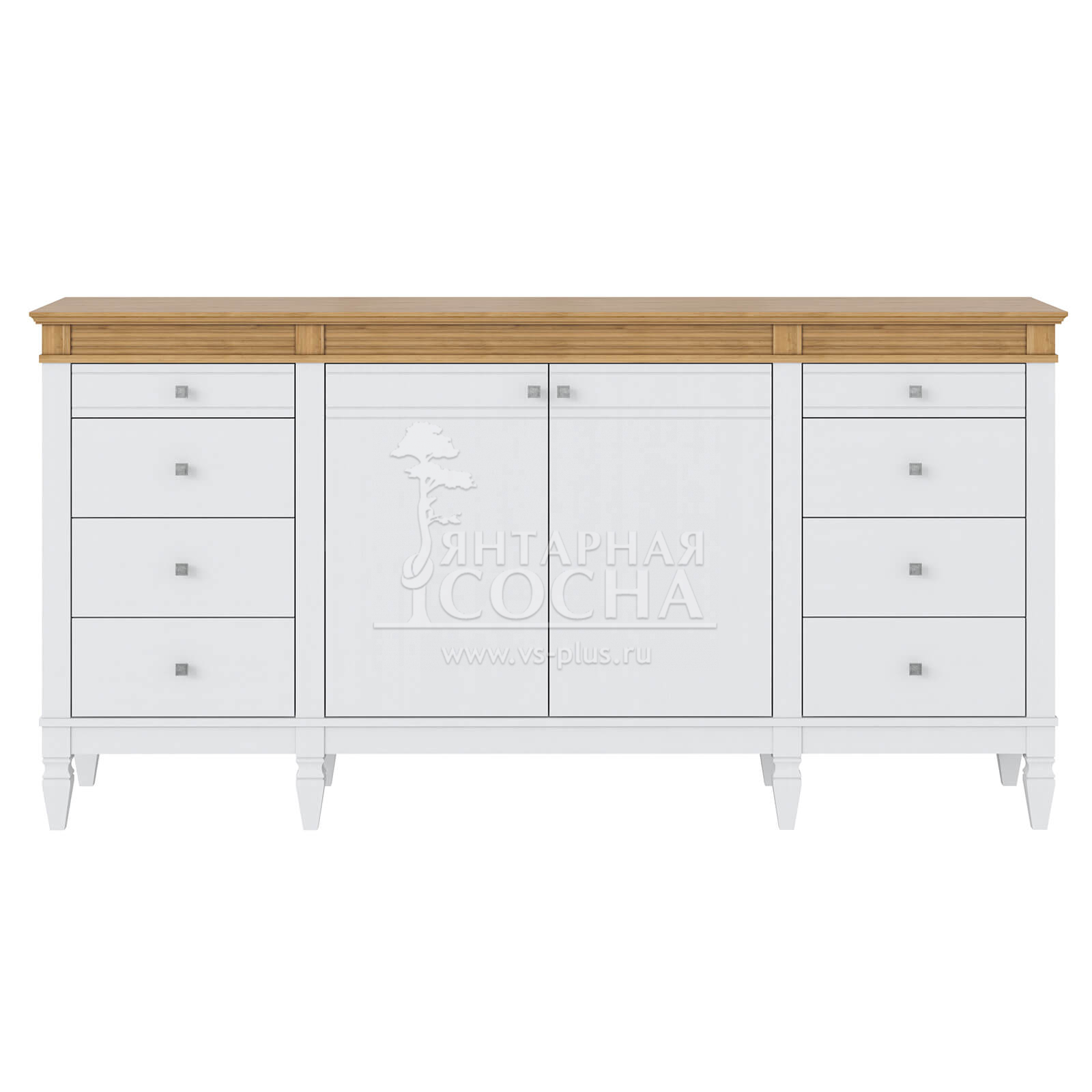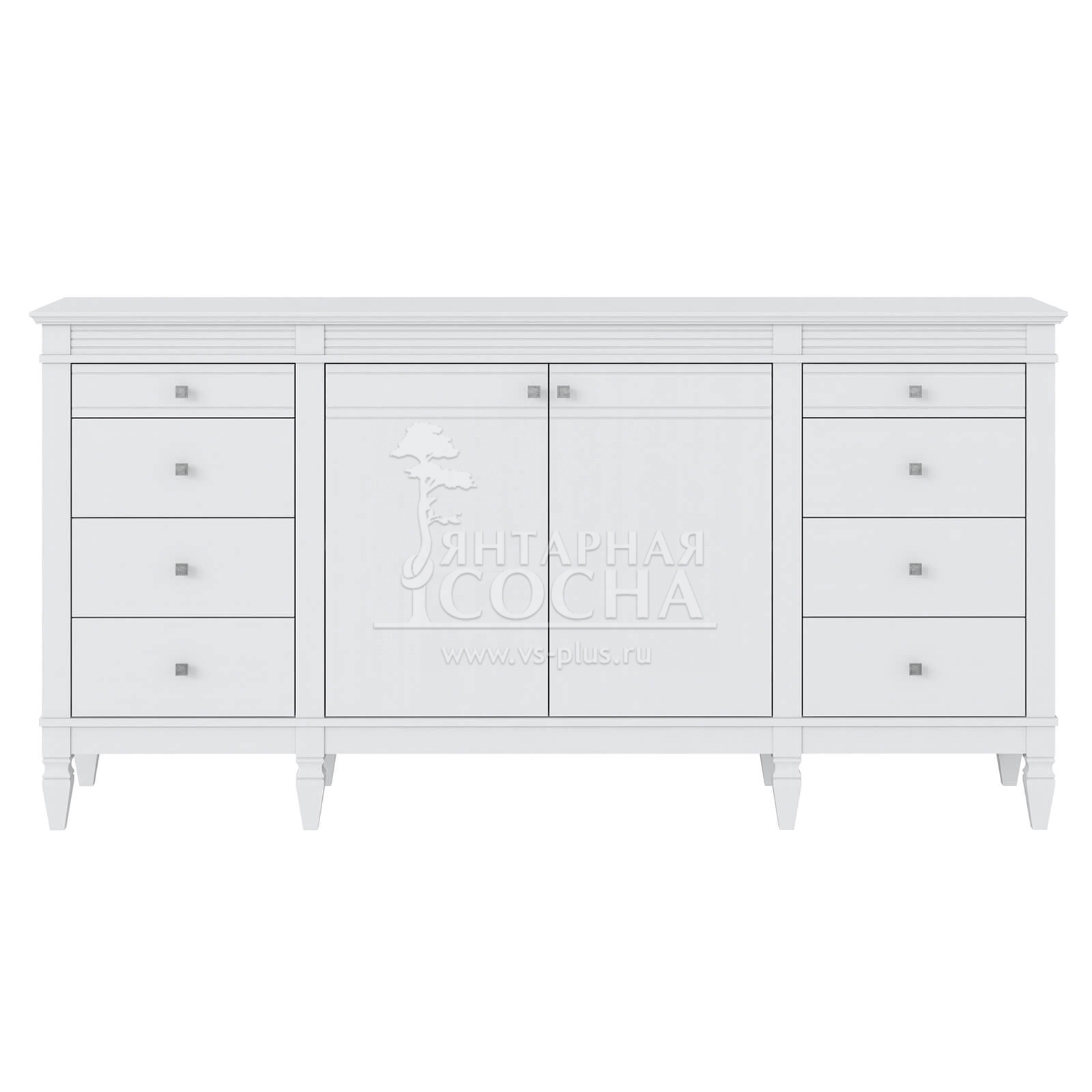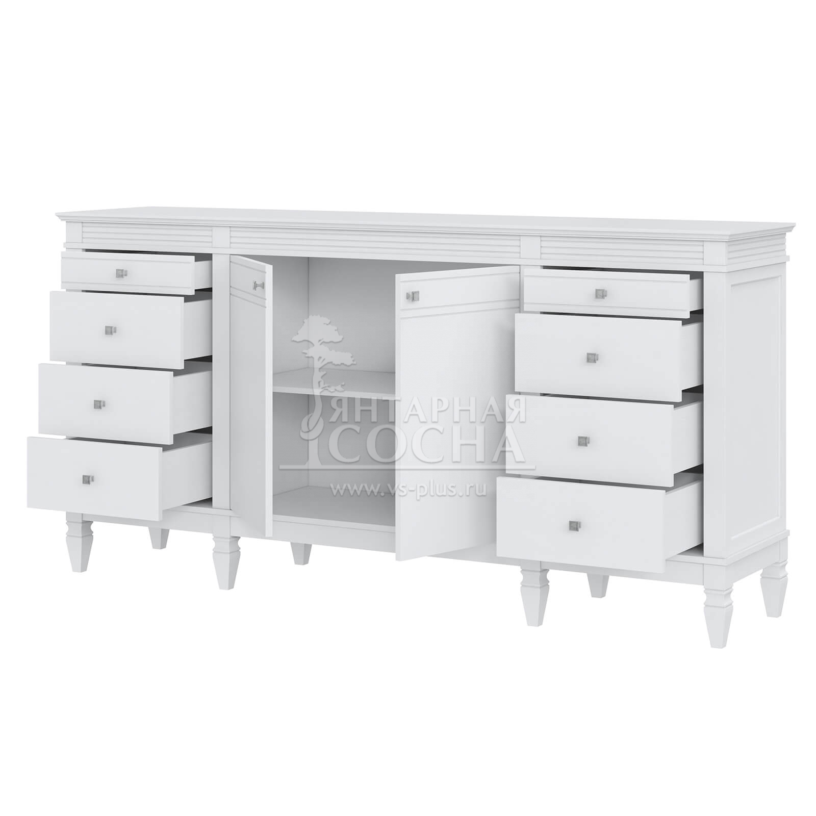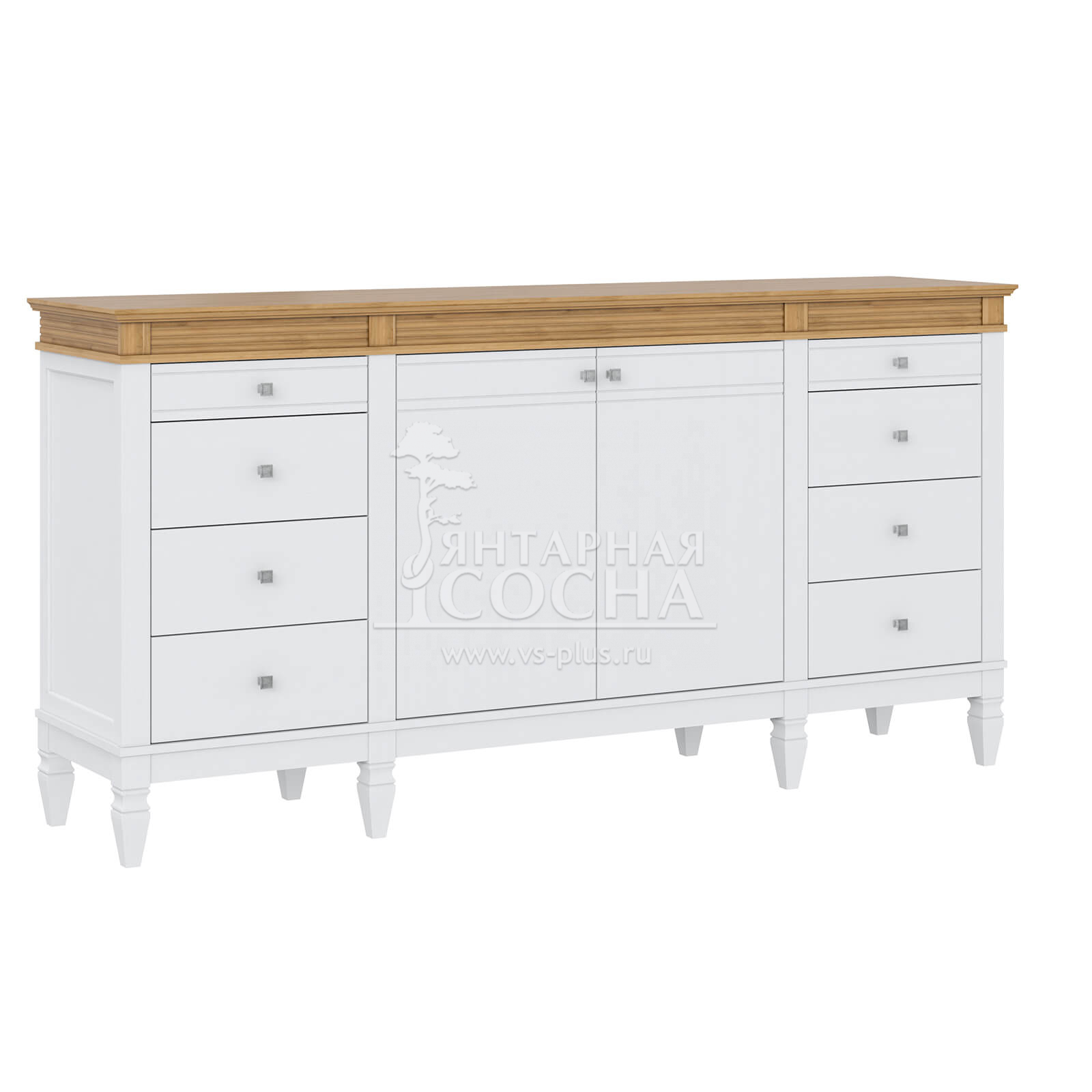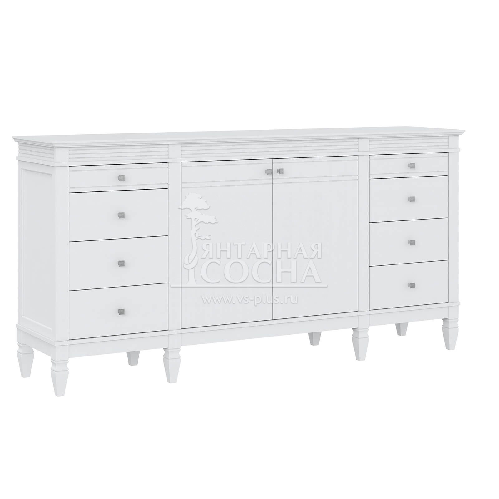 Комод оснащен двумя распашными дверками с полками внутри и восемью ящиками. Фурнитура на дверях и ящиках с доводчиками. Высокие ножки обеспечивают оптимальный доступ при уборке.