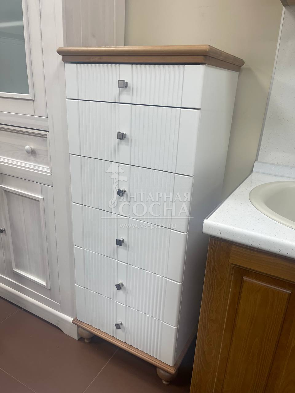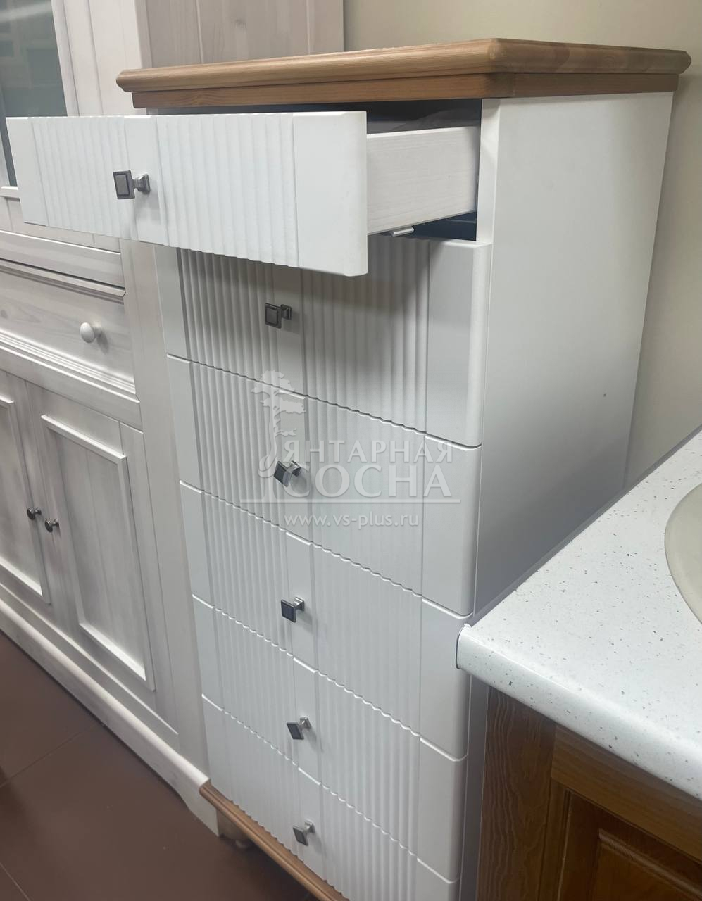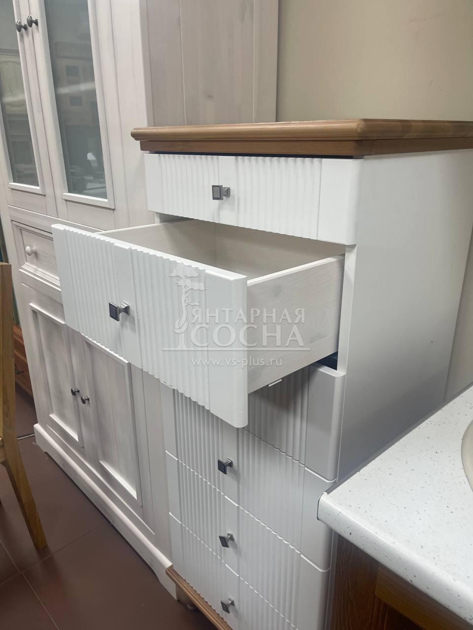 Корпус и ящики изготавливаются из ЛДСП австрийской компании "EGGER". Ножки мы делаем из массива берёзы, дверки снабжены механической системой открывания одним нажатием (система «TIP-ON»), а ящики - шариковыми направляющими.