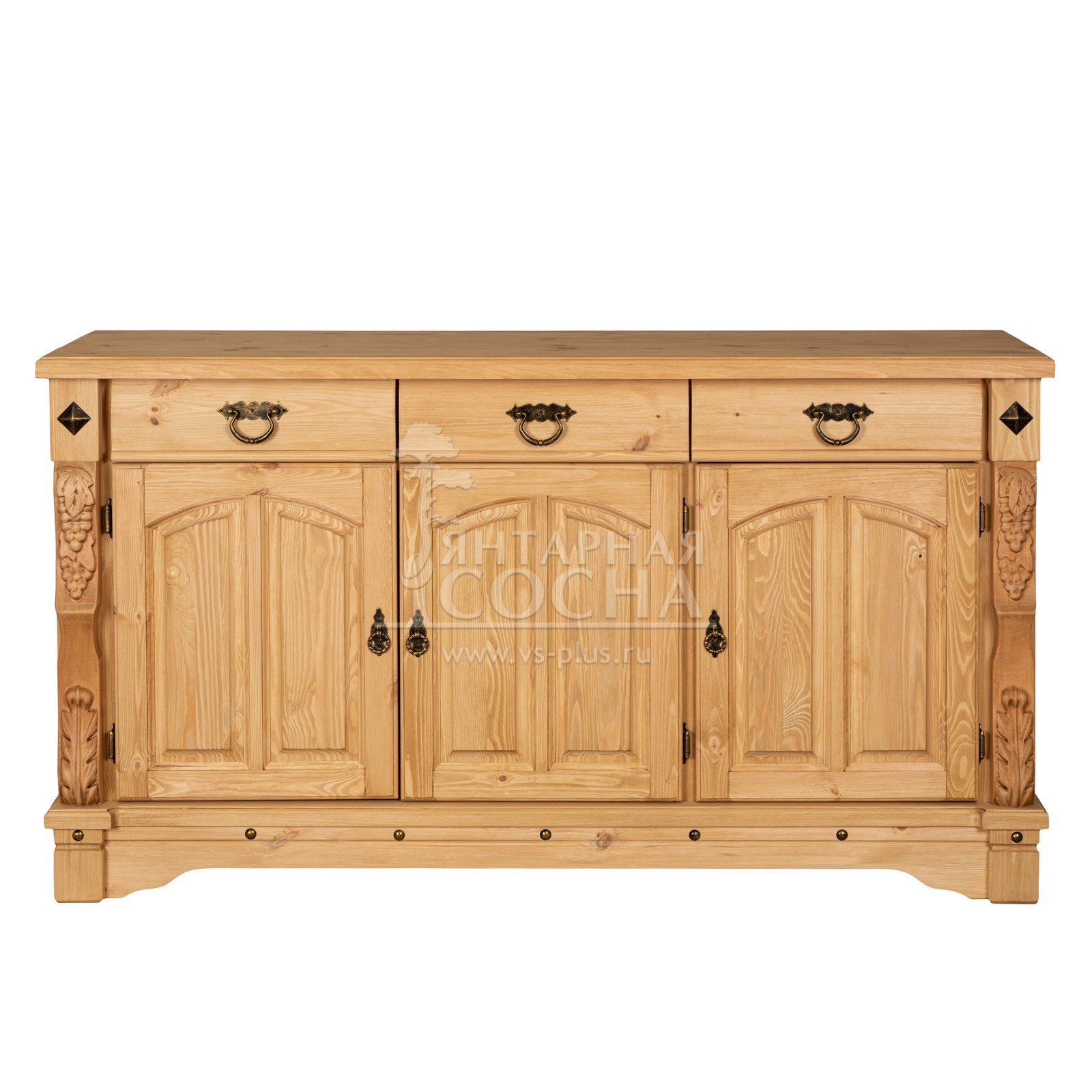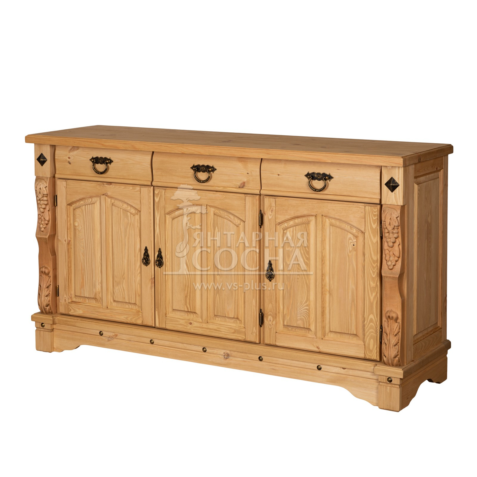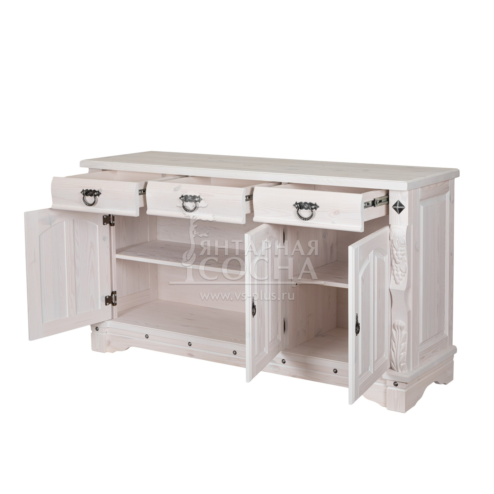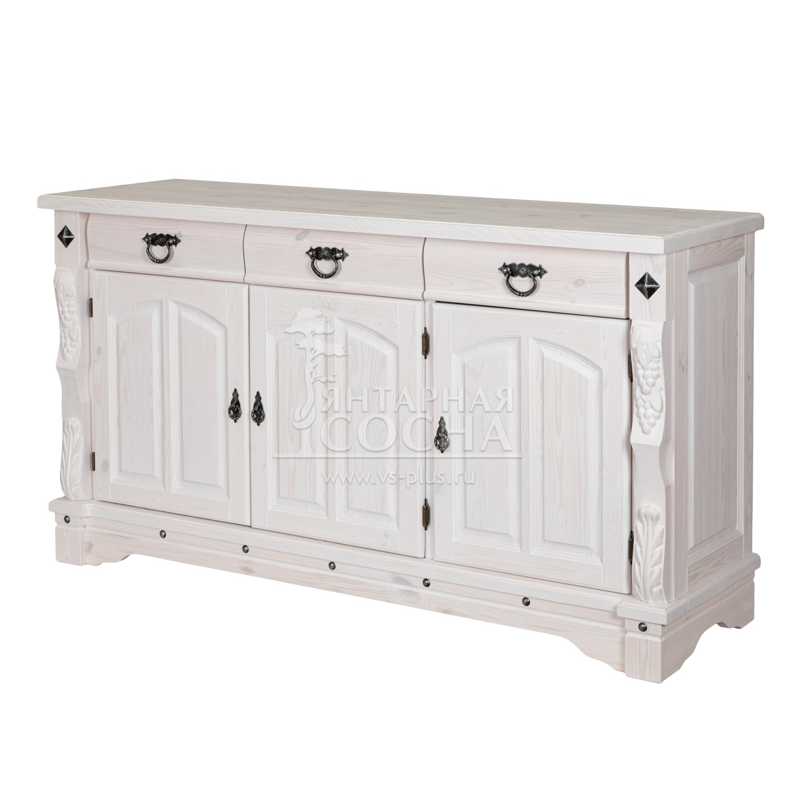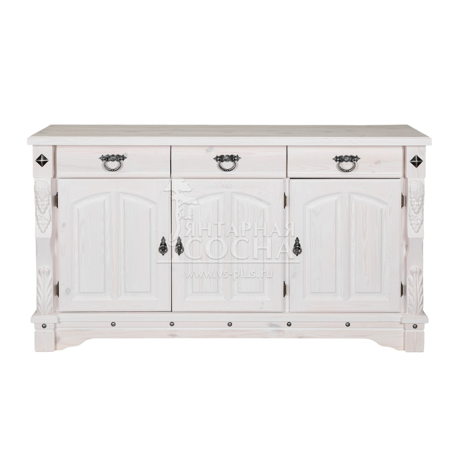 Трехдверный комод Викинг gl из массива сосны в белом цвете - особое украшение его служит резные элементы с гроздьями винограда. Подчеркнет аутентичный стиль загородного дома. Используется на кухне или в столовой для хранения посуды и необходимых вещей. Благодаря компактным габаритам легко впишется в небольшое помещение.