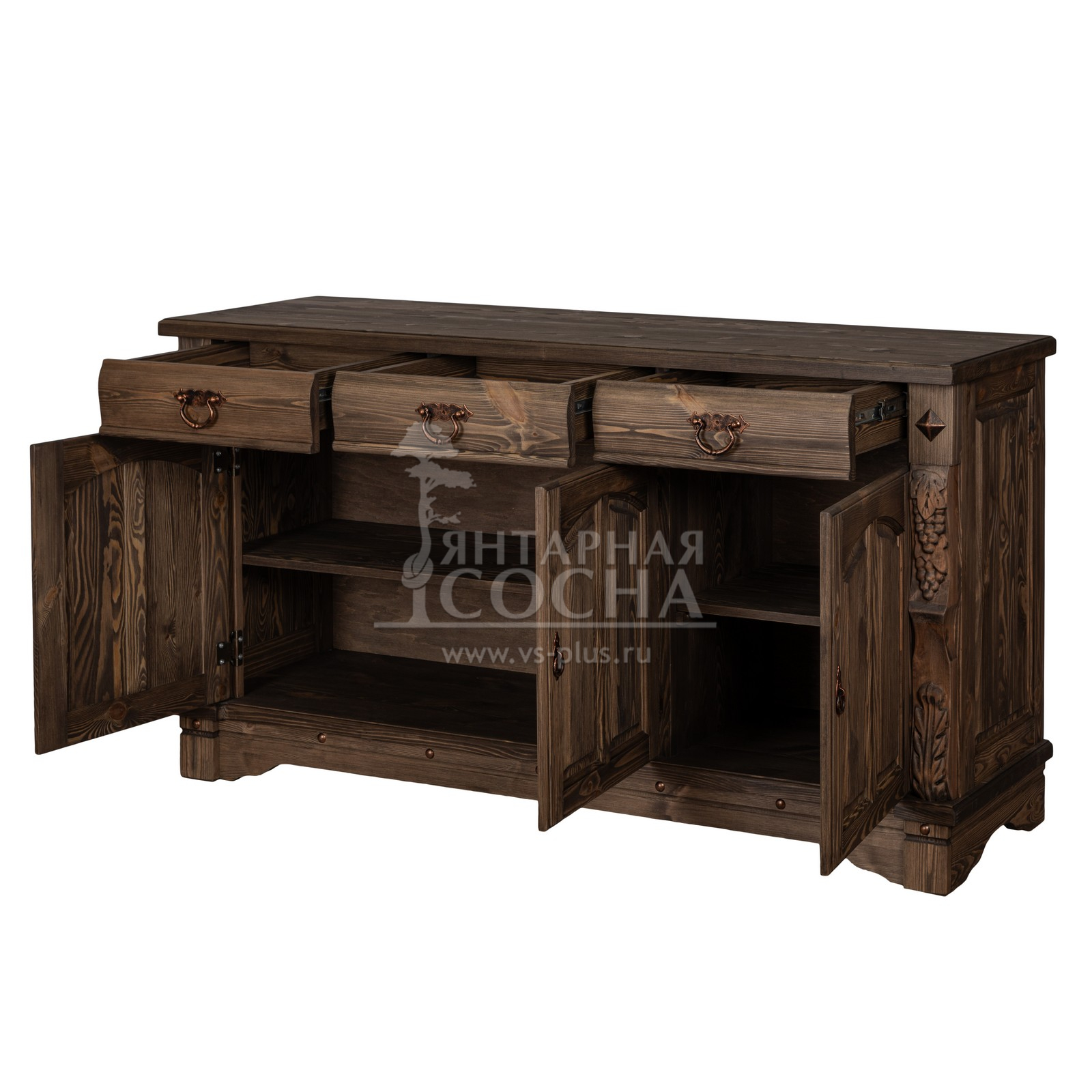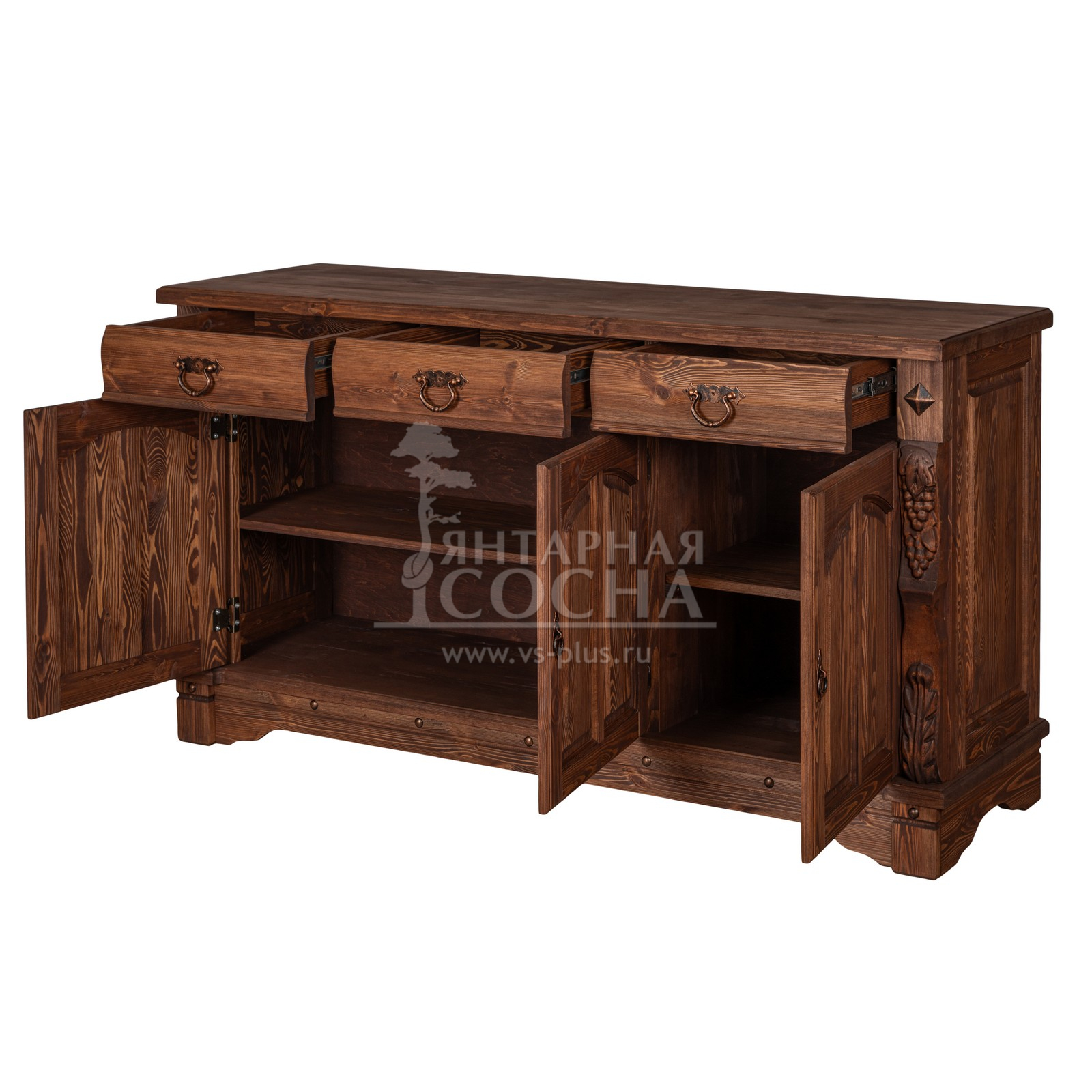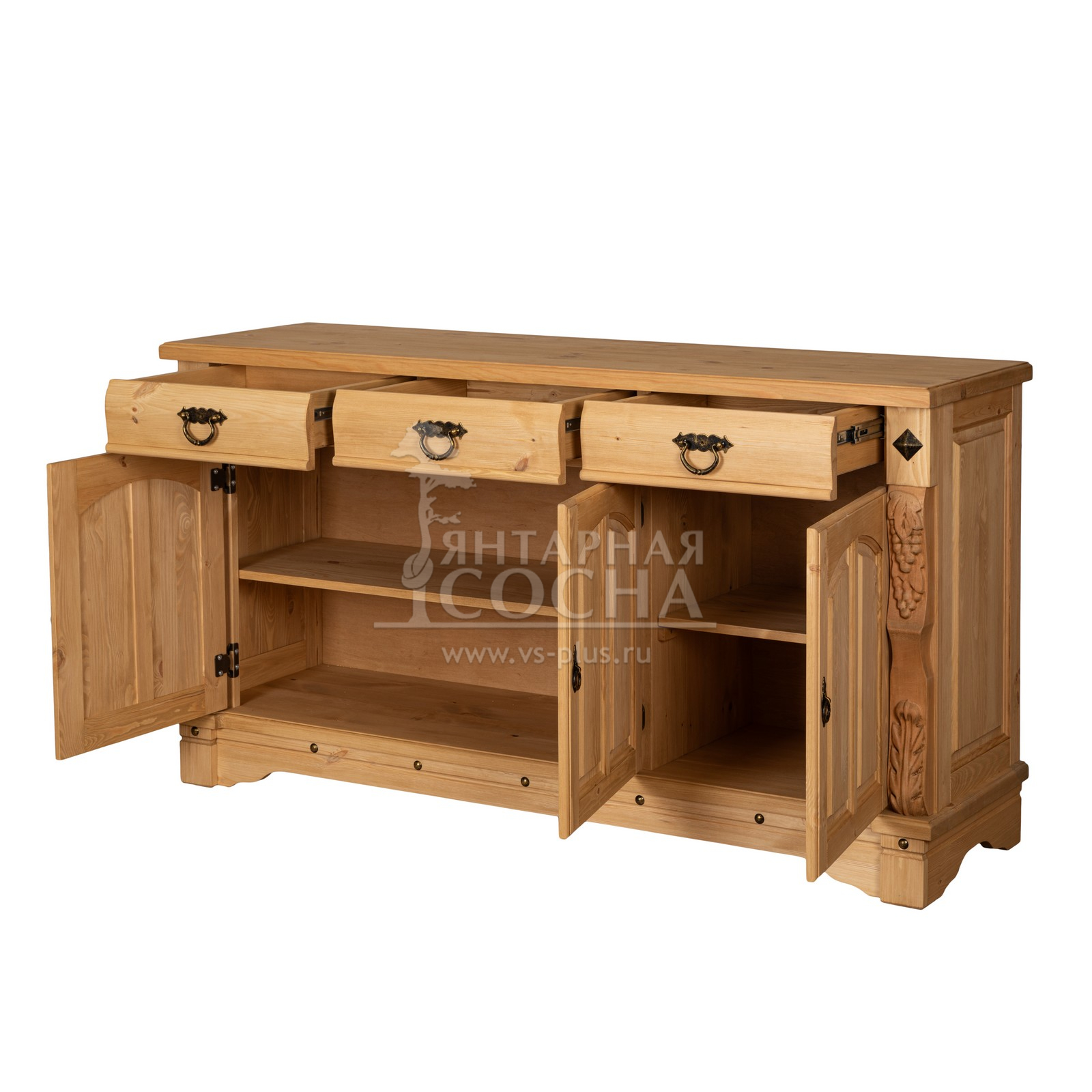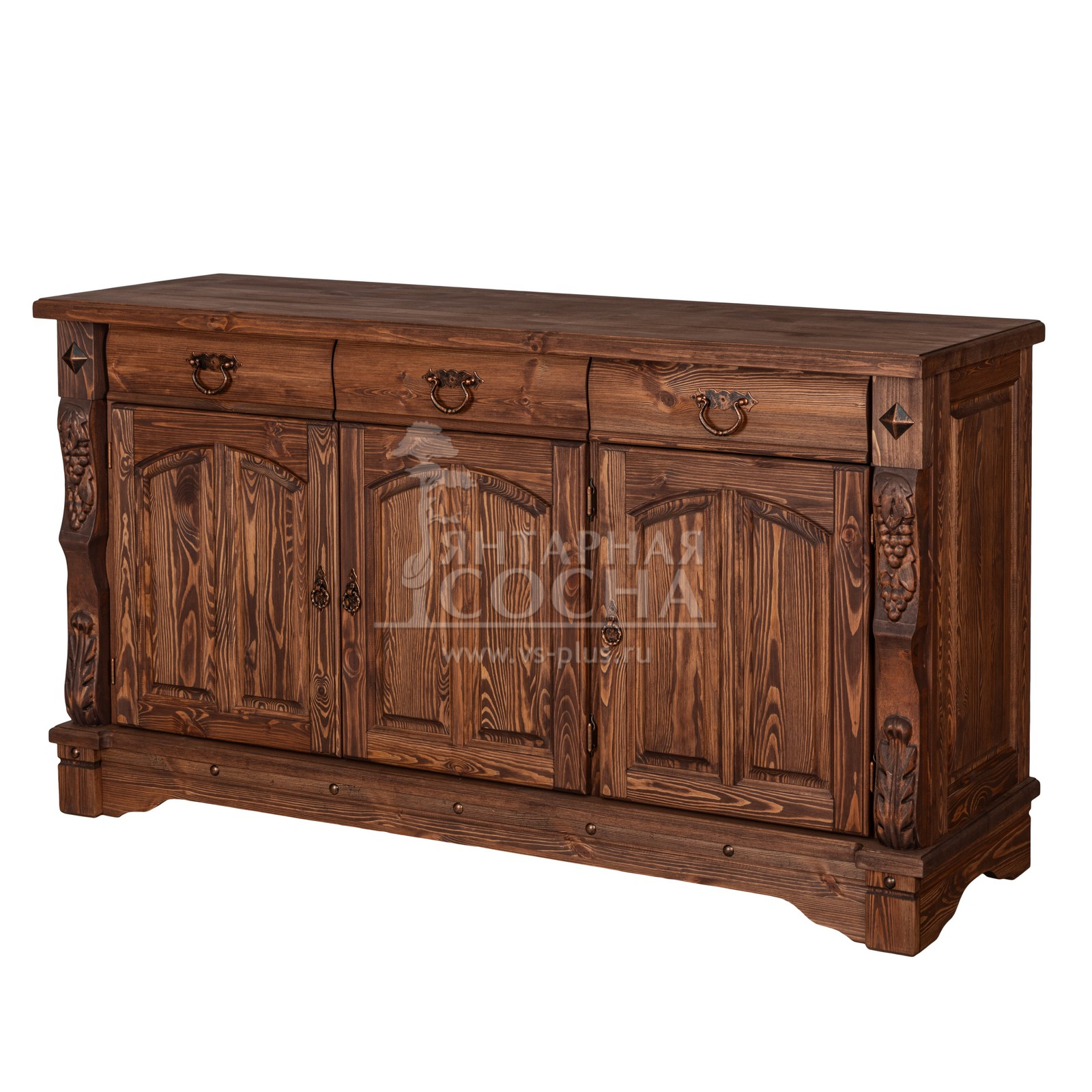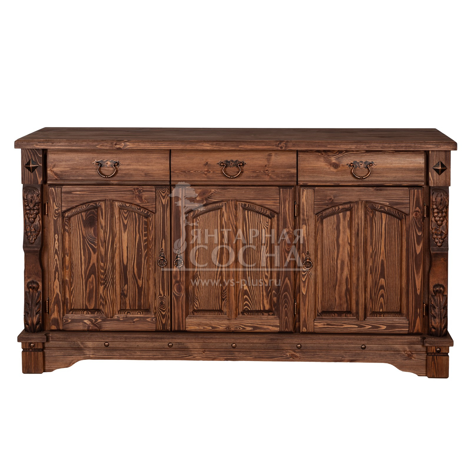 Трехдверный комод Викинг gl из массива сосны в белом цвете - особое украшение его служит резные элементы с гроздьями винограда. Подчеркнет аутентичный стиль загородного дома. Используется на кухне или в столовой для хранения посуды и необходимых вещей. Благодаря компактным габаритам легко впишется в небольшое помещение.