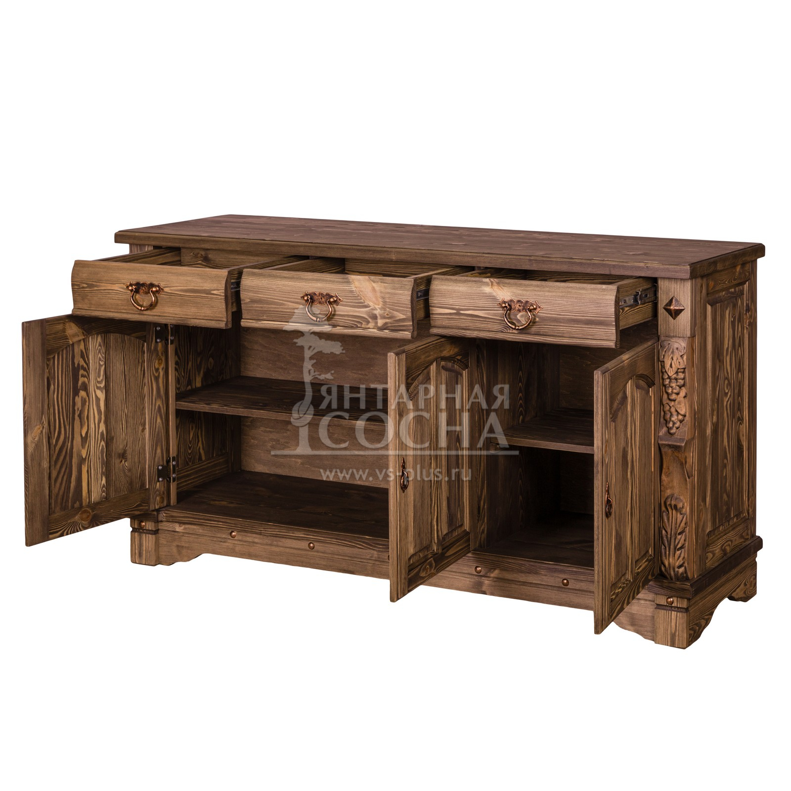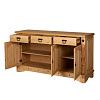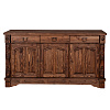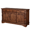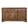 Модель оборудована 3 выдвижными ящиками на направляющих шариковых и нишами с полками. Оборудована незамысловатой надежной кованой фурнитурой. Отделка поверхности выполнена с помощью воска. Оригинальный дизайн предмета мебели создан с помощью специально созданных потертостей, следов древоточцев, изящных резных элементов и вставок на фасадах.