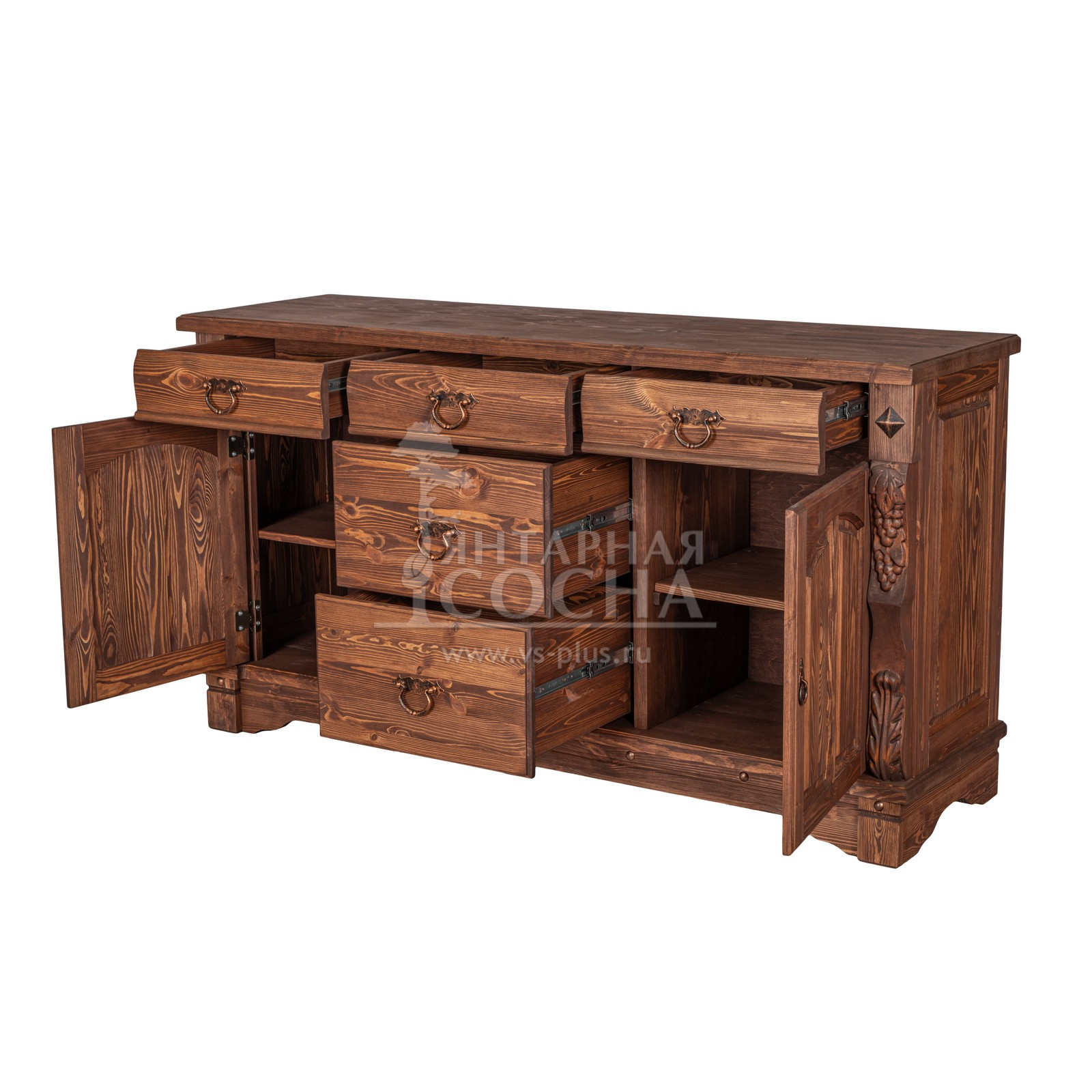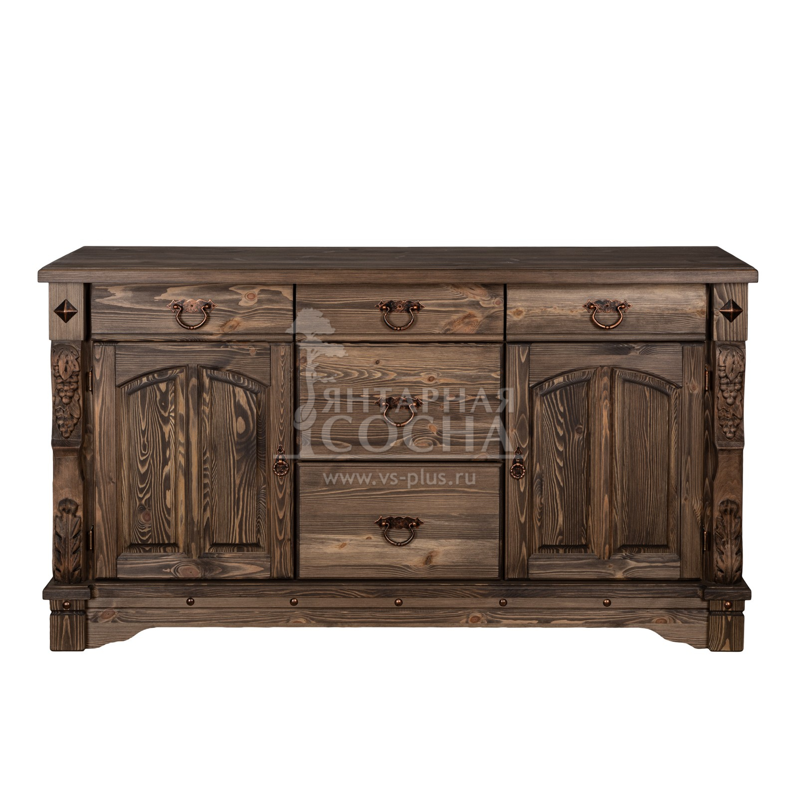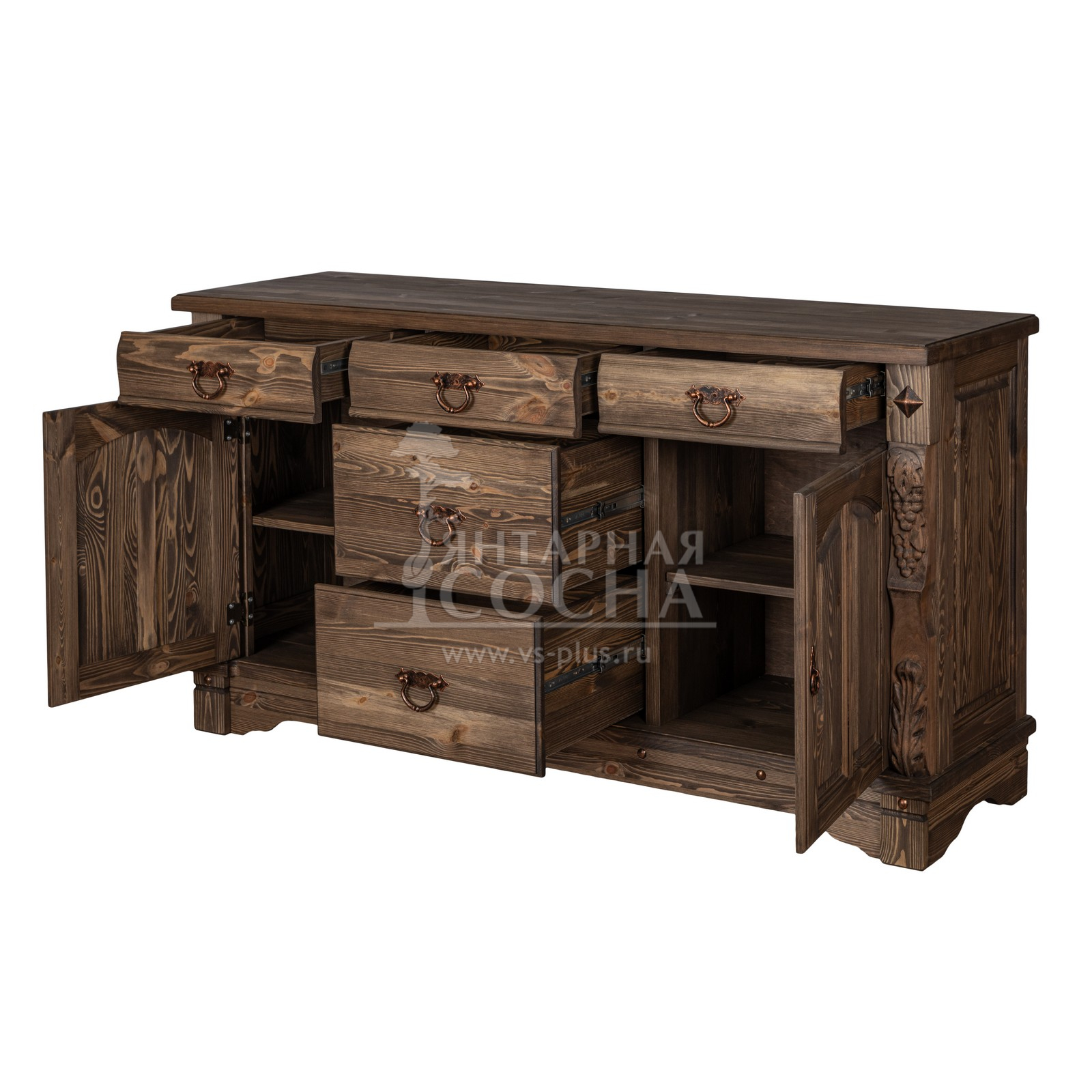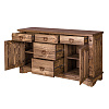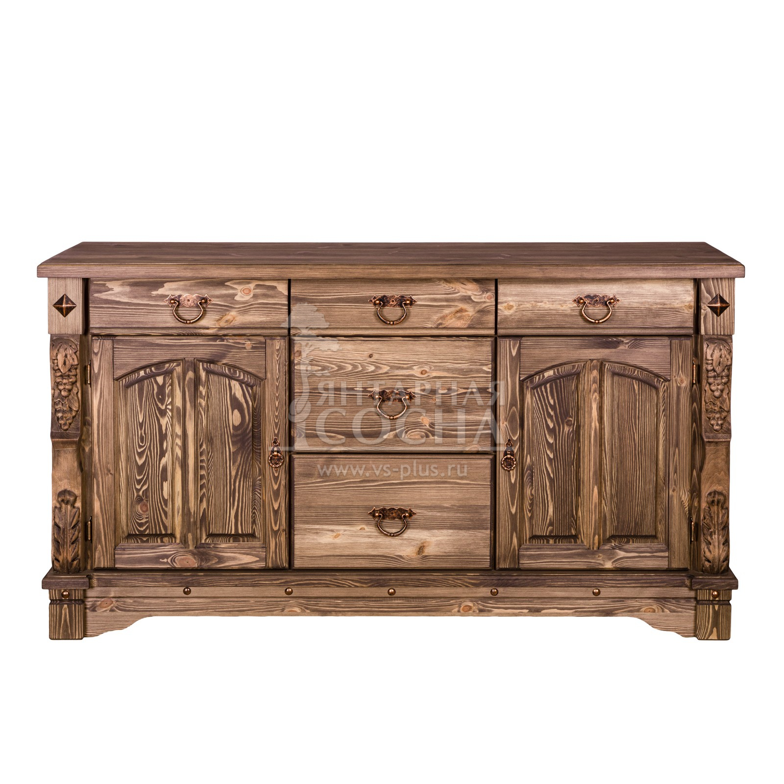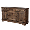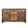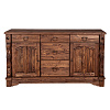 Модель оборудована 5ю выдвижными ящиками на направляющих шариковых и нишами с полками. Оборудована незамысловатой надежной кованой фурнитурой. Отделка поверхности выполнена с помощью воска. Оригинальный дизайн предмета мебели создан с помощью специально созданных потертостей, следов древоточцев, изящных резных элементов и вставок на фасадах.