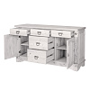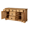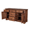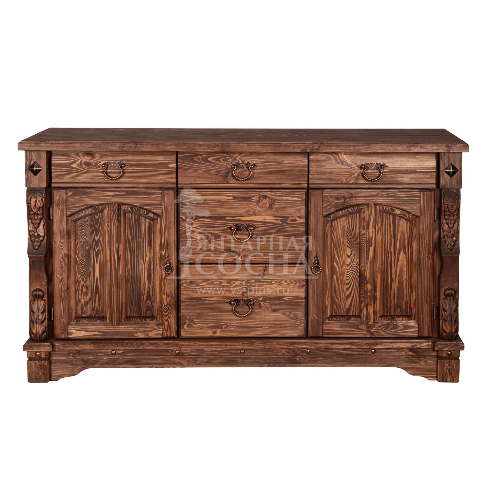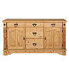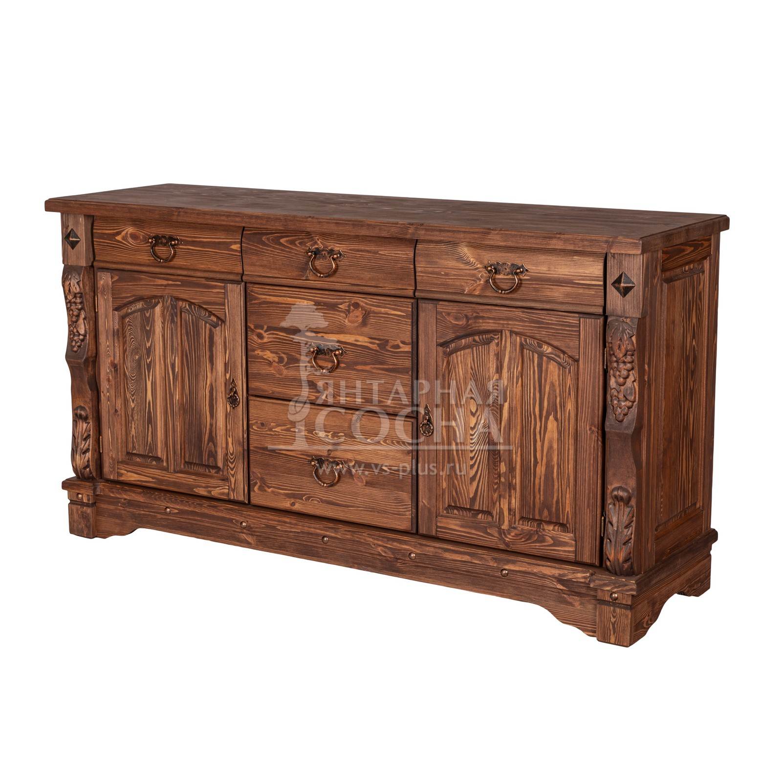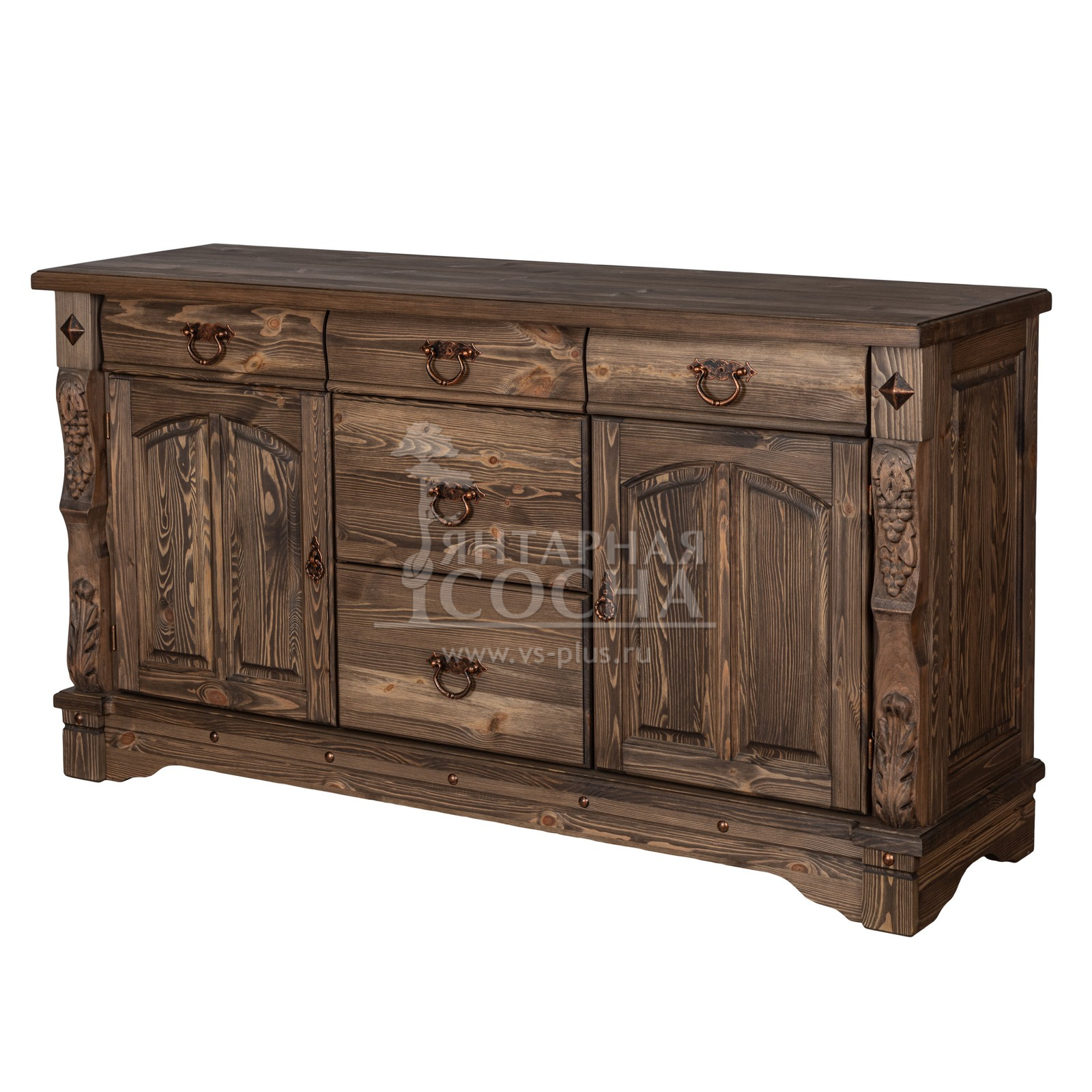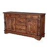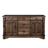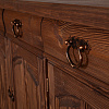 Модель оборудована 5ю выдвижными ящиками на направляющих шариковых и нишами с полками. Оборудована незамысловатой надежной кованой фурнитурой. Отделка поверхности выполнена с помощью воска. Оригинальный дизайн предмета мебели создан с помощью специально созданных потертостей, следов древоточцев, изящных резных элементов и вставок на фасадах.