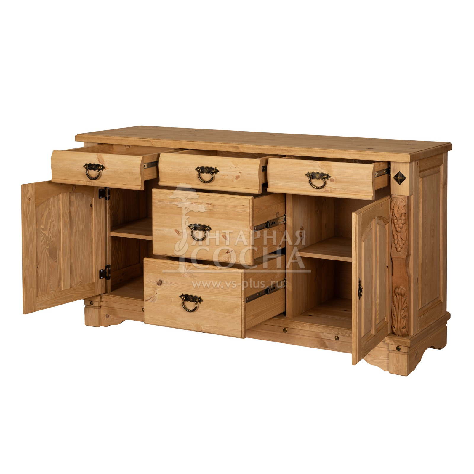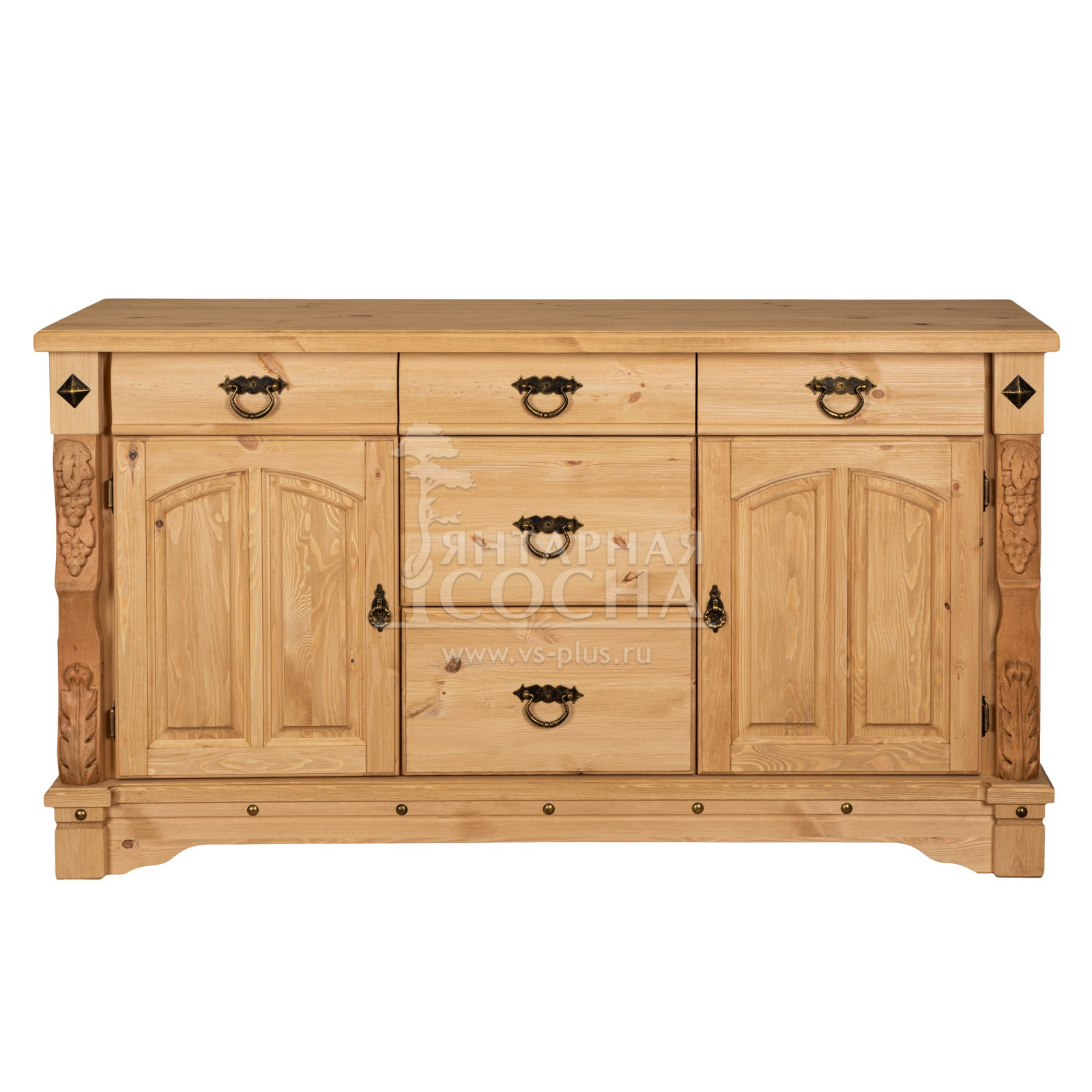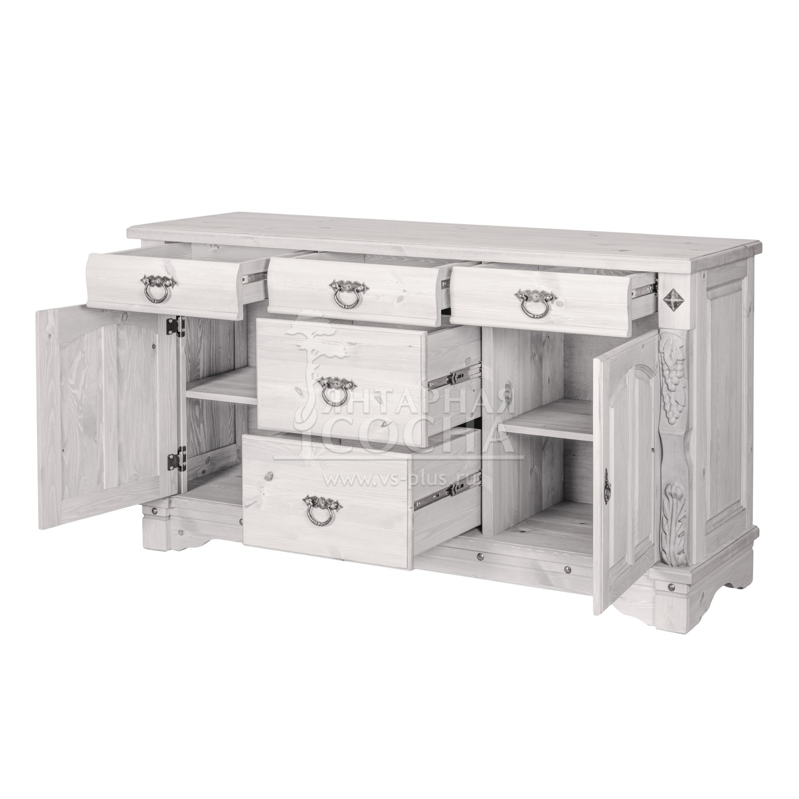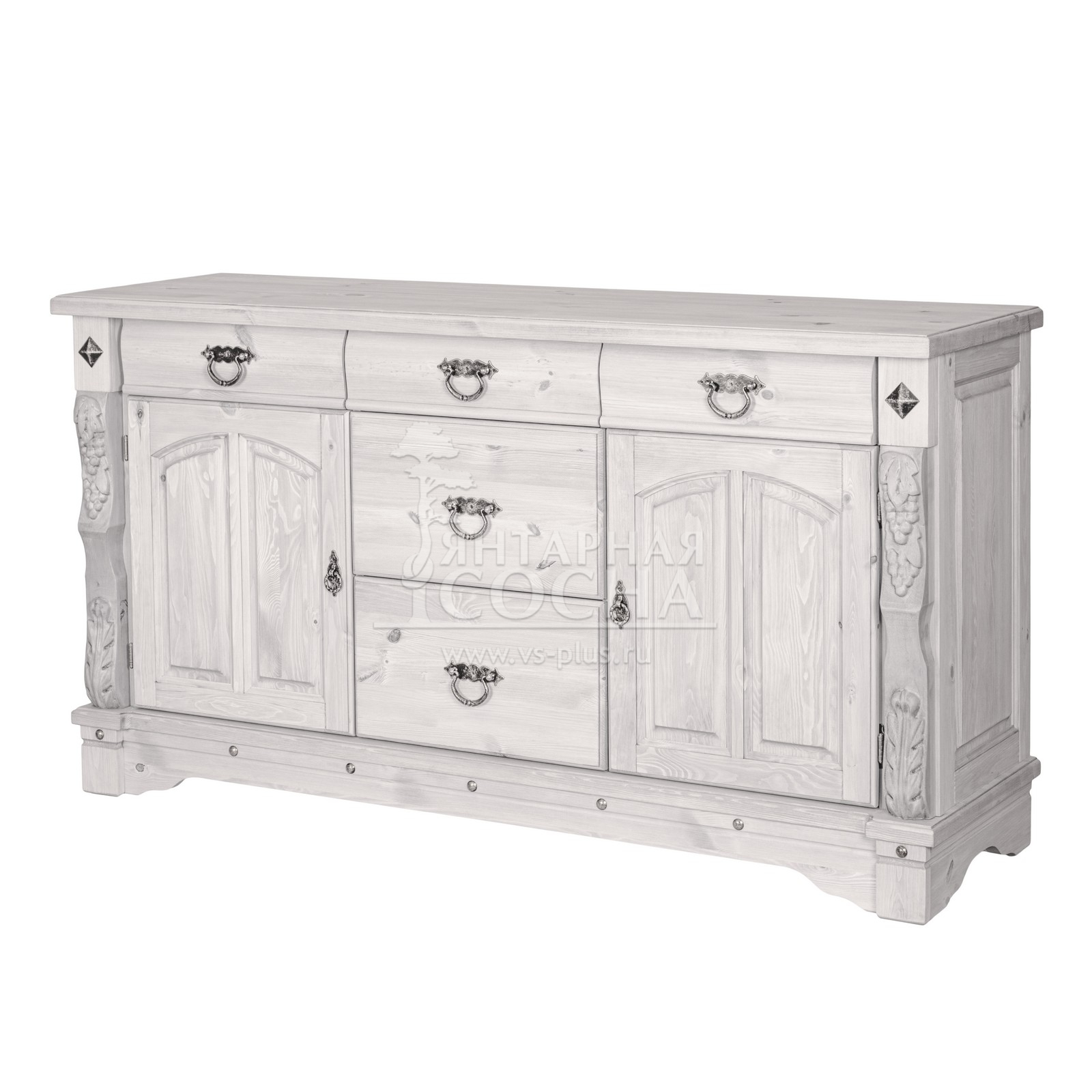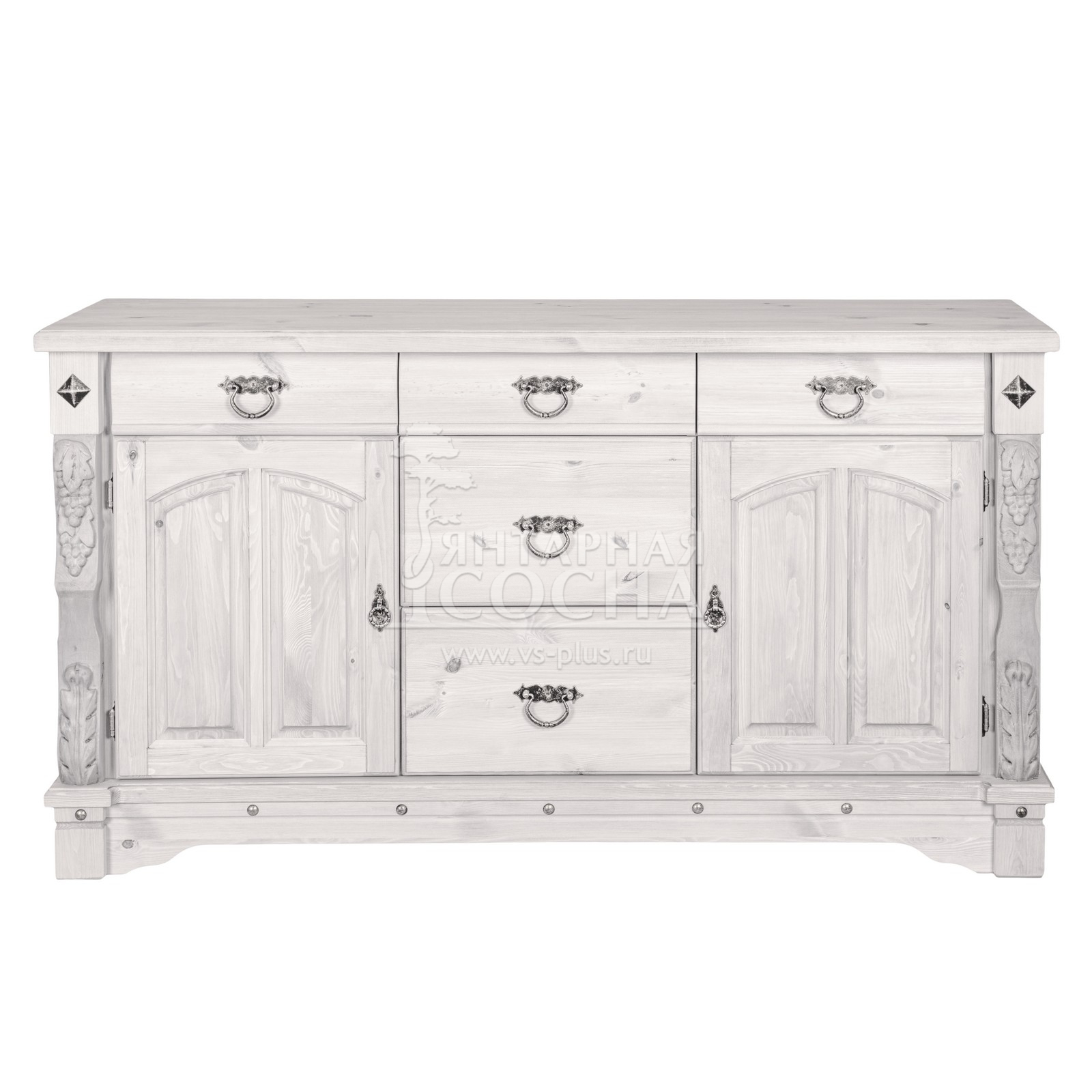Трехдверный комод Викинг gl из массива сосны в белом цвете - особое украшение его служит резные элементы с гроздьями винограда. Подчеркнет аутентичный стиль загородного дома. Используется на кухне или в столовой для хранения посуды и необходимых вещей. Благодаря компактным габаритам легко впишется в небольшое помещение.