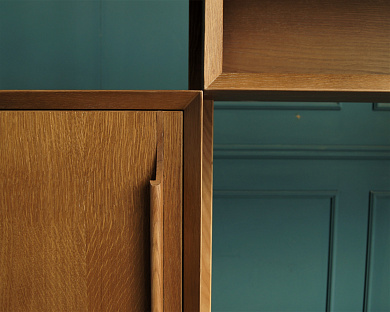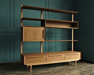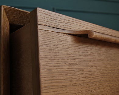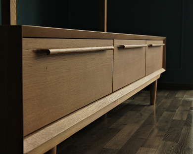 Консоль "Bruni" изготавливается вручную из шпона ясеня, платформа, ножки и ручки вырезаются из массива ясеня. Ящики на доводчиках из березовой фанеры. Изделие покрывается итальянскими лаками и морилками Sayerlack.