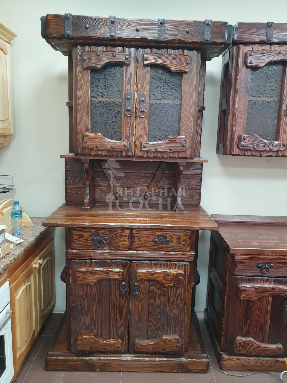 Кухня «Государь 1» — компактный и функциональный комплект из массива сосны с выразительными элементами ковки. Подходит для квартиры, загородного дома или дачи, где ценится натуральное дерево и продуманная конструкция.