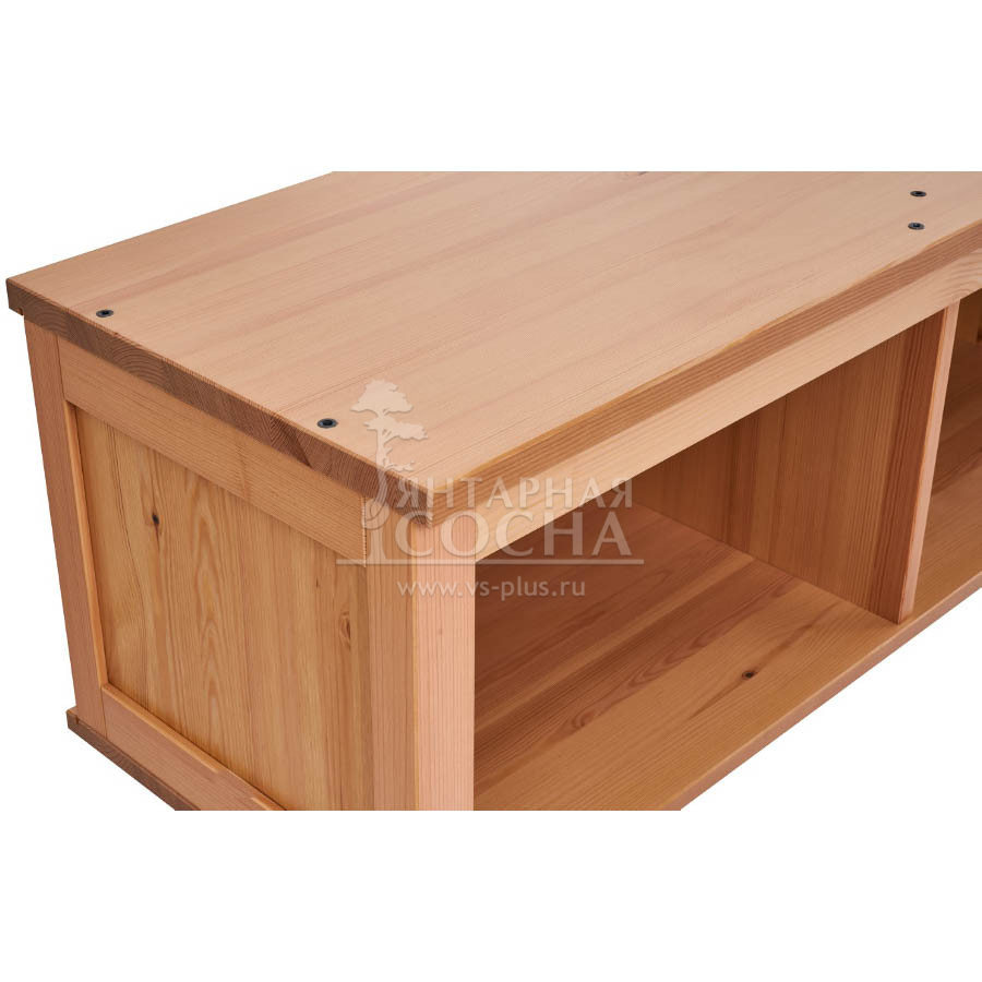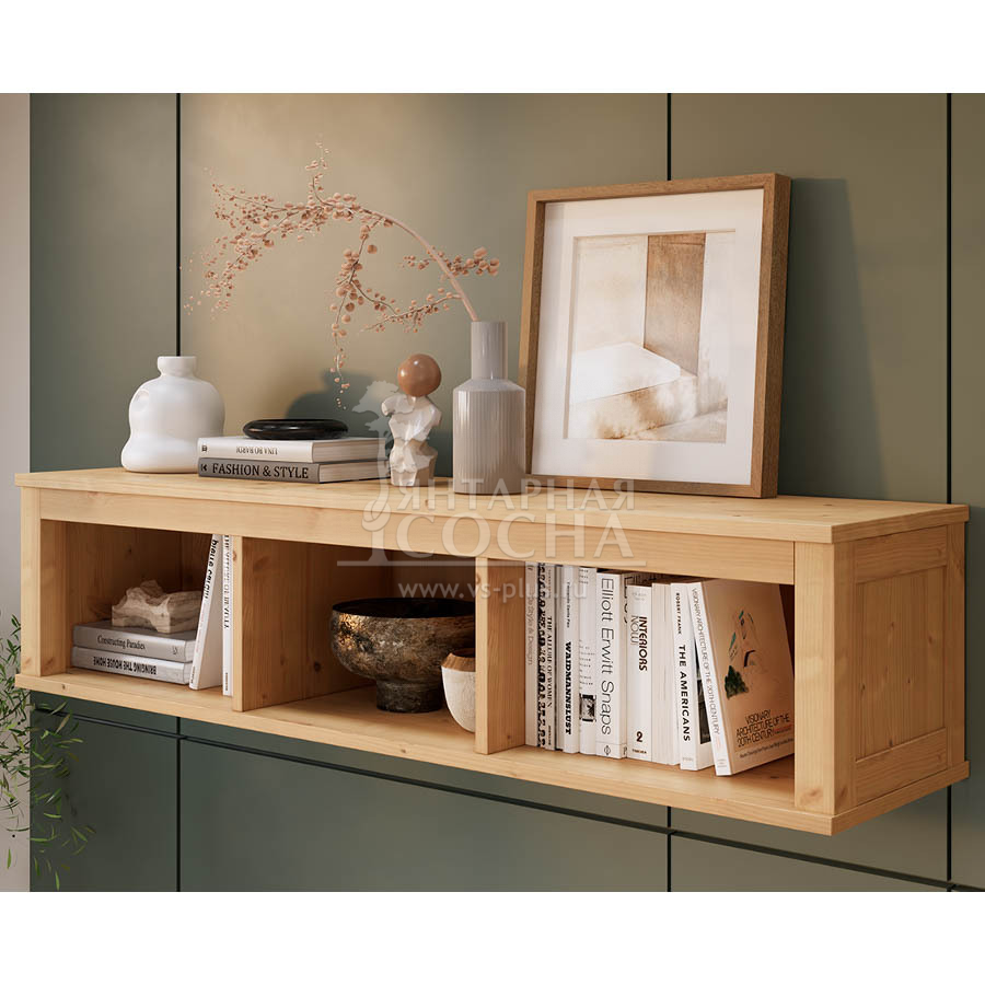 Полка выполнена из массива сосны, что придаёт изделию прочность, долговечность и естественную текстуру дерева. Благодаря лаконичному дизайну она легко вписывается в интерьер гостиной, спальни, детской комнаты или кабинета.