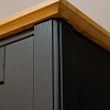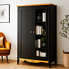 Корпус и фасады изготовлены из массива сосны. Задняя стенка шкафа выполнена из неокрашенной ДВП. Шкаф имеет две секции, в каждой из которых есть по 3 съемные полки. Левая секция с остекленной дверцей, а правая с глухой дверцей. Дверные петли марки Hettich оборудованы доводчиками для плавного бесшумного закрывания. Высота от пола до края нижней планки 12 см, с уборкой под шкафом справится робот-пылесос.