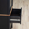 За остекленной дверцей расположены три полки из массива сосны, которые можно переставлять по высоте. Дверные петли фирмы Hettich оснащены доводчиками для плавного закрывания. Выдвижные ящики монтируются на шариковых направляющих частичного выдвижения, без доводчиков.