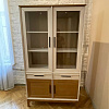Шкаф стоит на устойчивом основании с высокими крепкими ножками. Его не нужно сдвигать во время уборки, между ножками и полом остается достаточно пространства. Две верхние дверцы с остеклением, за каждой – отделение с 2 полками. За глухими нижними дверцами также 2 отделения, каждое с двумя полками. На дверцах и ящиках чёрные профильные ручки.