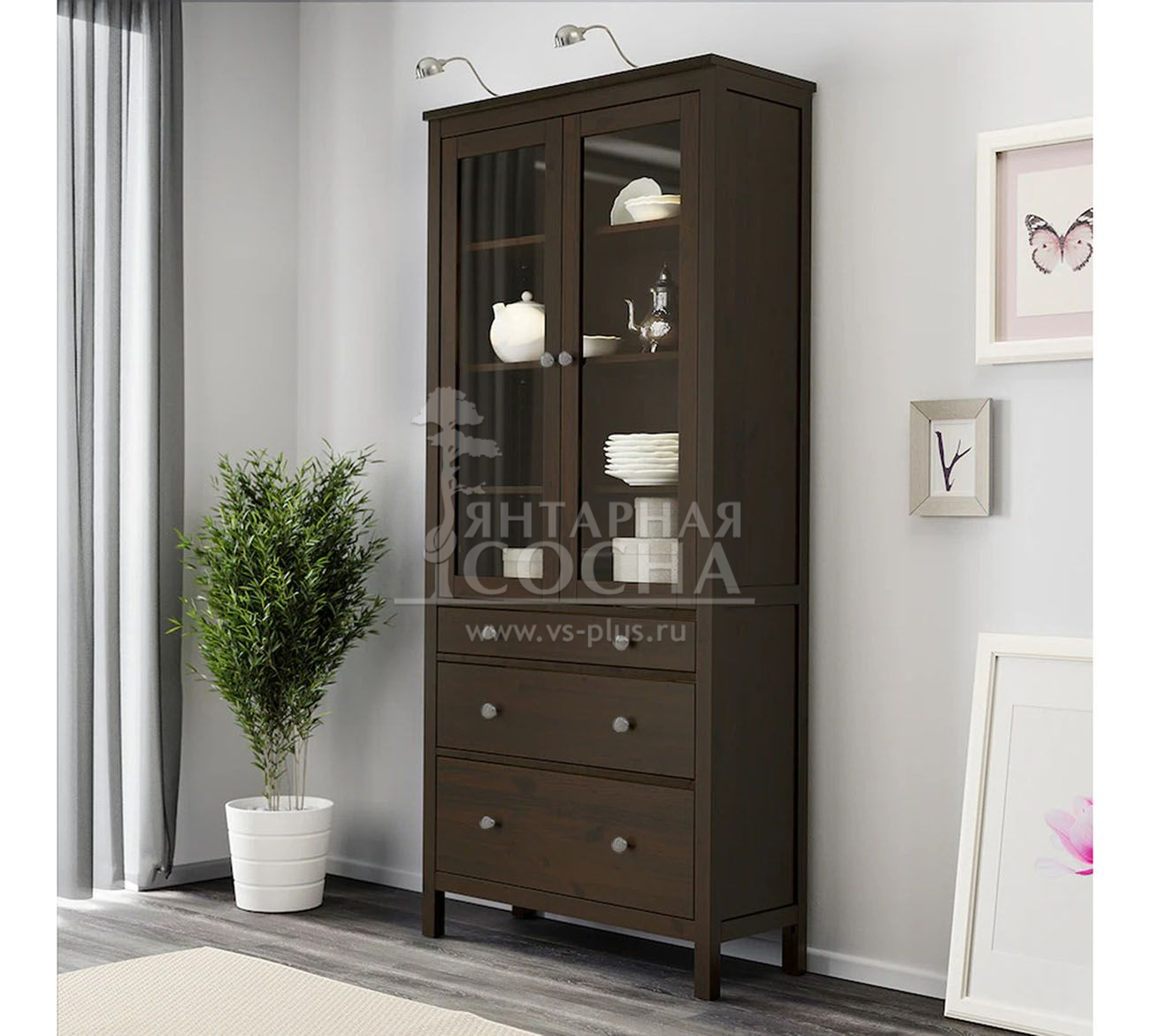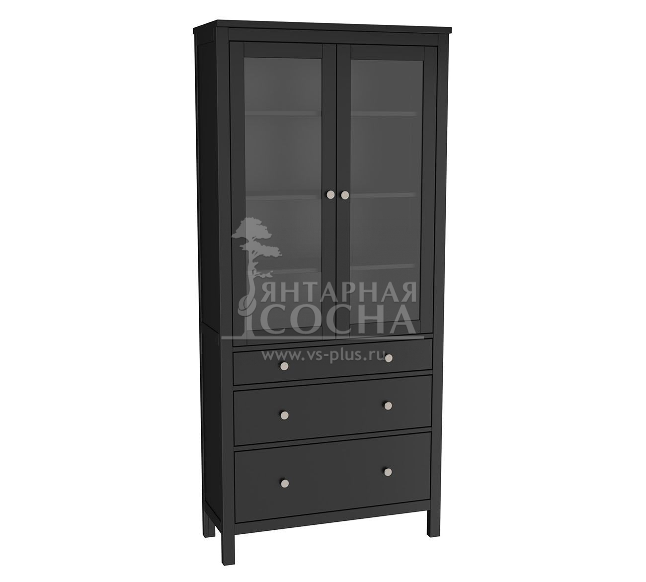 Представляем шкаф для посуды «Кантри» 23 из массива сосны и стекла. Представляет собой высокий шкаф с двумя распашными дверьми со стеклом и тремя выдвижными ящиками.