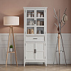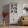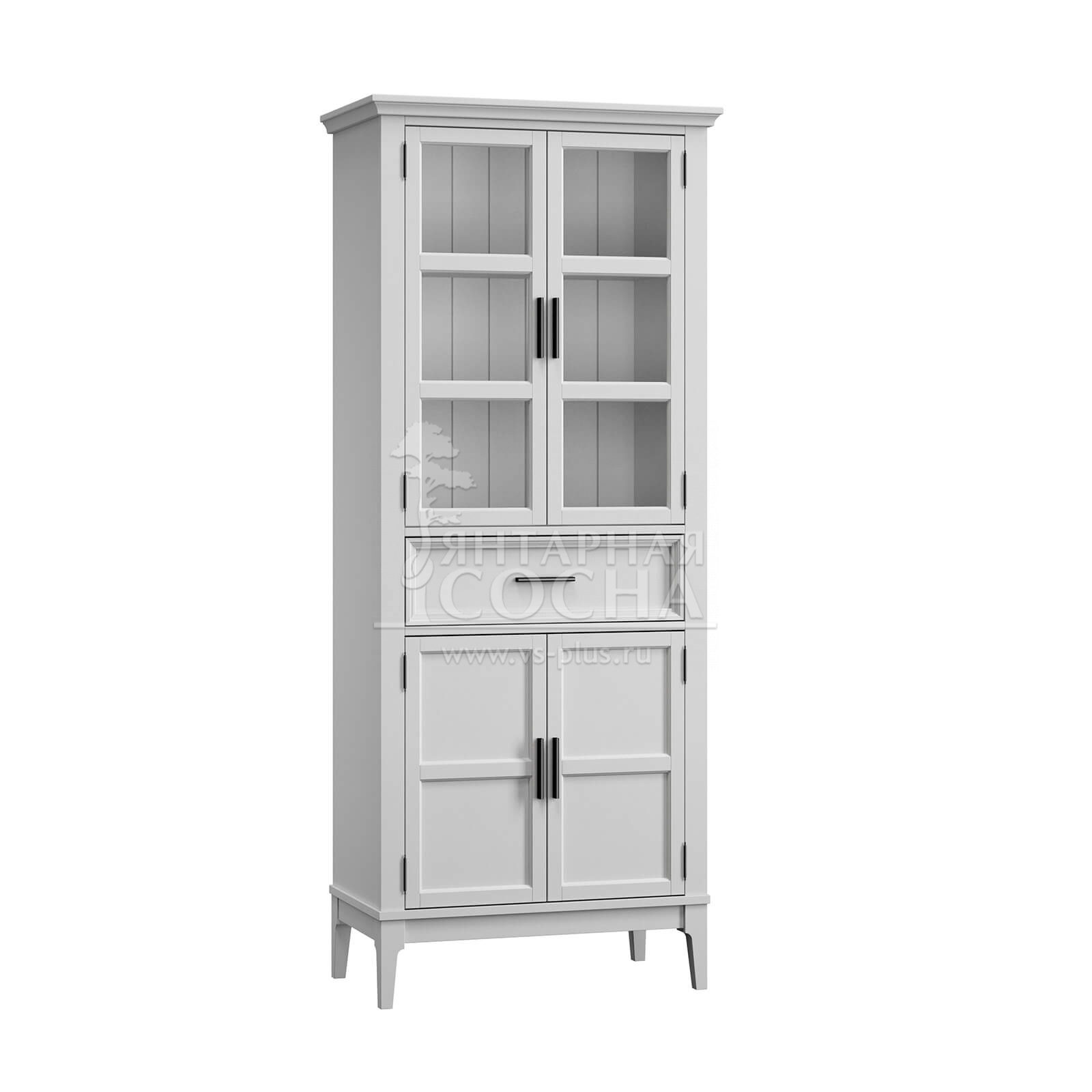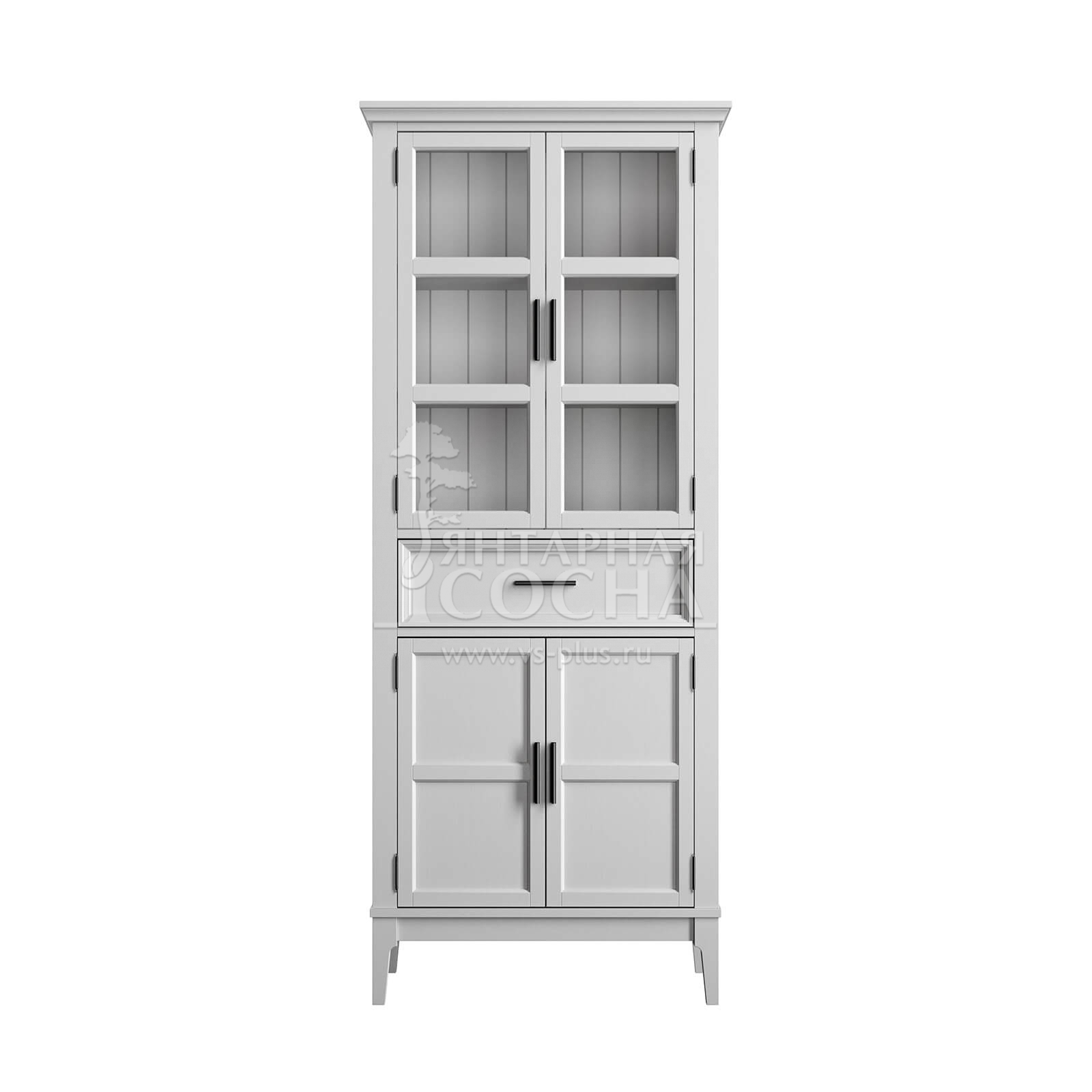 Выразительный дизайн: комбинация стеклянных и филёнчатых дверей создаёт интересный визуальный эффект — верхние секции с прозрачными дверцами идеально подходят для демонстрации праздничной посуды, а нижние глухие дверцы скрывают повседневные предметы, сохраняя порядок в интерьере.