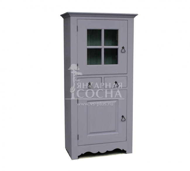 Верхняя часть оснащена стеклянной дверцей, за которой расположена одна сплошная полка — отличное место для красивой посуды, сервизов или декоративных элементов. Нижняя секция закрыта глухими фасадами, что позволяет хранить менее декоративные предметы.
