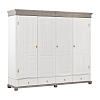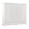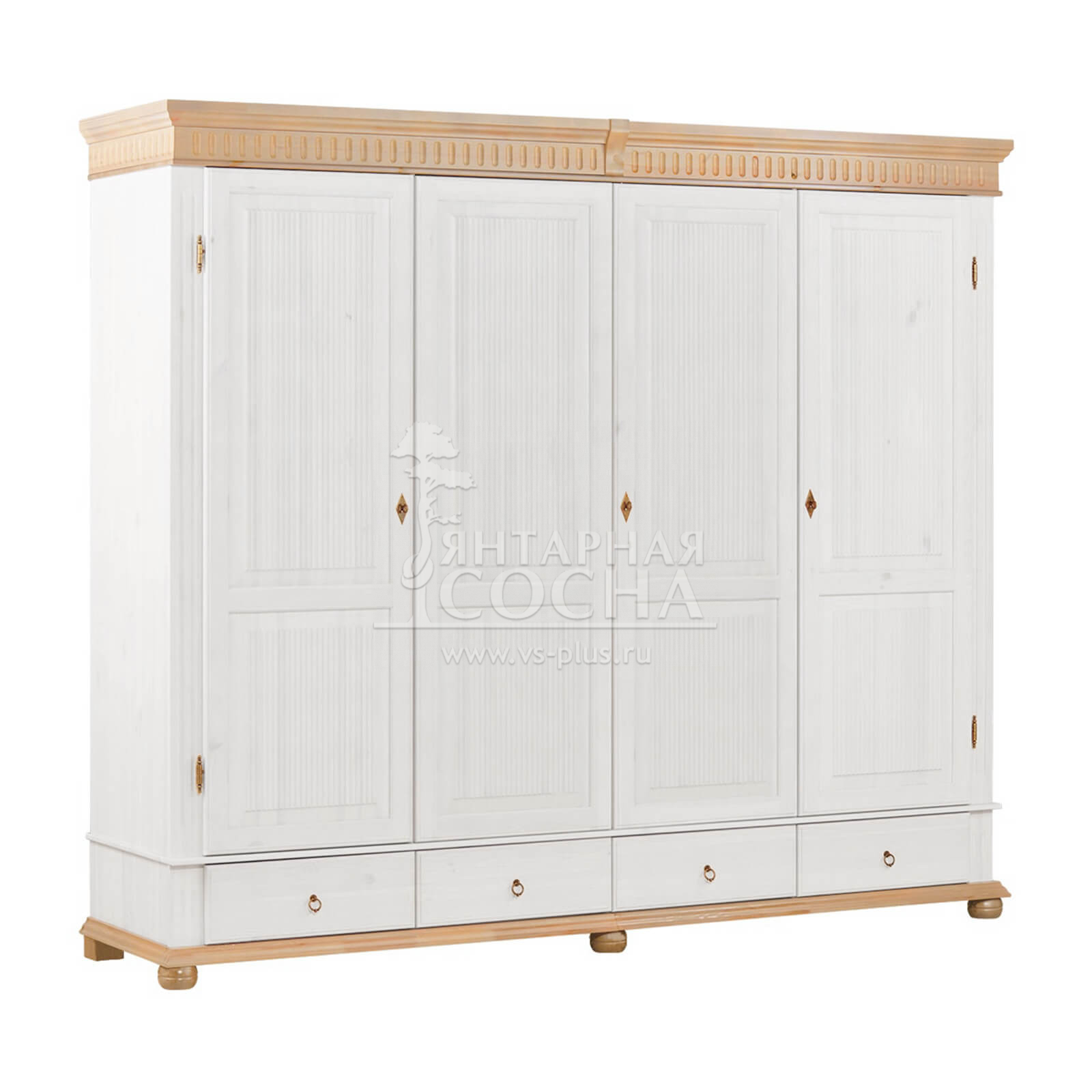 Внушительный шкаф из массива сосны “Хельсинки 4 GTM” - это полноценный гардероб, в котором поместится все, что нужно современному человеку. За четырьмя распашными дверями вы найдете 2 отделения на 4 полки каждая и место для хранения одежды со штангой. Вверху также имеется пространство для головных уборов, снизу расположены выдвижные ящики.