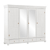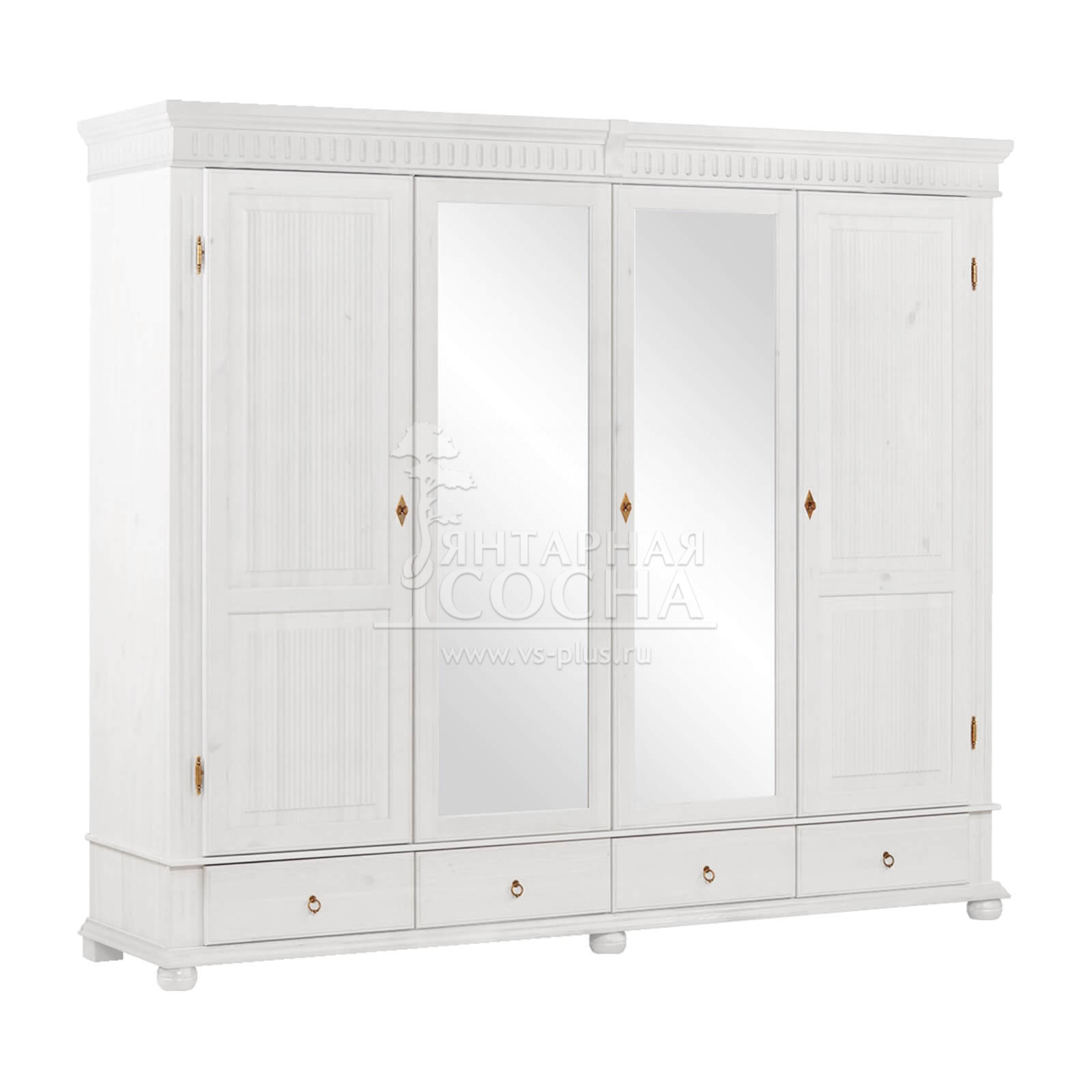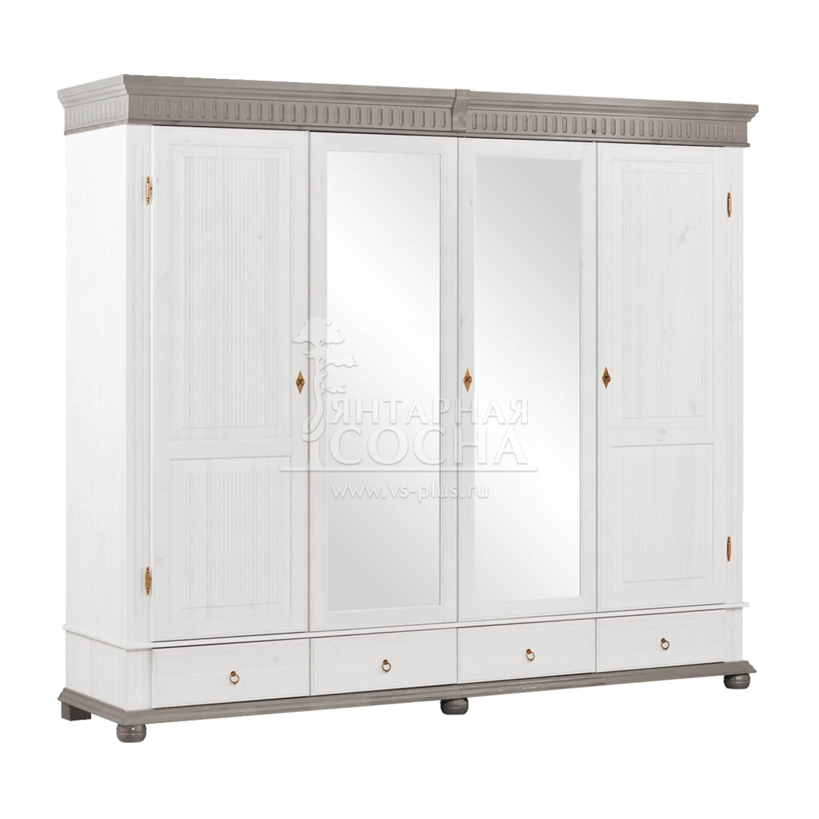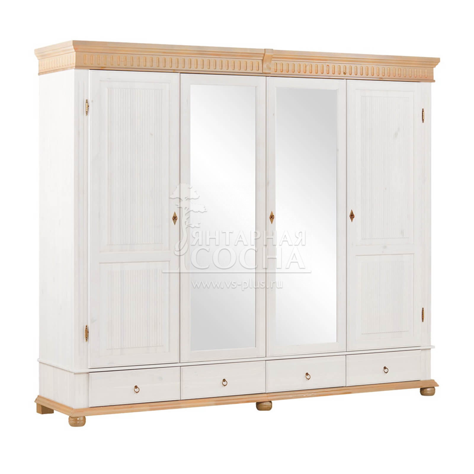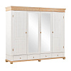 Высота шкафа 218 см. Четыре выдвижных ящика на металлических направляющих. Левое и правое одиночные отделения с полками (по 3 полки в каждом шкафу). В центральном двойном отделении - одна полка + одна штанга для одежды. Центральные двери зеркальные. Задняя стенка шкафа - вагонка. Деревянные двери с двойной филенкой. Шкаф "Хельсинки-4-SP-GT-M" изготовлен из массива сосны, самого экологичного, надежного и долговечного природного материала, обработан безвредным лаком и оснащен качественной фурнитурой.