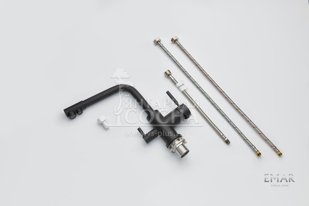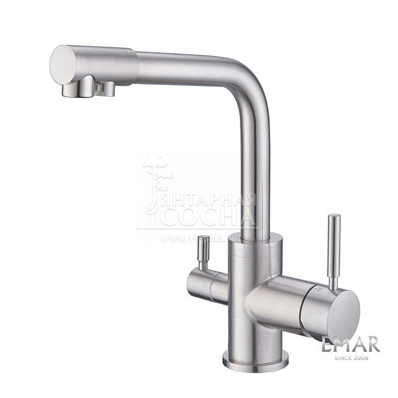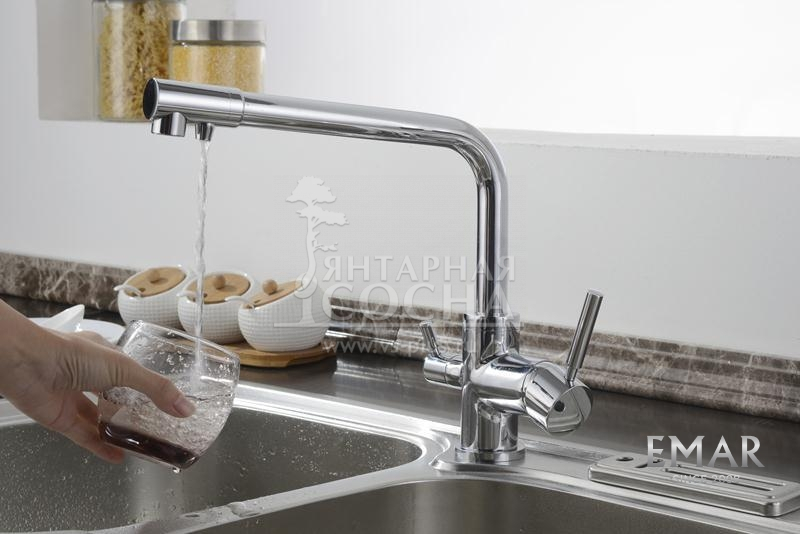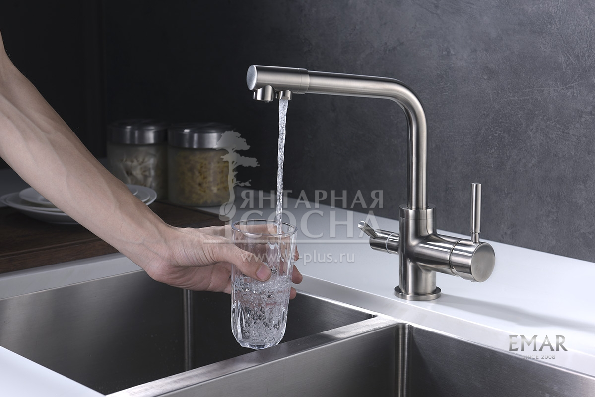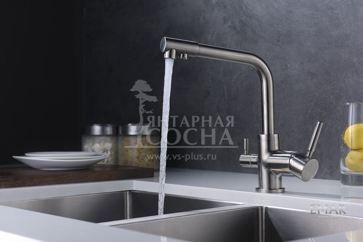 Кухонный смеситель с возможностью подключения фильтра для очистки воды. Фильтрованная вода подаётся через отдельную ручку и отдельную внутреннюю трубку, не смешиваясь с водопроводной водой — удобно и безопасно для ежедневного использования.