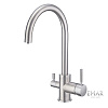 отдельный рычаг для подачи проточной воды и отдельный рычаг для подачи питьевой воды. Эргономичная форма рукояток обеспечивает плавную и точную регулировку напора. Смеситель легко встраивается в кухонную мойку.