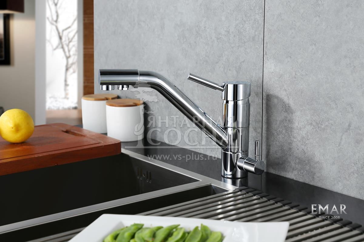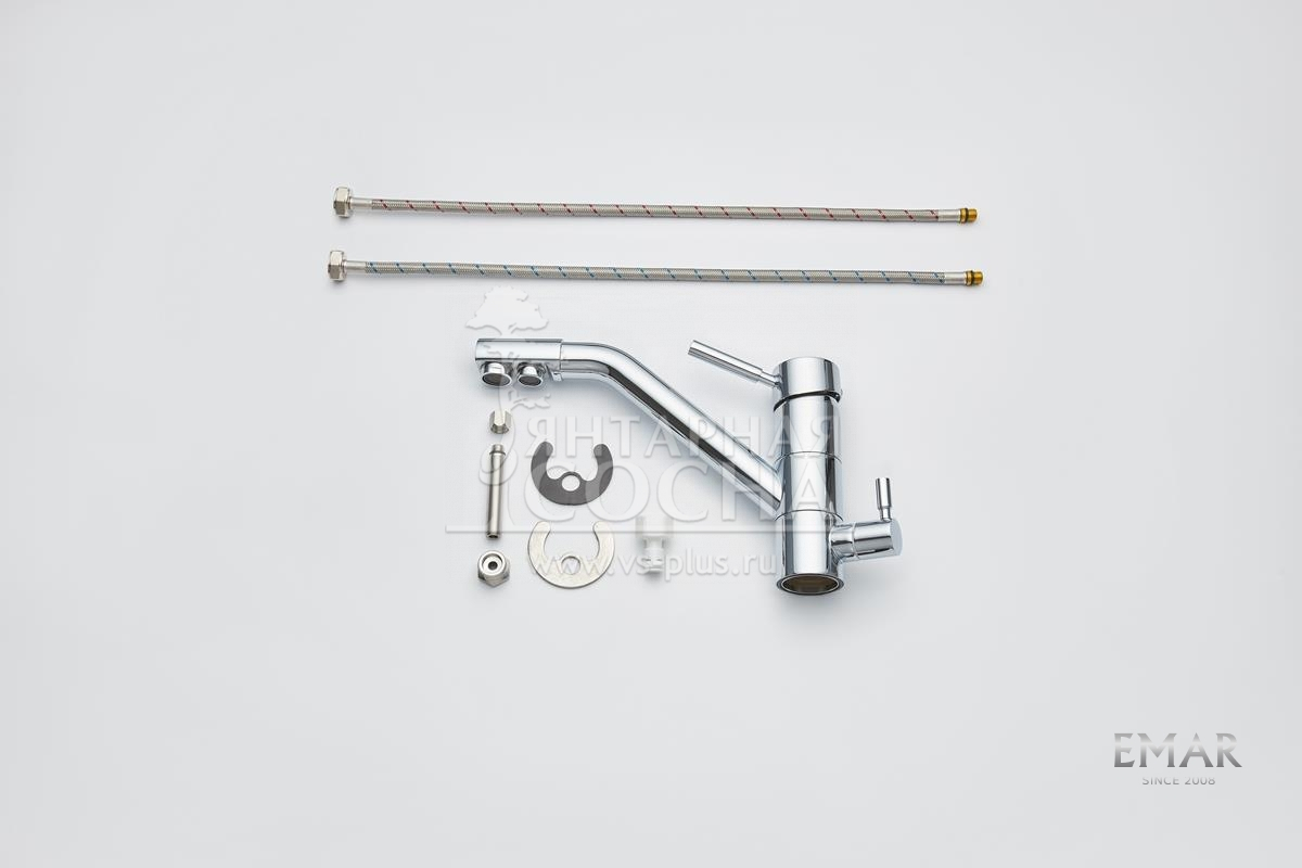 Кухонный смеситель с возможностью подключения фильтра для очистки воды. Фильтрованная вода подаётся через отдельную ручку и отдельную внутреннюю трубку, не смешиваясь с водопроводной водой — удобно и безопасно для ежедневного использования.