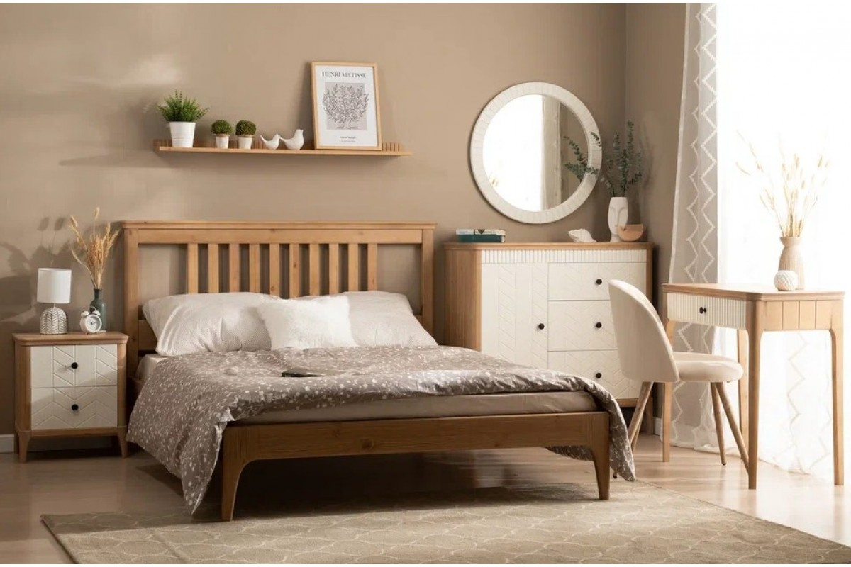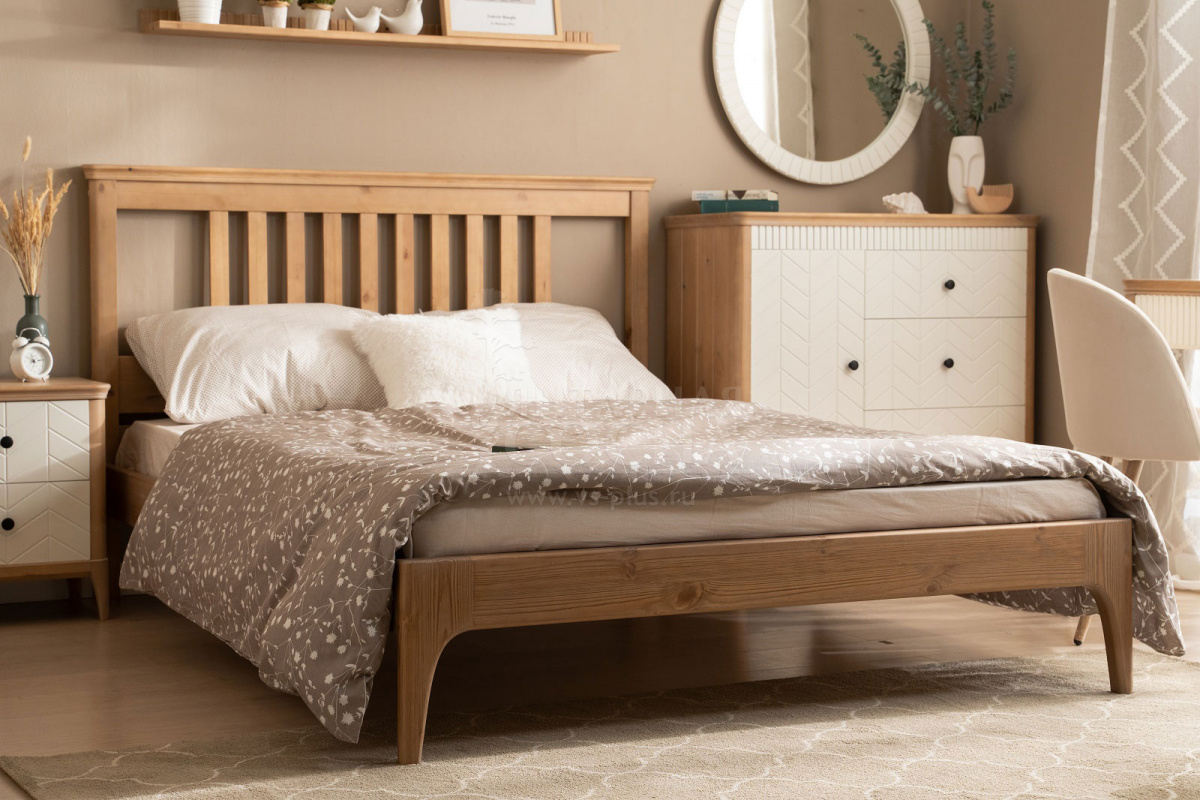 Набор мебели для спальни «Грета» выполнен из массива сосны и создаёт атмосферу спокойствия и уюта. Натуральное дерево с живой текстурой наполняет пространство теплом и делает интерьер мягким и гармоничным.