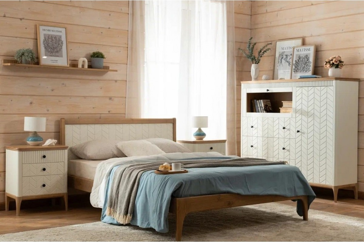 Набор мебели для спальни «Грета» выполнен из массива сосны и создаёт атмосферу спокойствия и уюта. Натуральное дерево с живой текстурой наполняет пространство теплом и делает интерьер мягким и гармоничным.