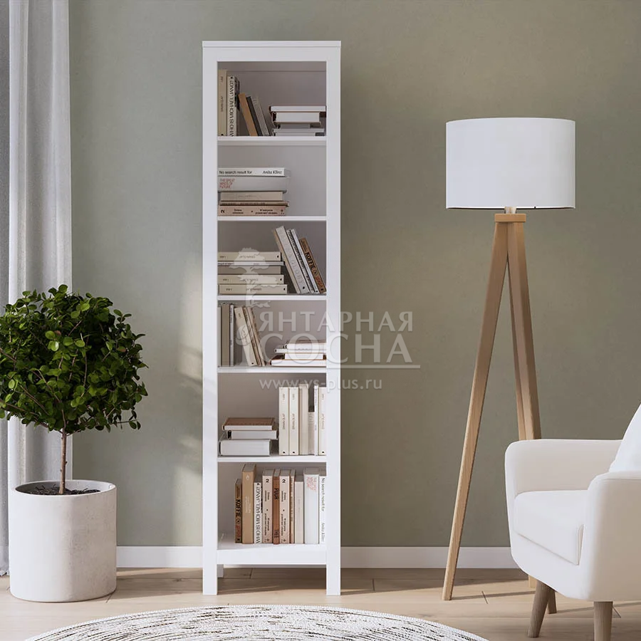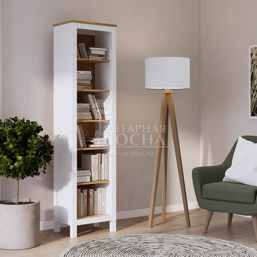 Стеллаж выполнен из массива сосны — натурального и прочного материала с выразительной текстурой дерева. Лаконичный дизайн позволяет легко вписать модель в интерьер гостиной, спальни, детской комнаты или домашнего кабинета.