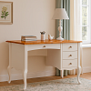 Стол представляет собой конструкцию с прочной столешницей из неокрашенной древесины и светлым основанием. С одной стороны находятся три вместительных выдвижных ящика, еще один располагается в центральной части. Оригинальная фурнитура придает изделию стильный внешний вид. Плавный изгиб высоких ножек делает стол визуально легким, что выгодно отличает его от стандартной массивной мебели. Такое изделие идеально подойдет для кабинета, библиотеки или гостиной, гармонично впишется в окружающую обстановку и придает ей оттенок сдержанного шика. Модель изготовлена из массива сосны, она абсолютно безопасна для здоровья и служит долгие годы.
